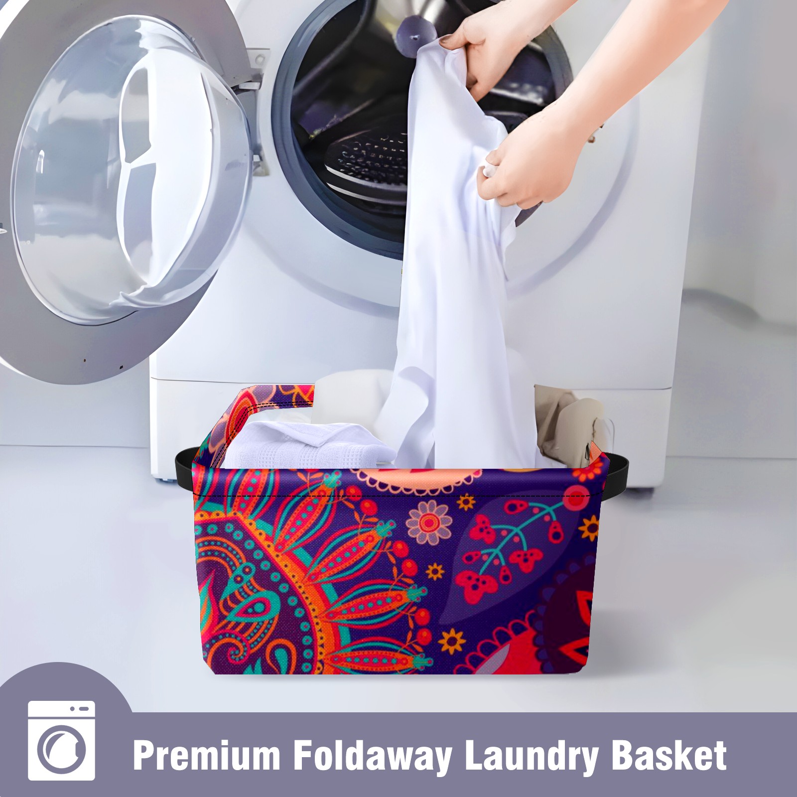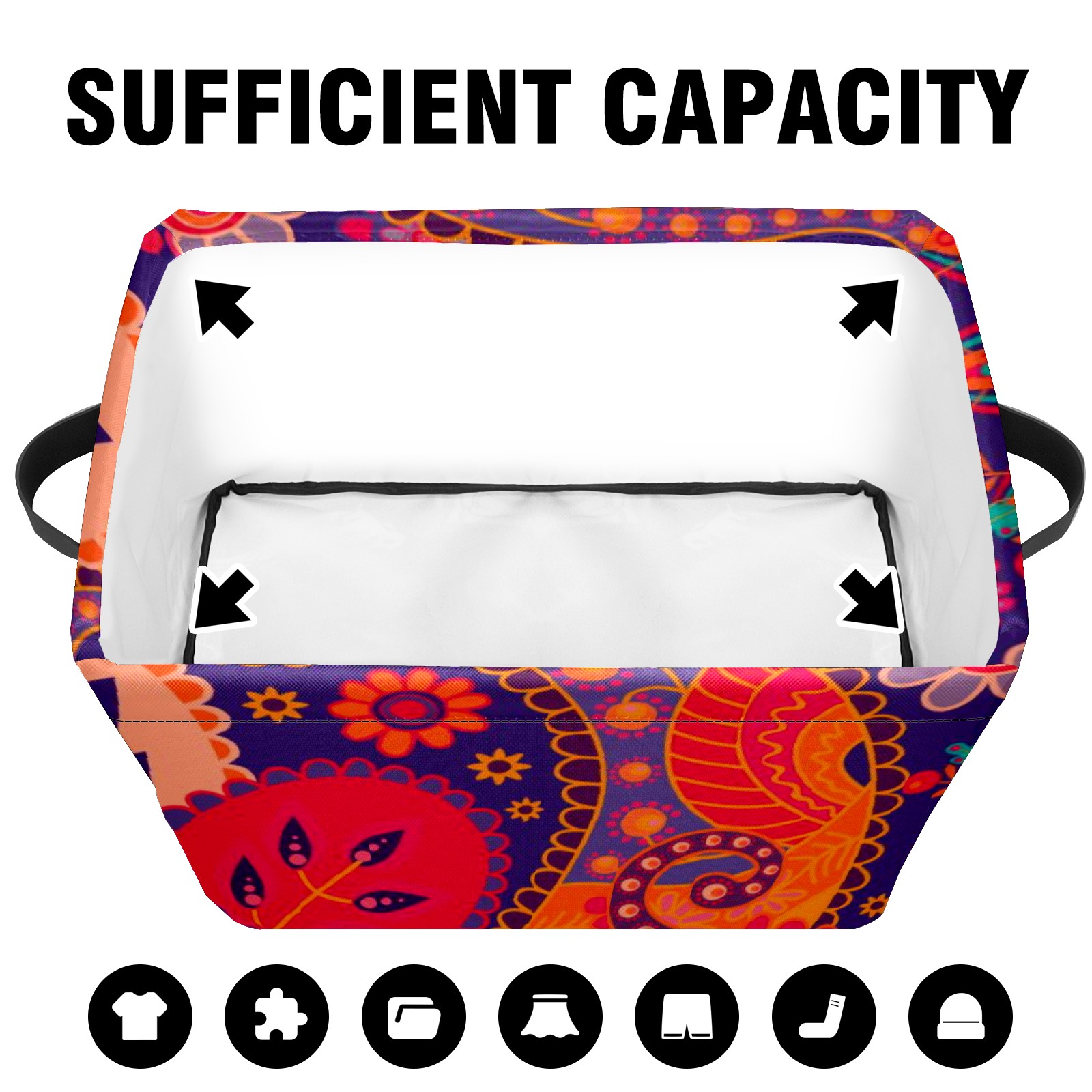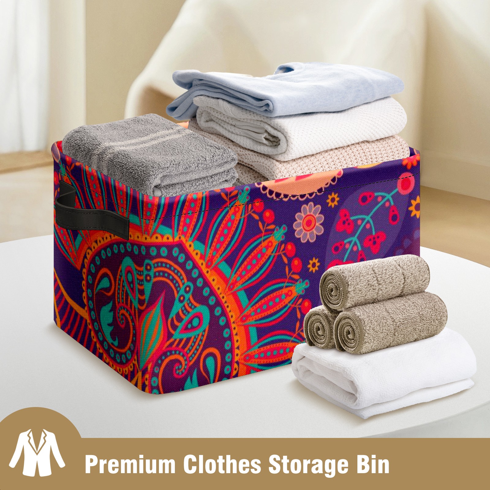 Collapsible 600D Oxford Storage Basket with Paisley Floral Colorful Ethnic Print - Metal Frame 10"x14"x8" Reinforced Handles, Multi-Purpose Organizer
