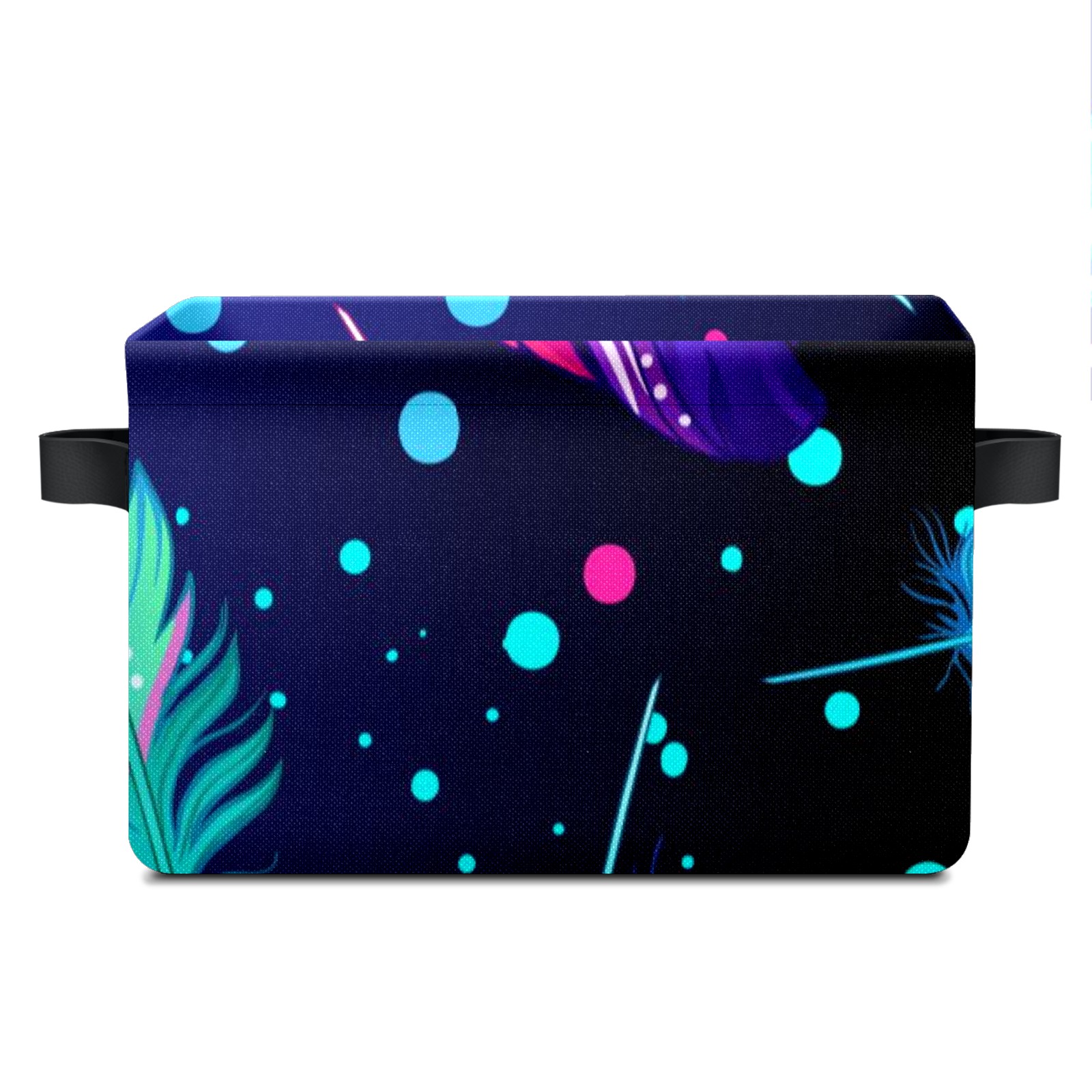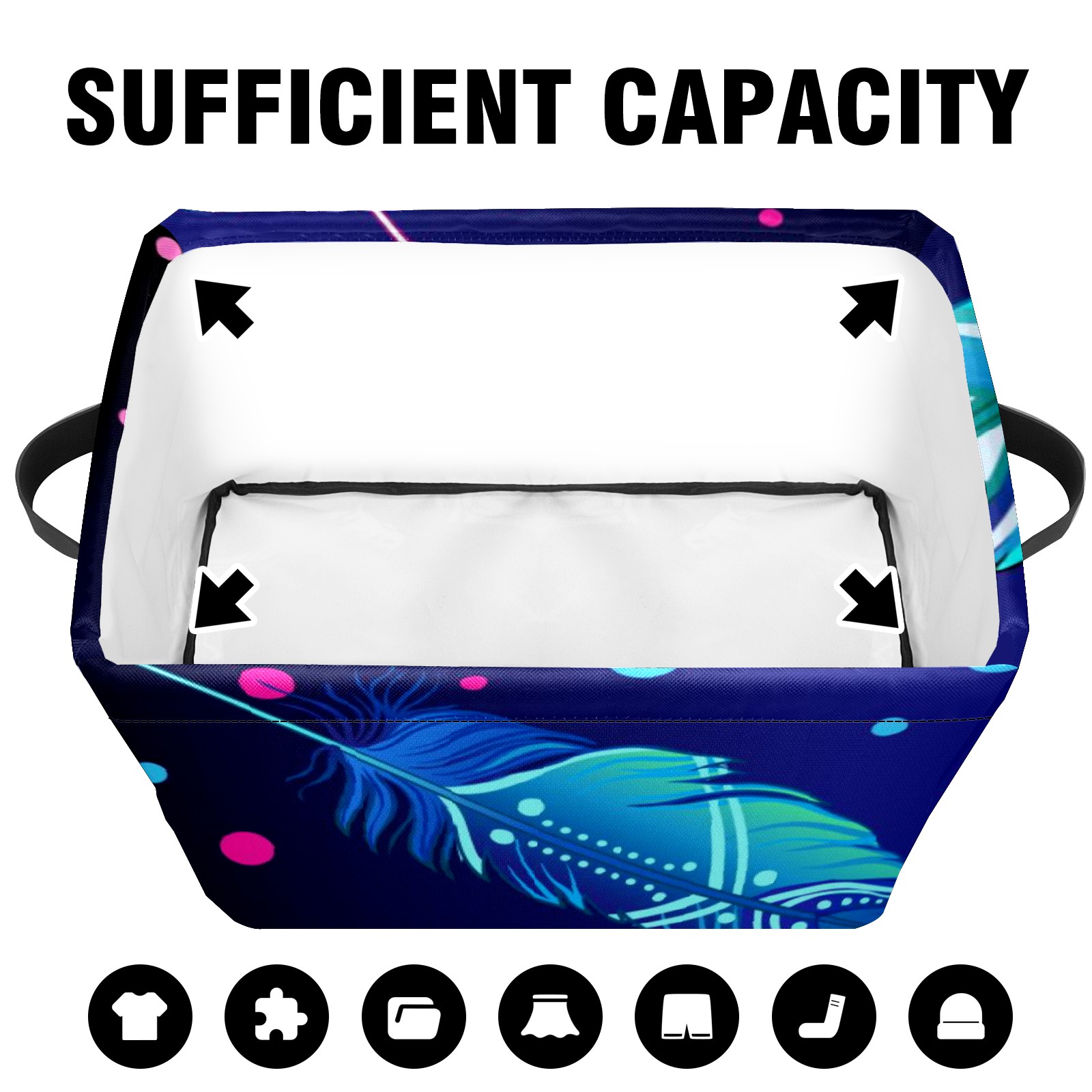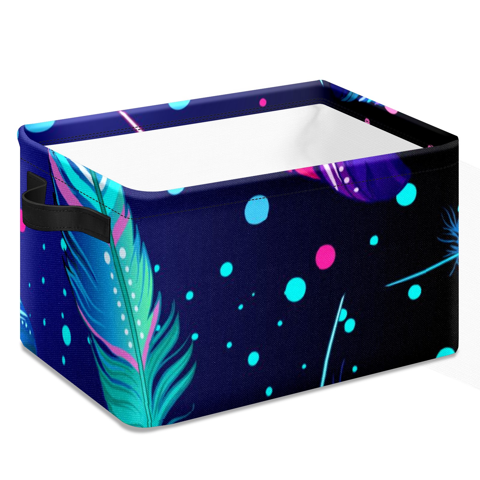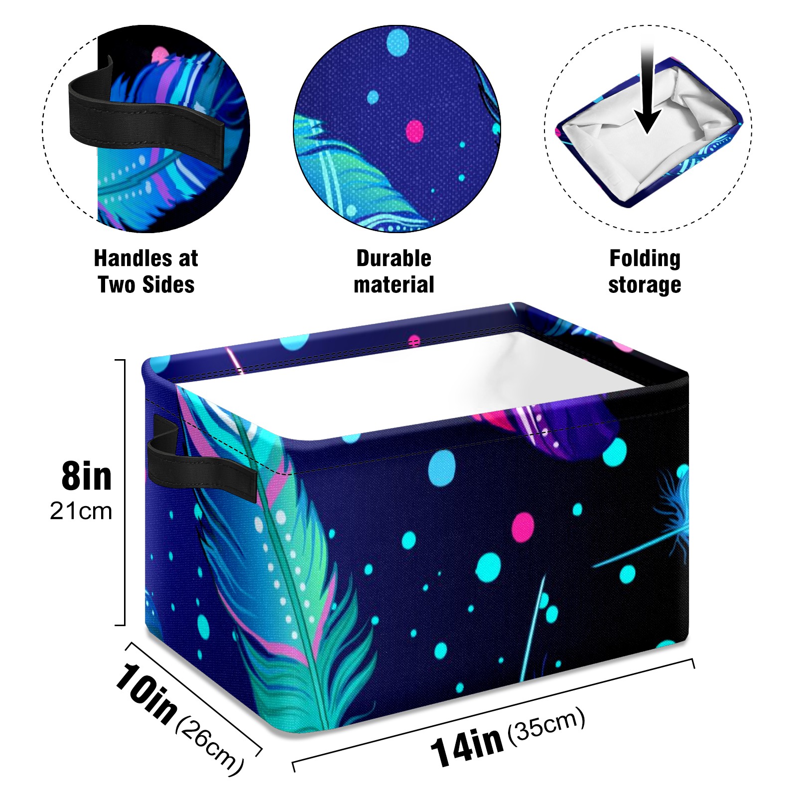 Collapsible 600D Oxford Storage Basket with Colourful Feather - Metal Frame 10"x14"x8" Reinforced Handles, Multi-Purpose Organizer