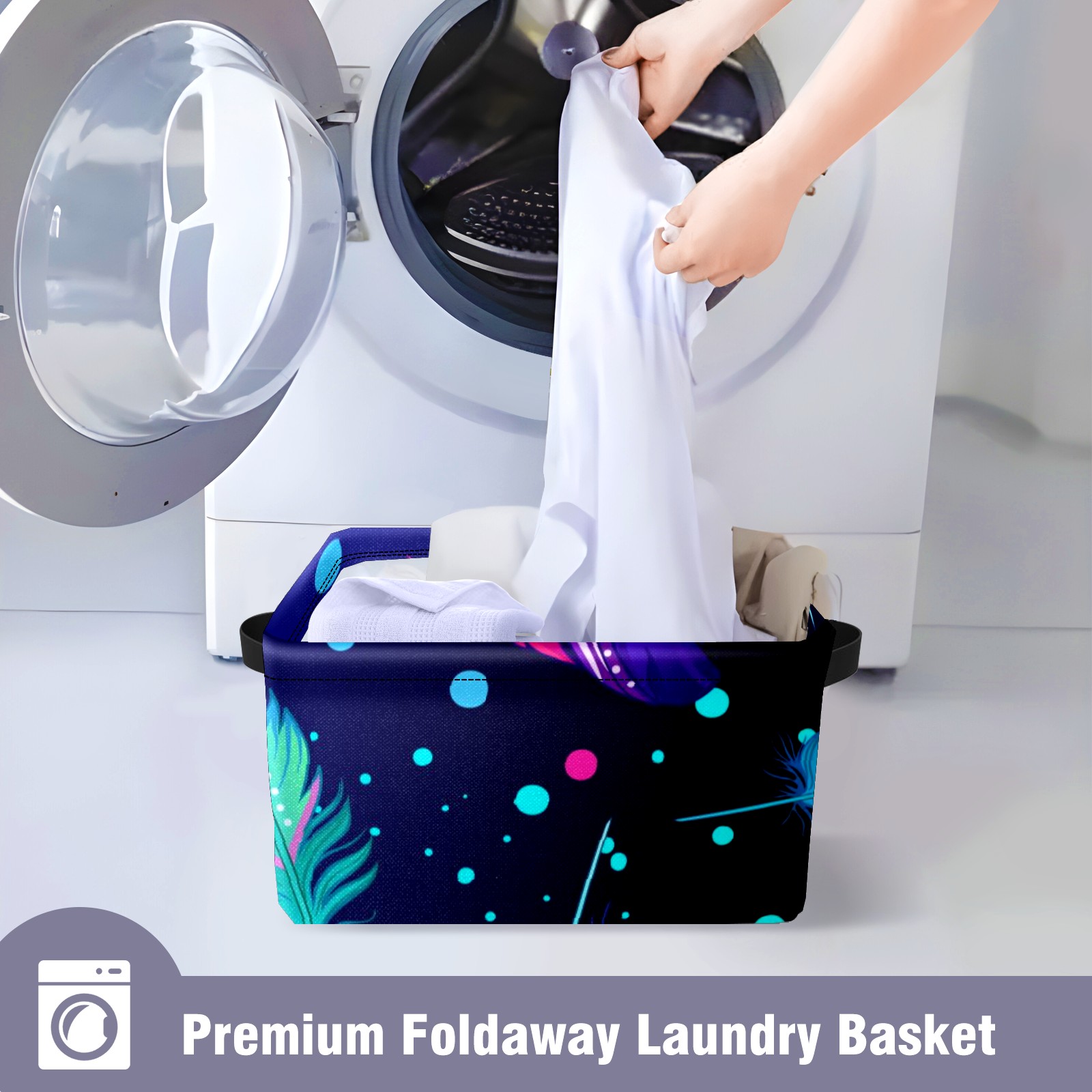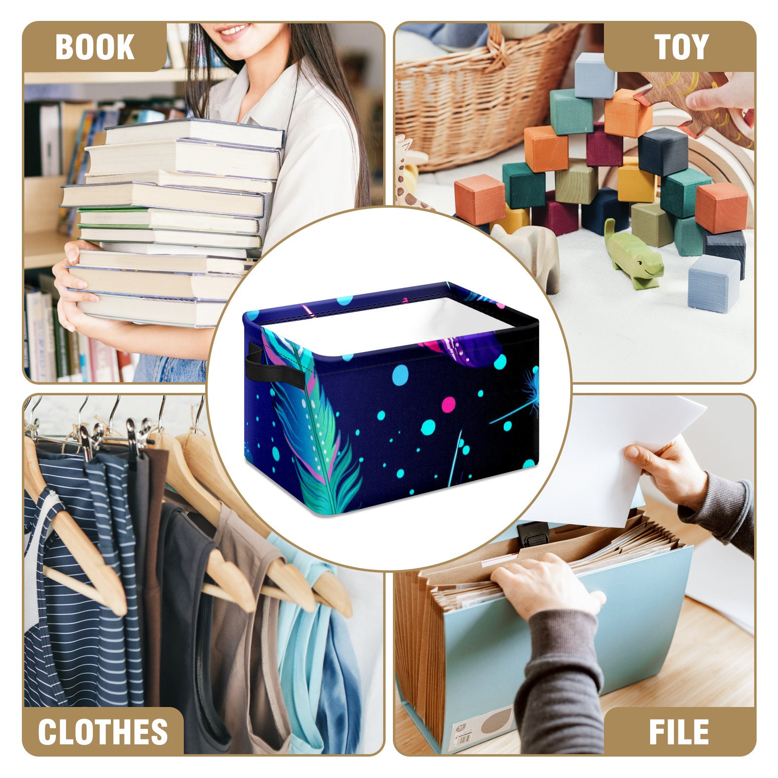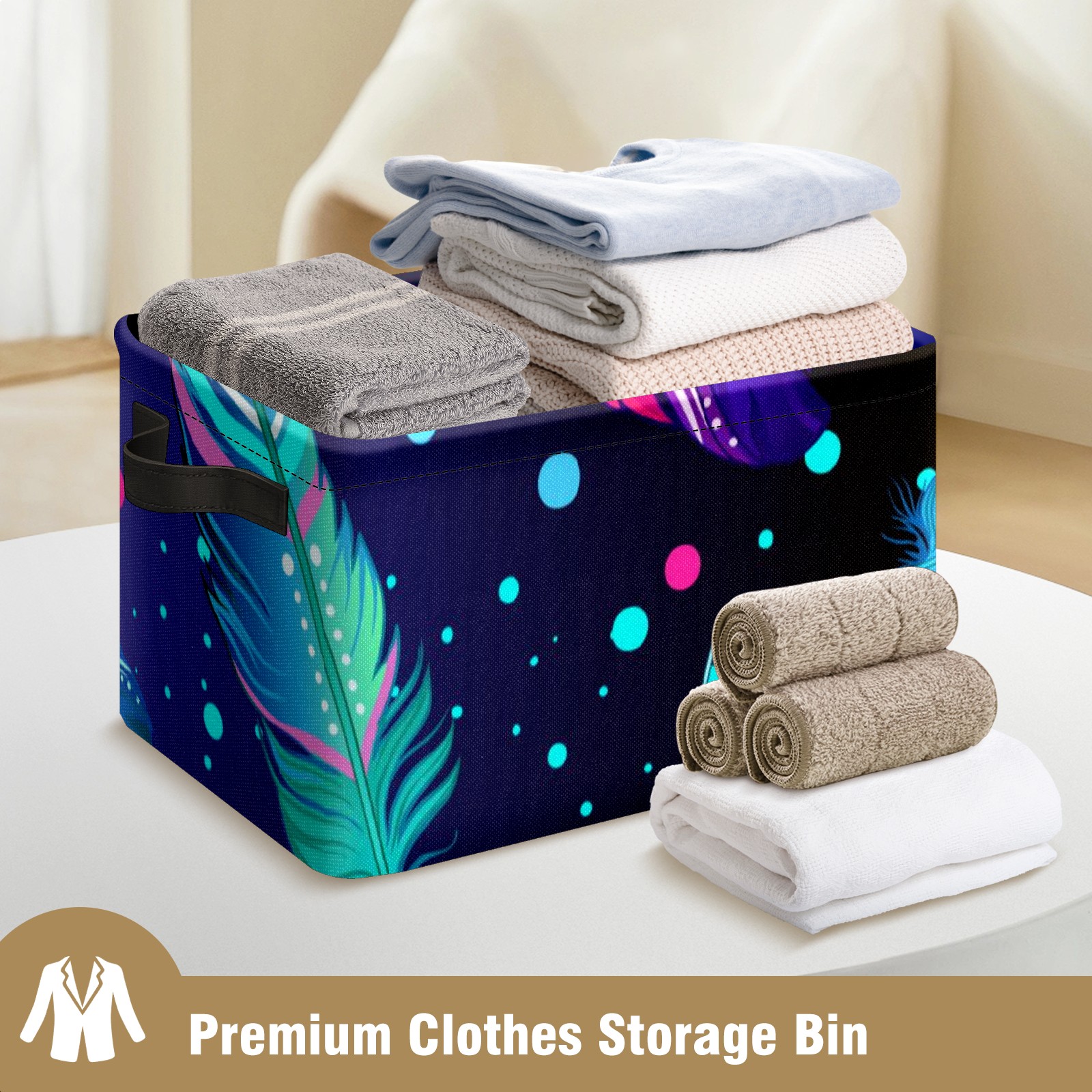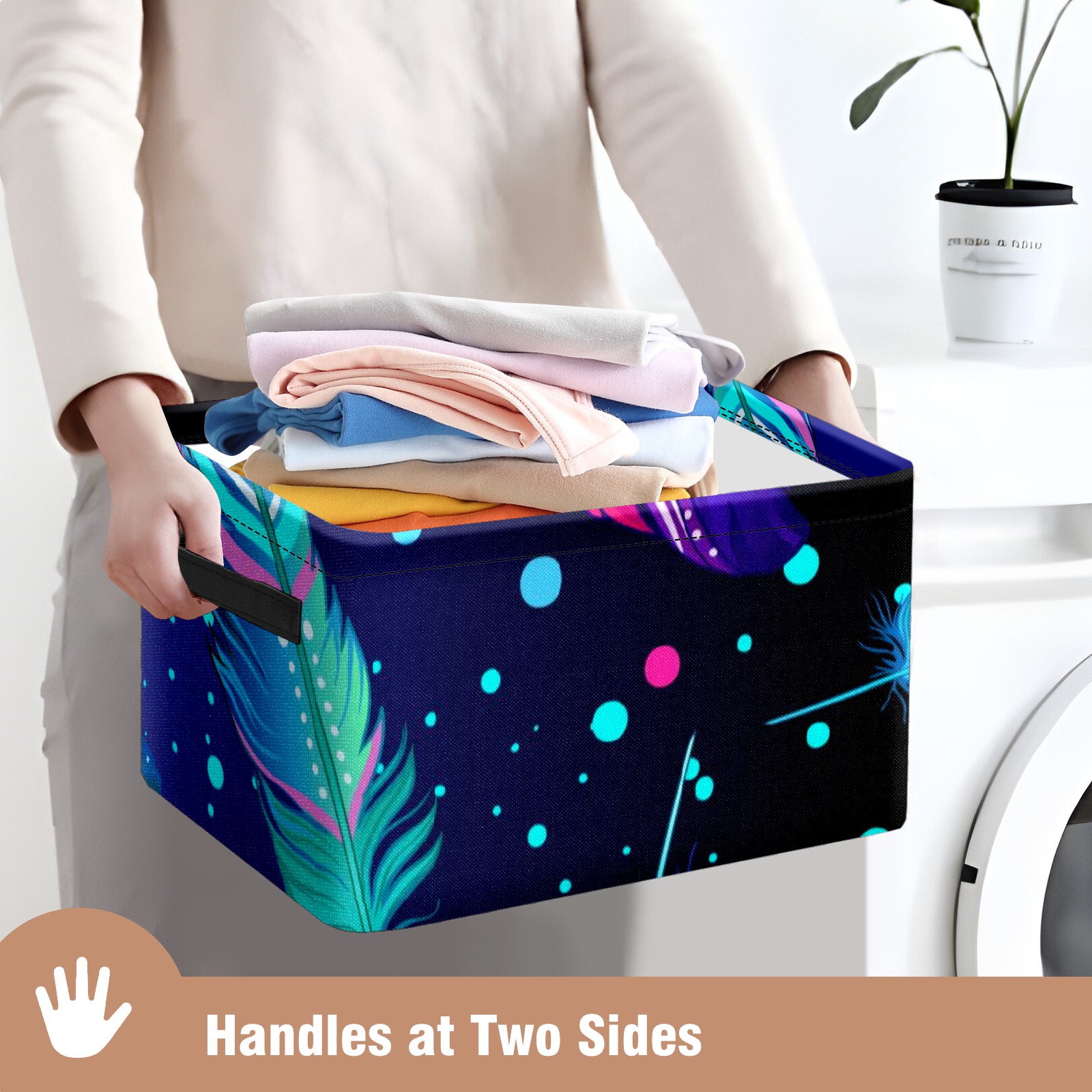 Collapsible 600D Oxford Storage Basket with Colourful Feather - Metal Frame 10"x14"x8" Reinforced Handles, Multi-Purpose Organizer