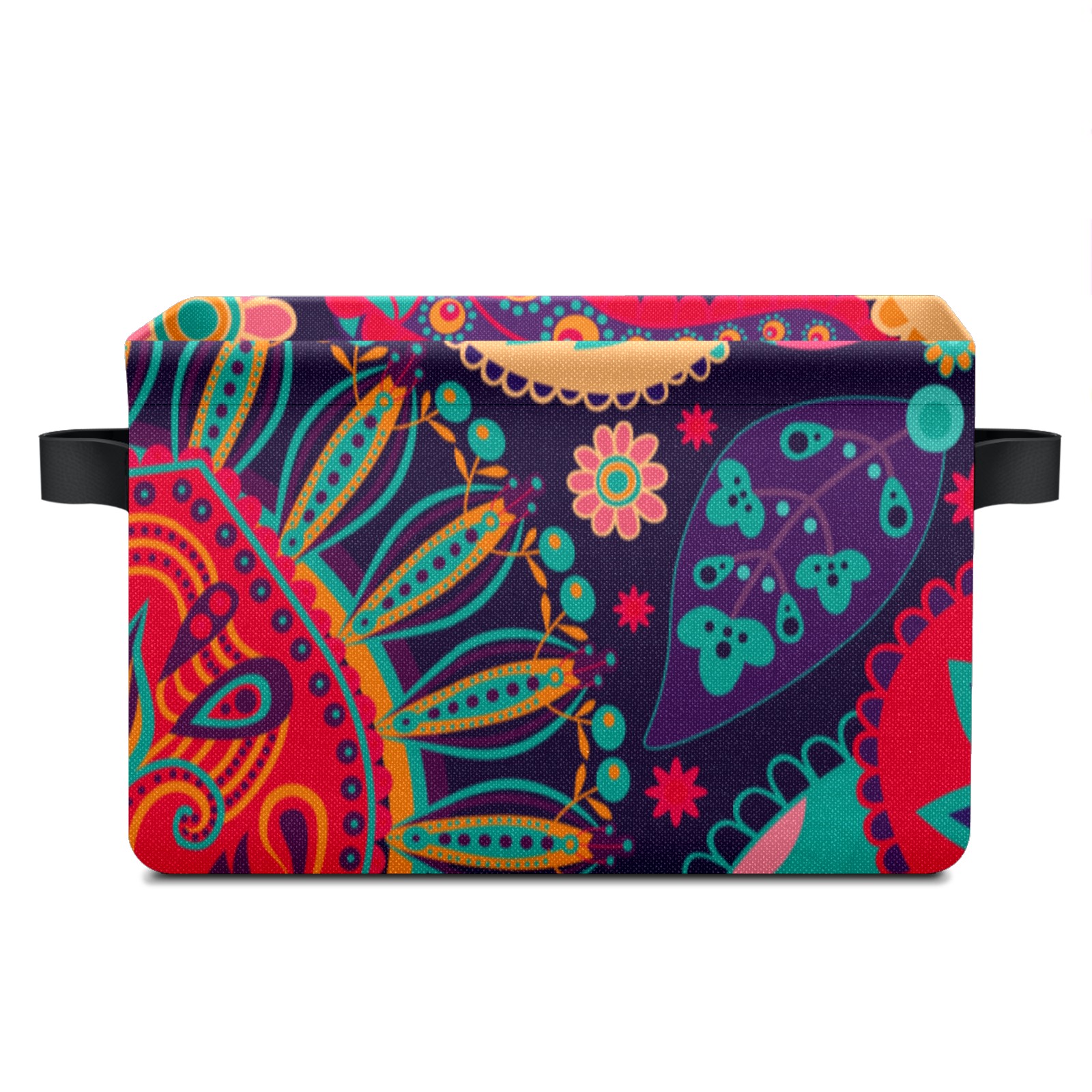 Collapsible 600D Oxford Storage Basket with Colorful Ethnic Floral Print - Metal Frame 10"x14"x8" Reinforced Handles, Multi-Purpose Organizer