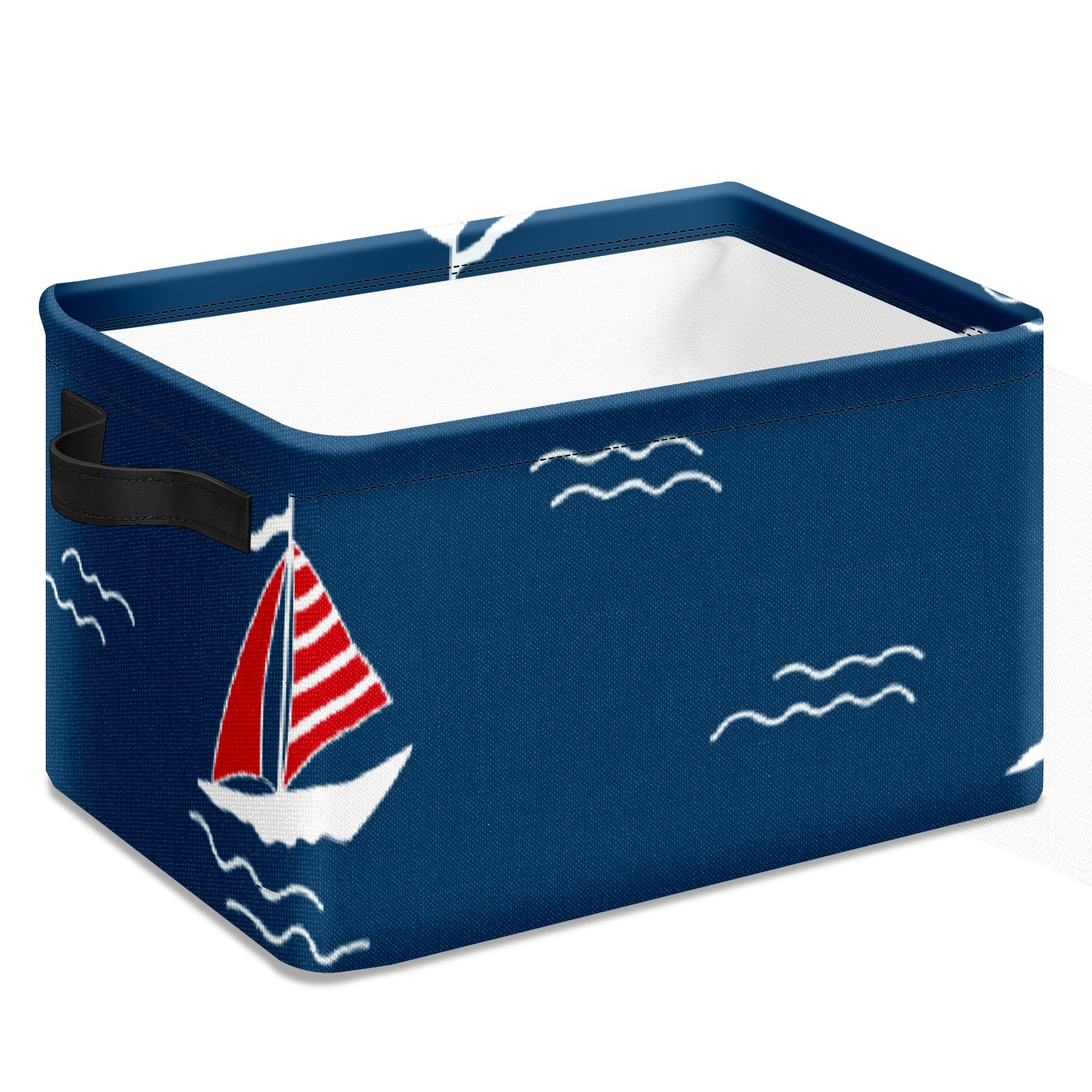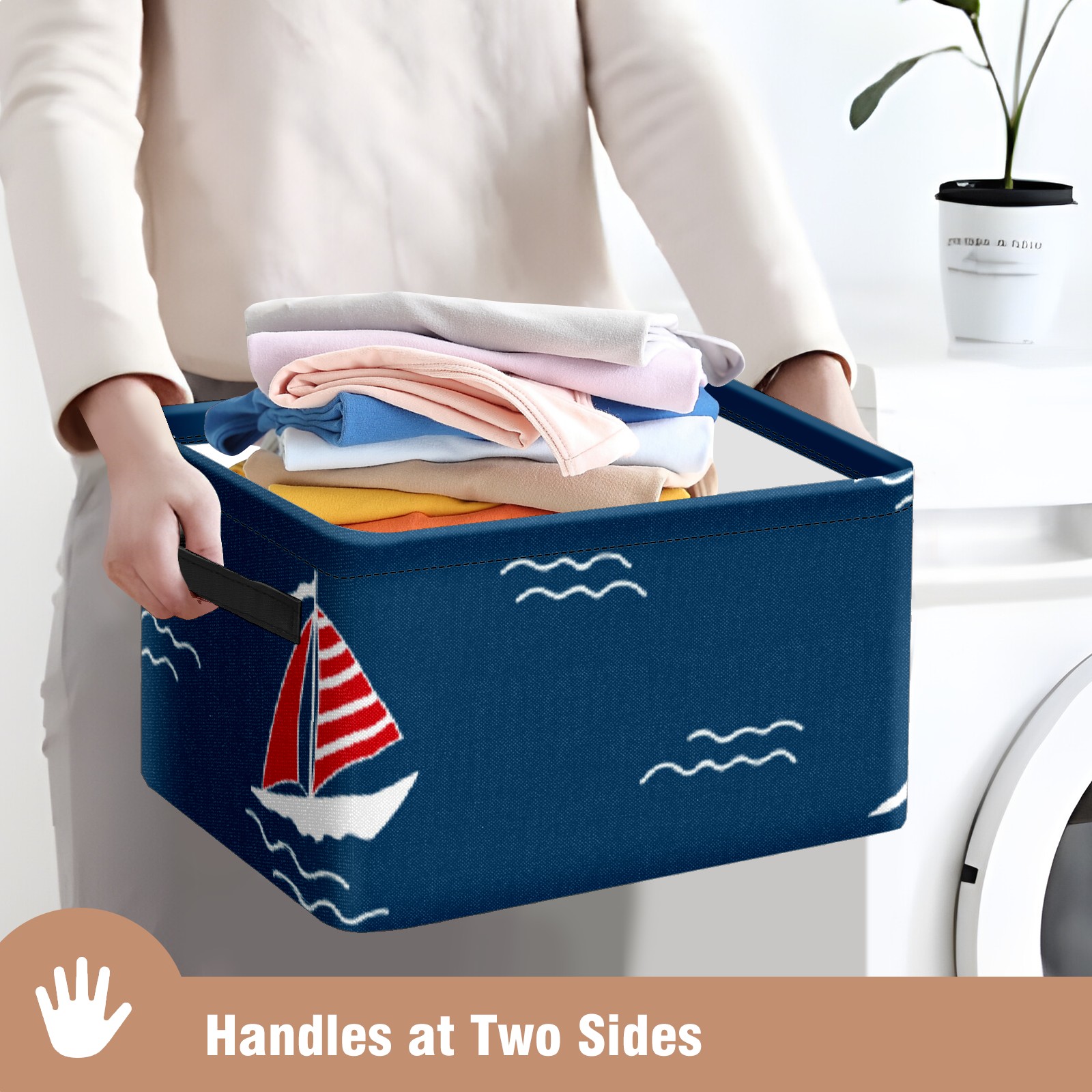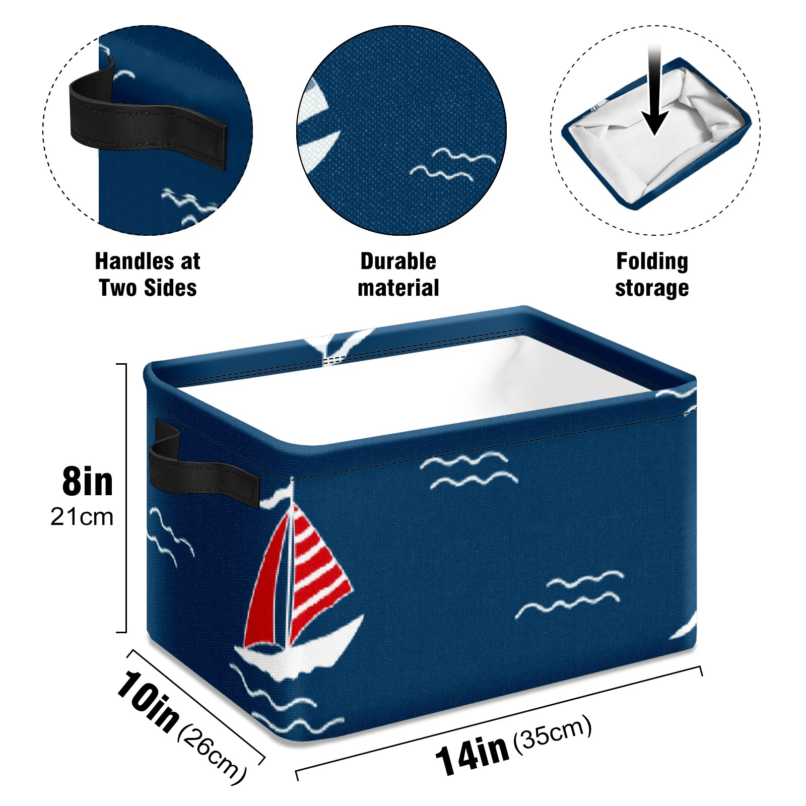 Collapsible 600D Oxford Storage Basket with Nautical Ocean Sea Sail Boat Pattern - Metal Frame 10"x14"x8" Reinforced Handles, Multi-Purpose Organizer