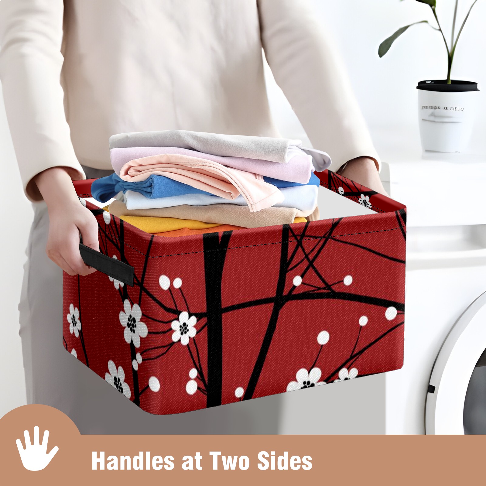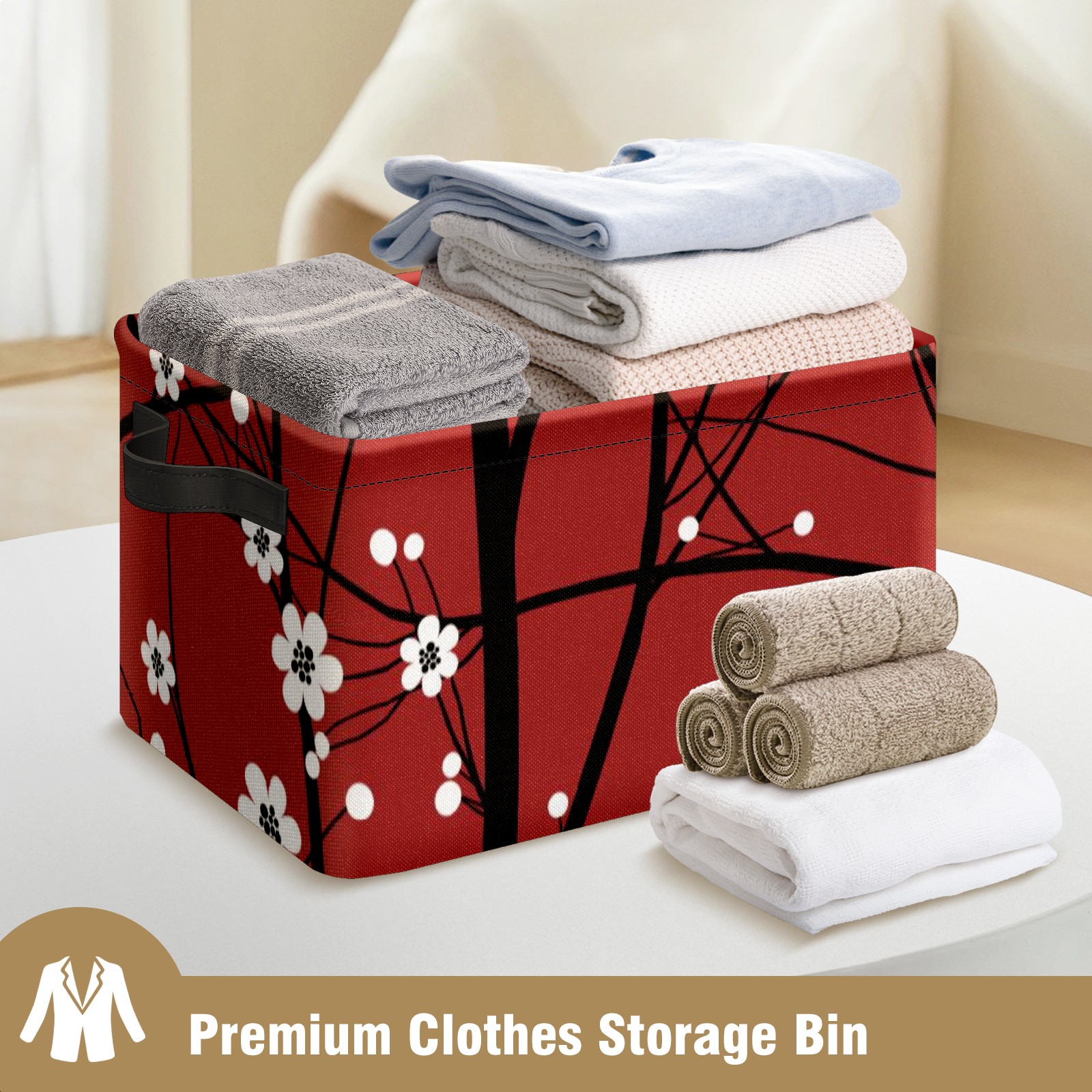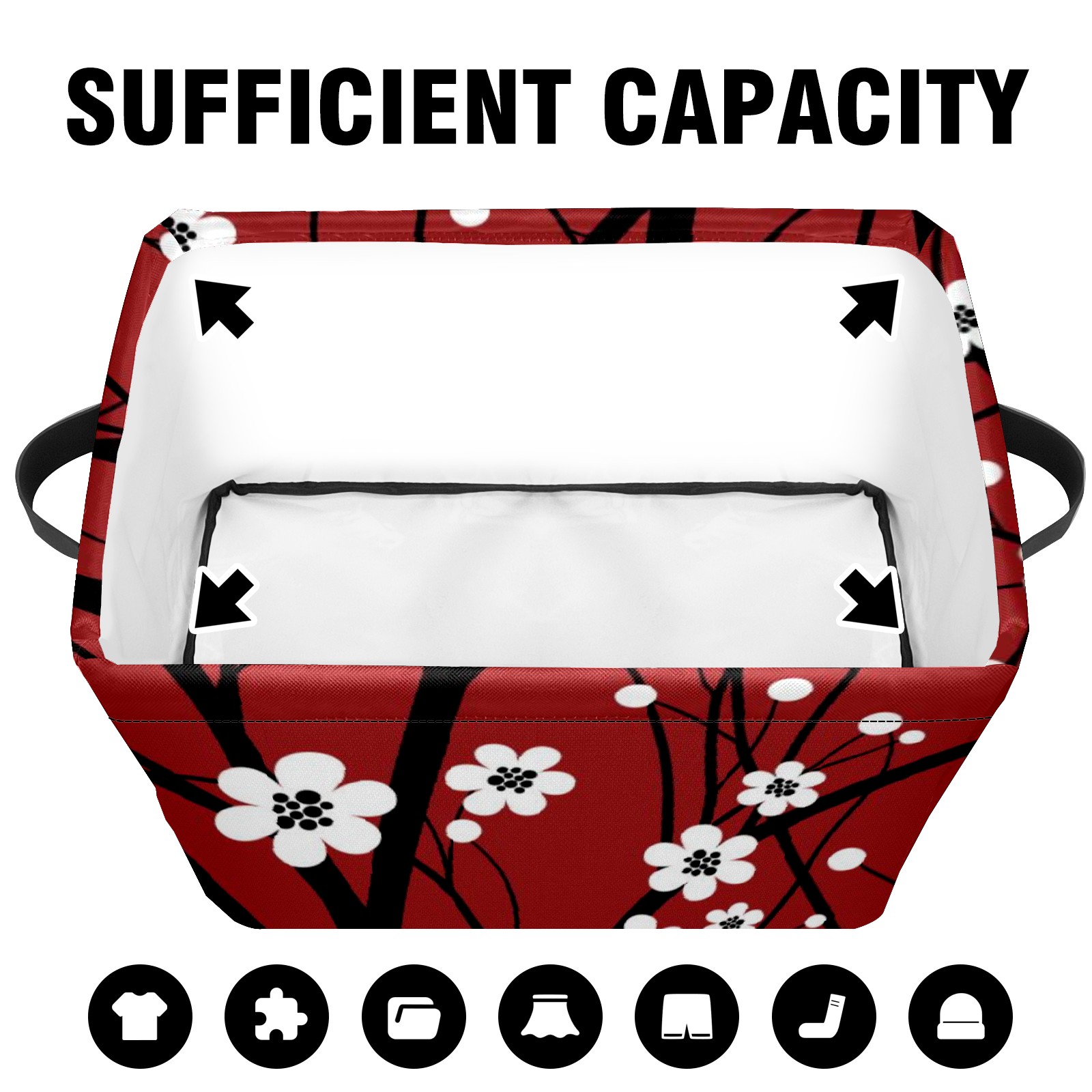 Collapsible 600D Oxford Storage Basket with Japanese Cherry Blossom Tree Red - Metal Frame 10"x14"x8" Reinforced Handles, Multi-Purpose Organizer