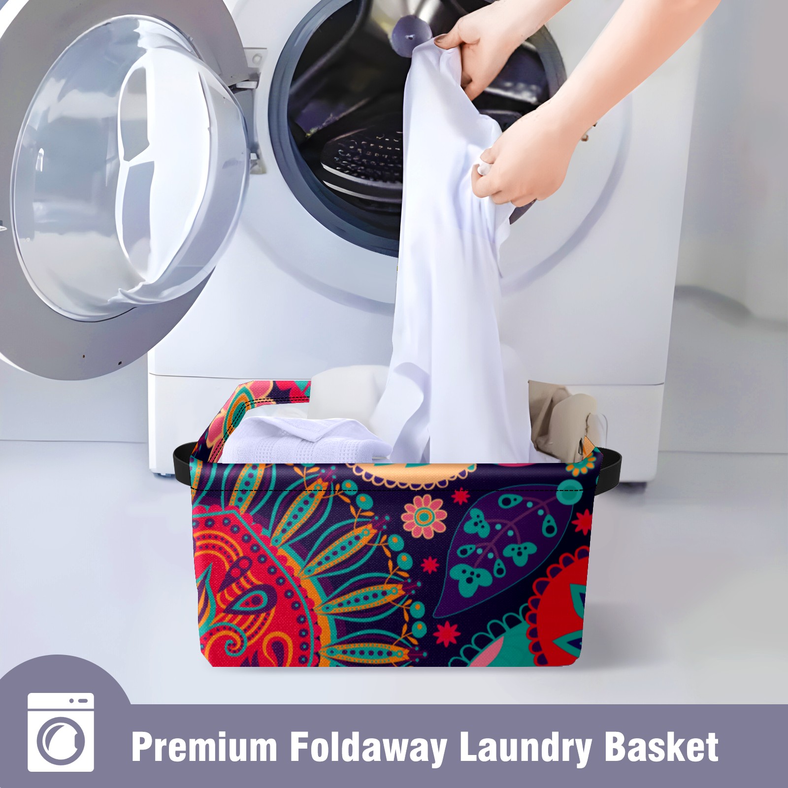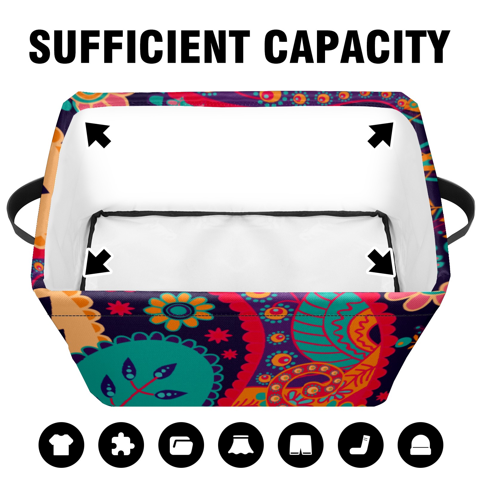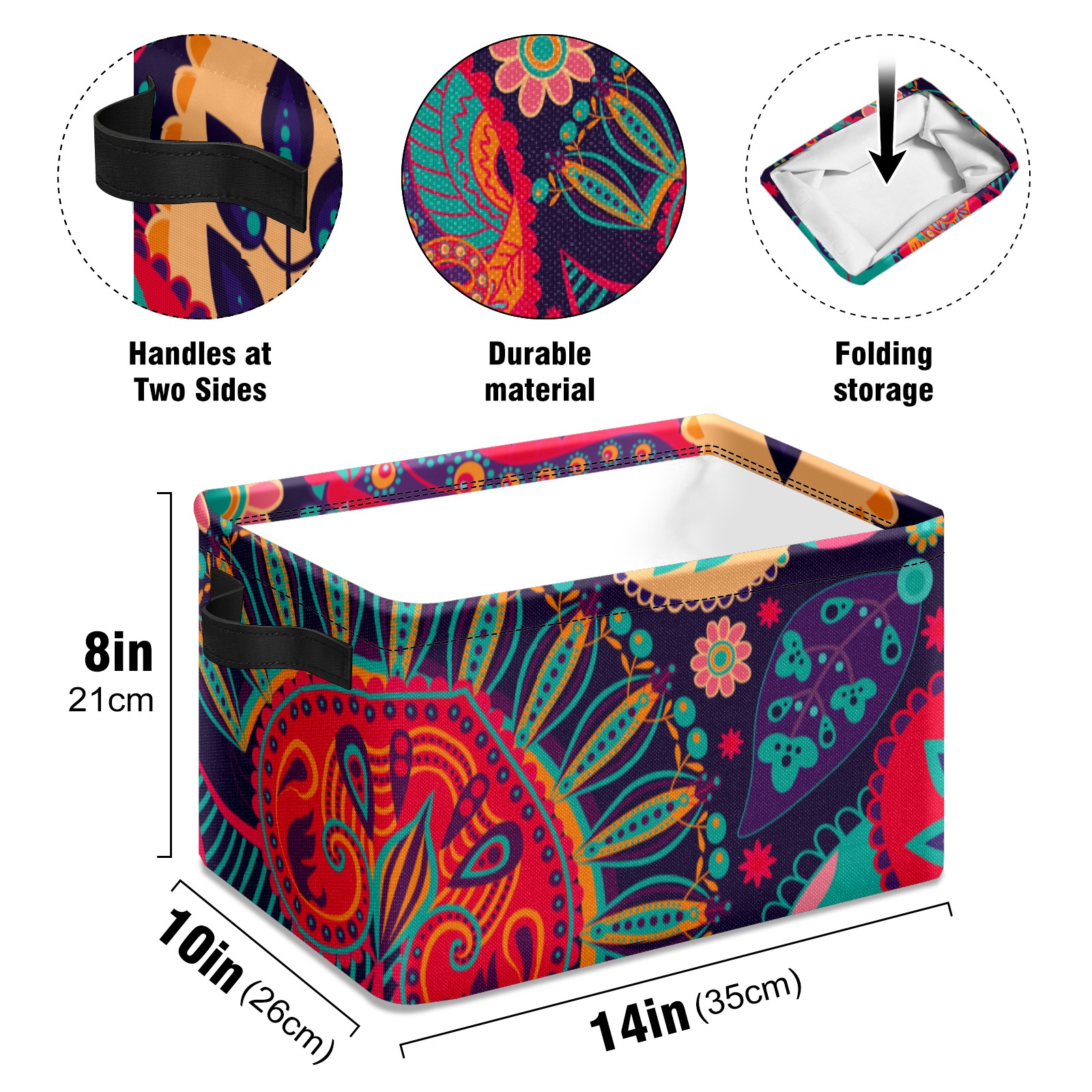 Collapsible 600D Oxford Storage Basket with Colorful Paisley Ethnic Floral Print - Metal Frame 10"x14"x8" Reinforced Handles, Multi-Purpose Organizer
