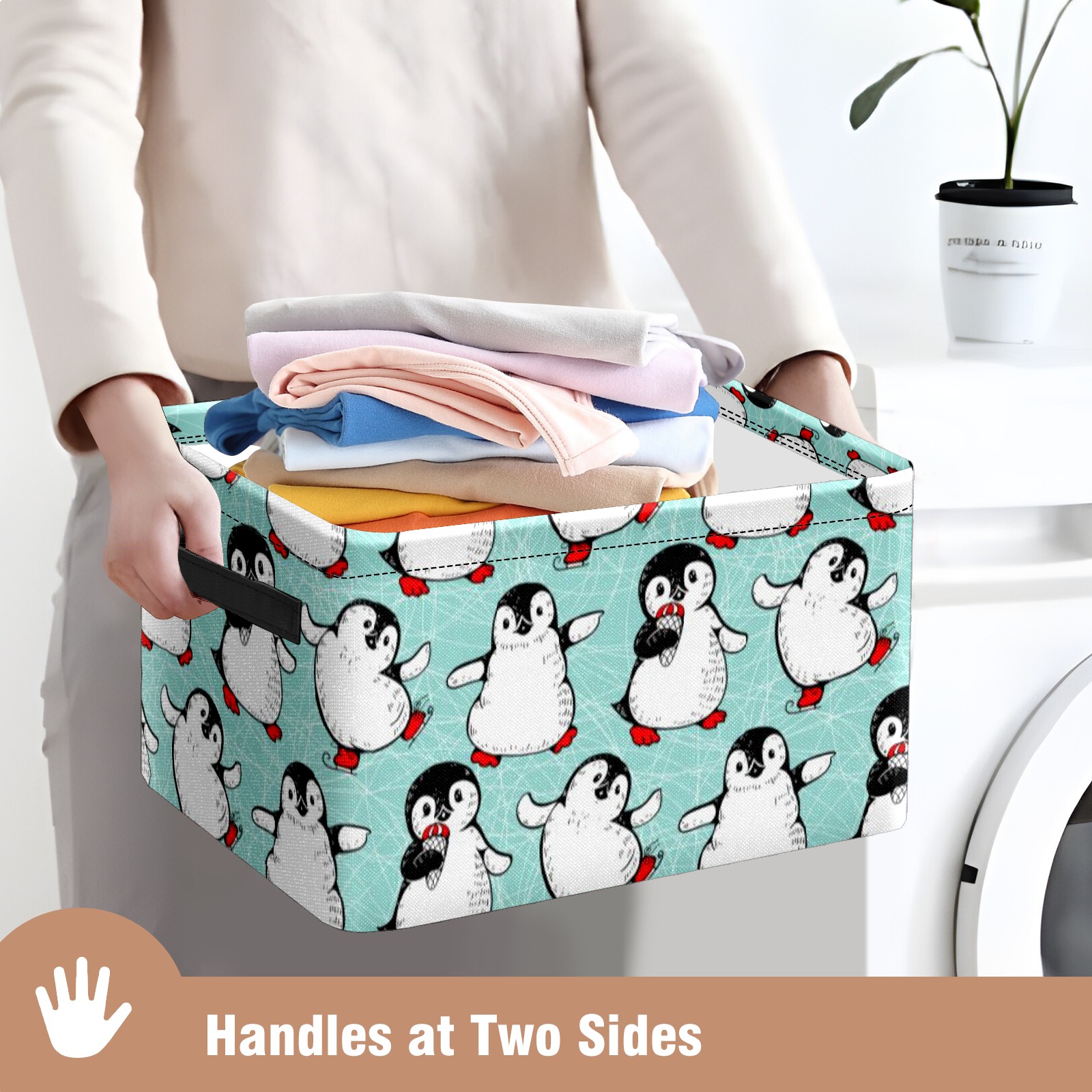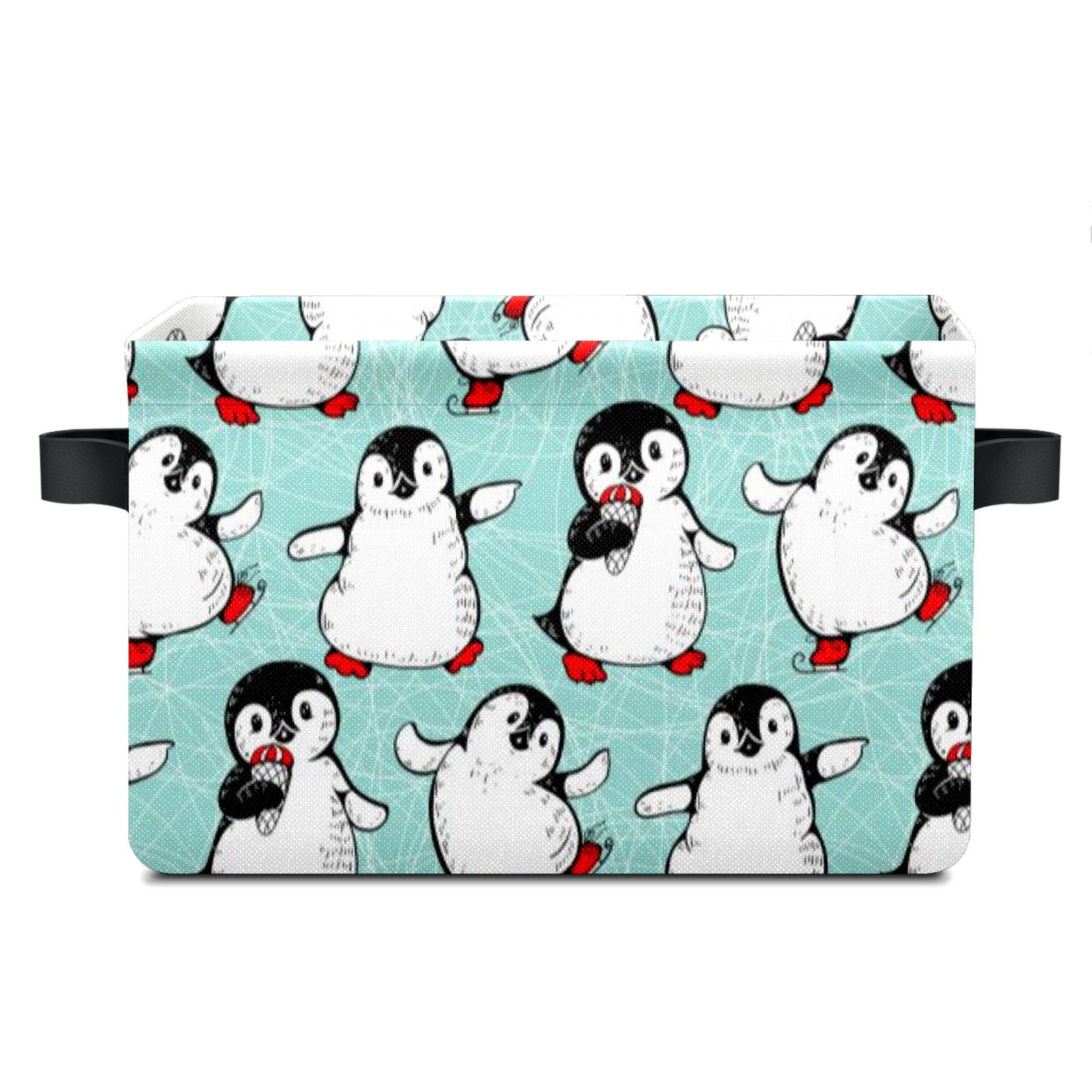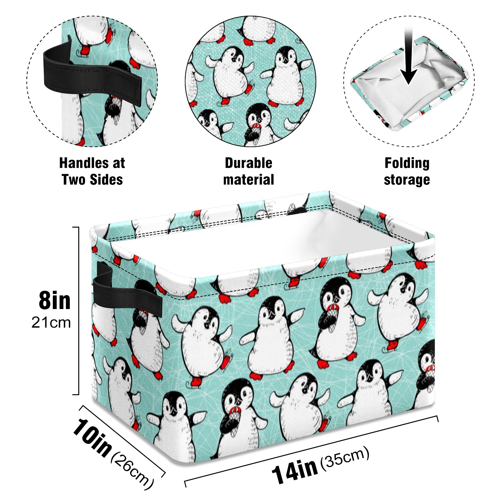 Collapsible 600D Oxford Storage Basket with Cute-Penguin-Fun - Metal Frame 10"x14"x8" Reinforced Handles, Multi-Purpose Organizer