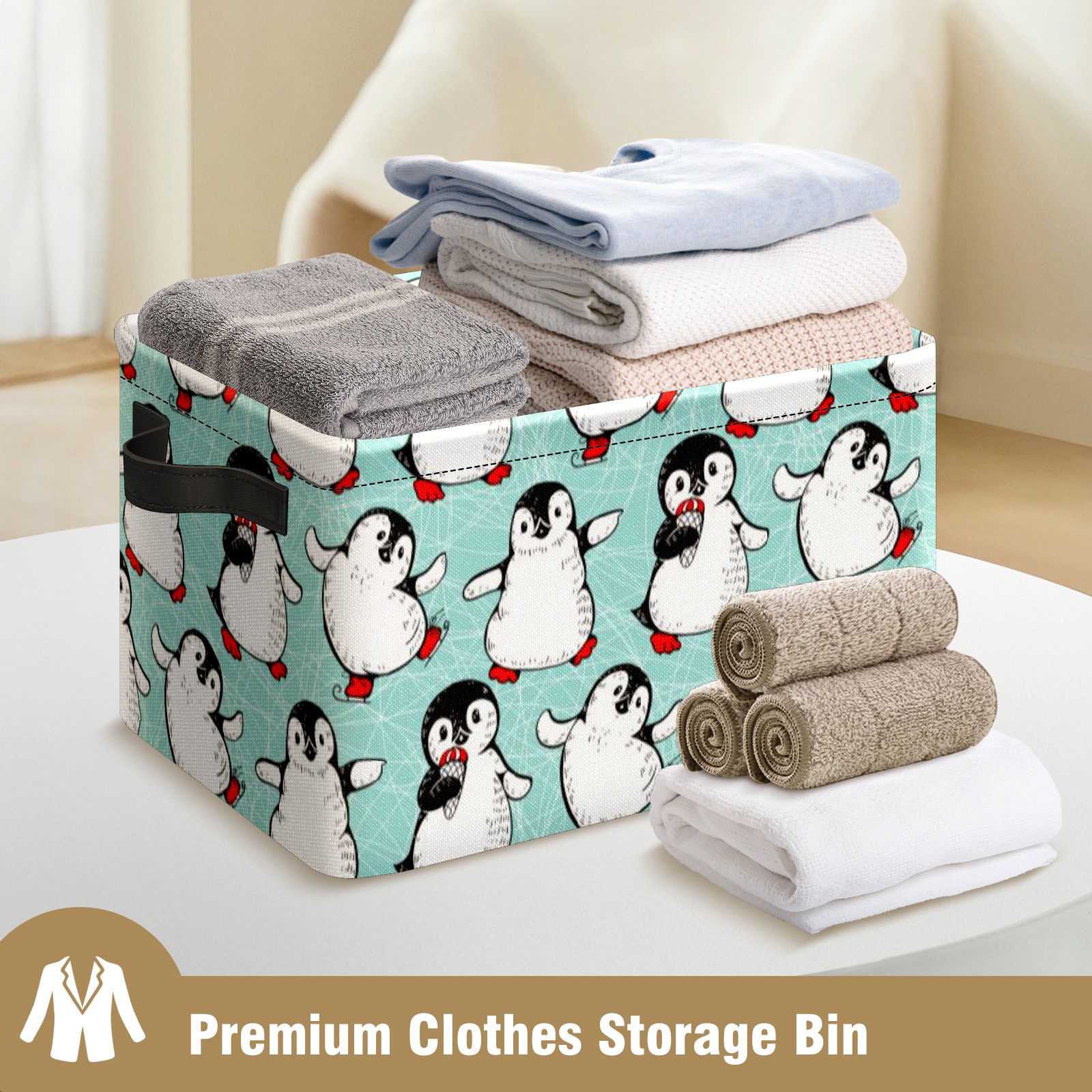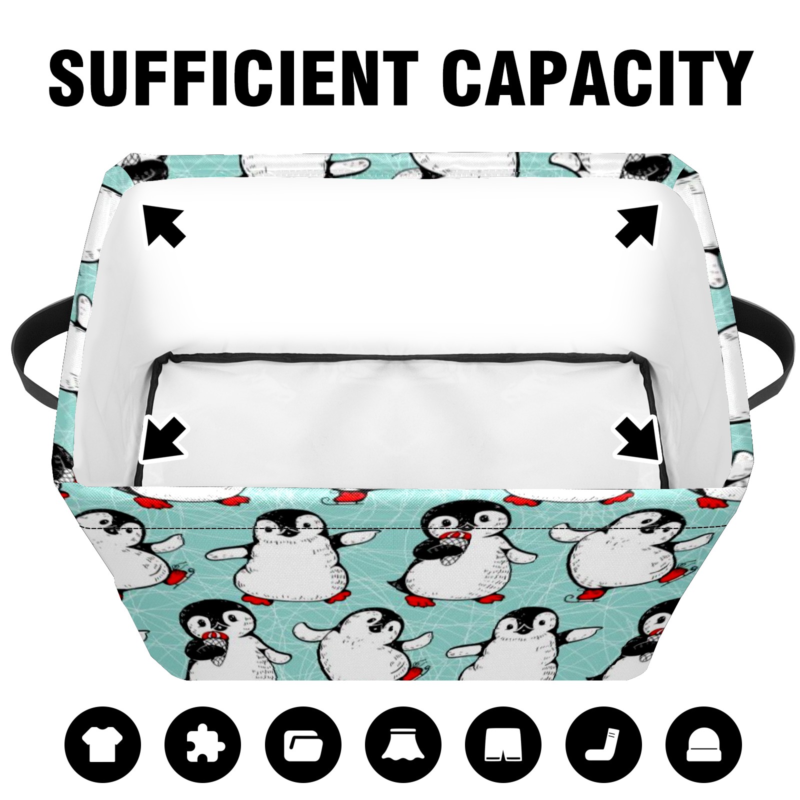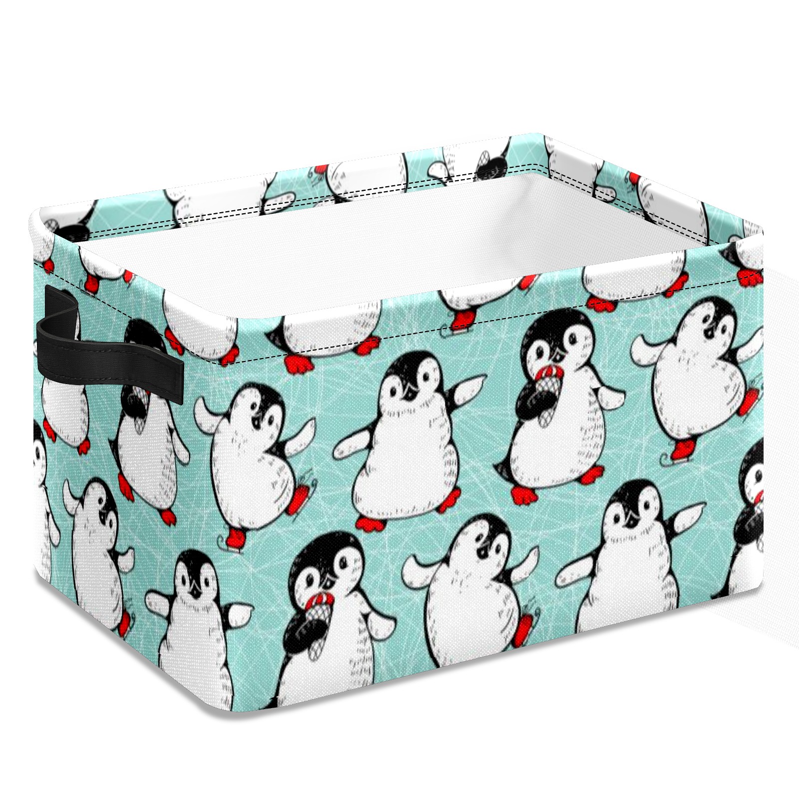 Collapsible 600D Oxford Storage Basket with Cute-Penguin-Fun - Metal Frame 10"x14"x8" Reinforced Handles, Multi-Purpose Organizer