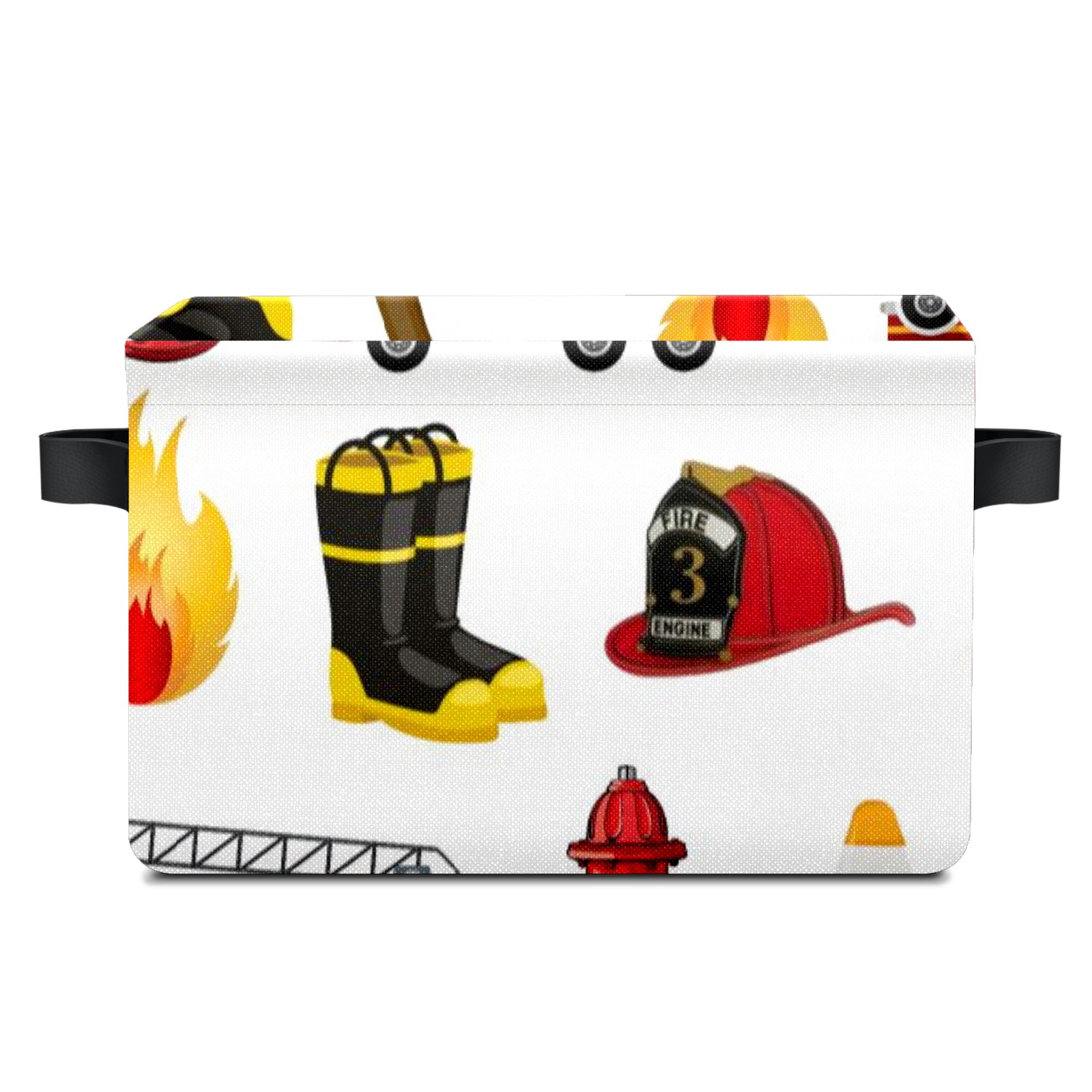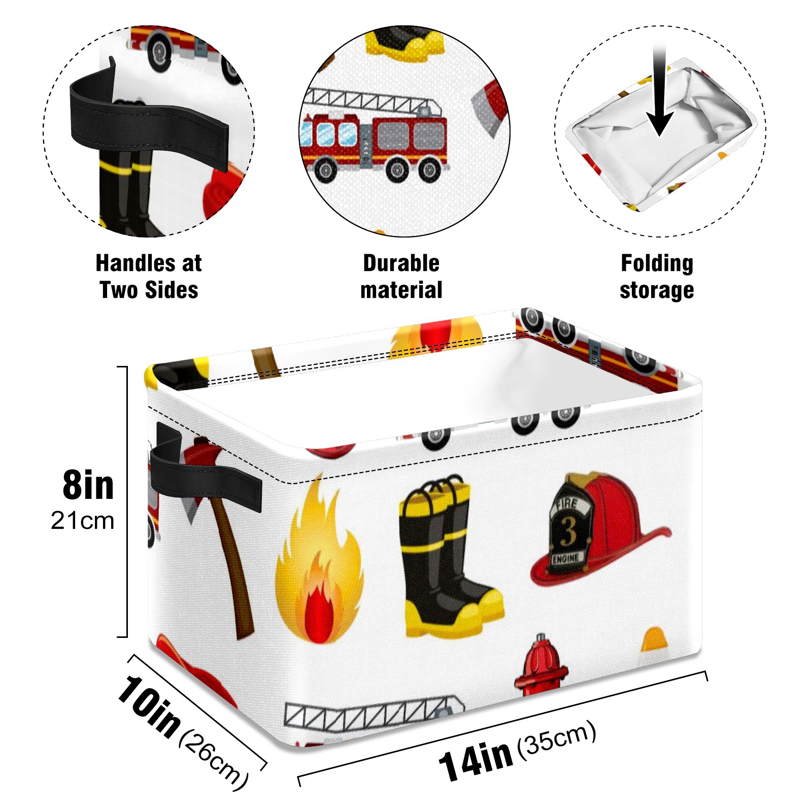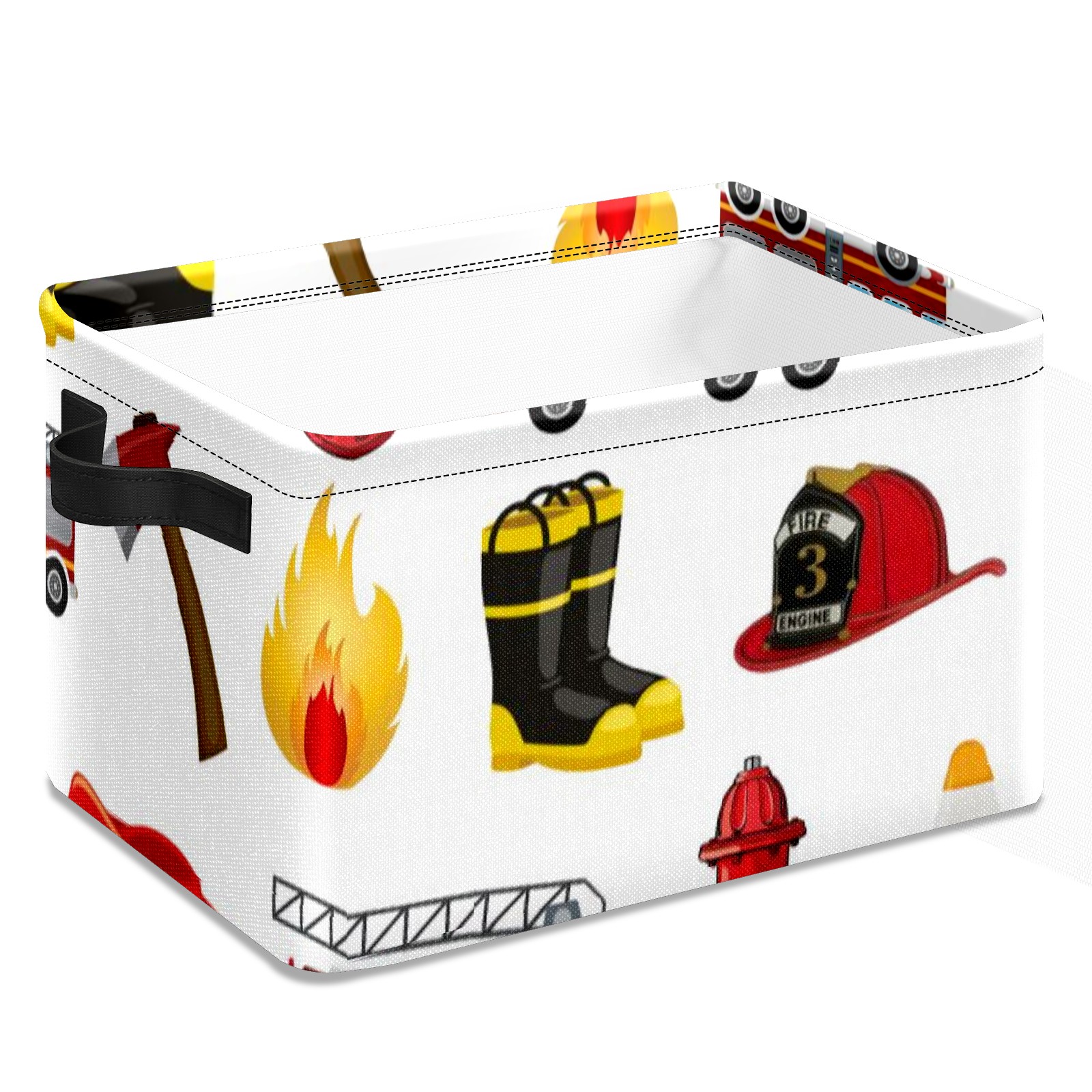 Collapsible 600D Oxford Storage Basket with Fire Fighter Truck - Metal Frame 10"x14"x8" Reinforced Handles, Multi-Purpose Organizer