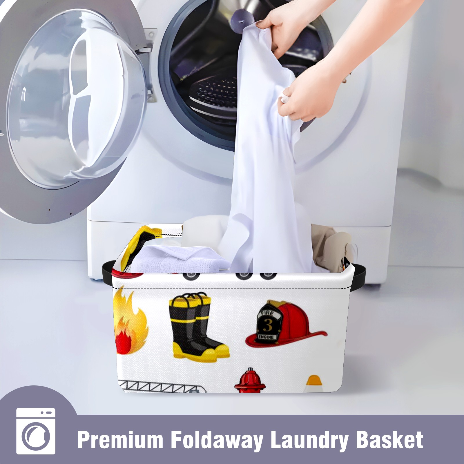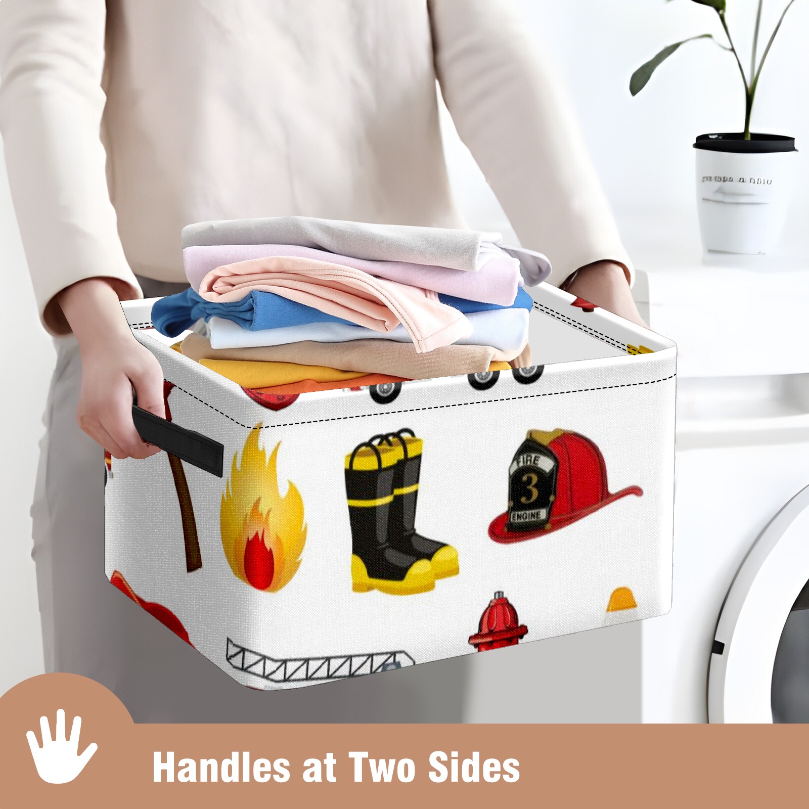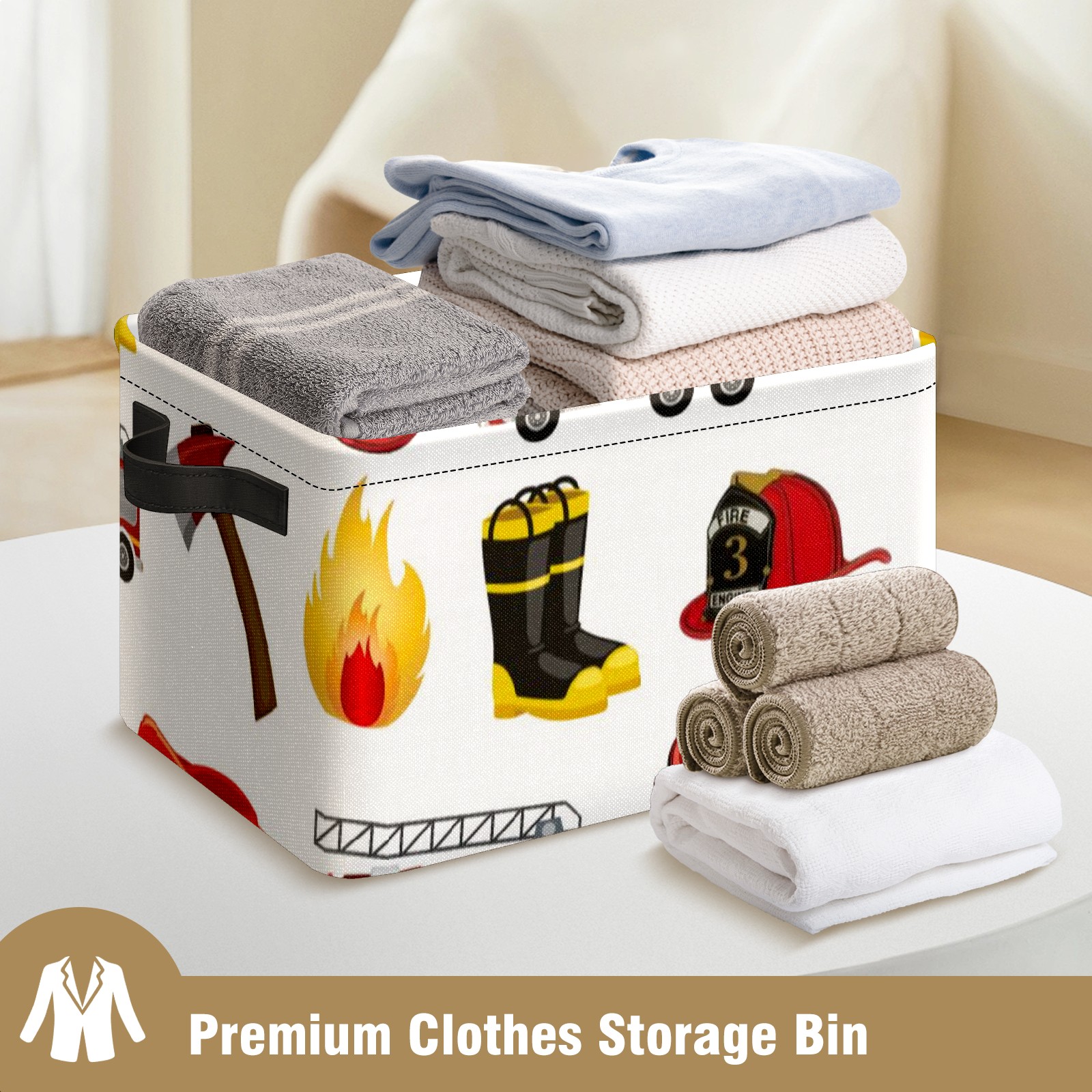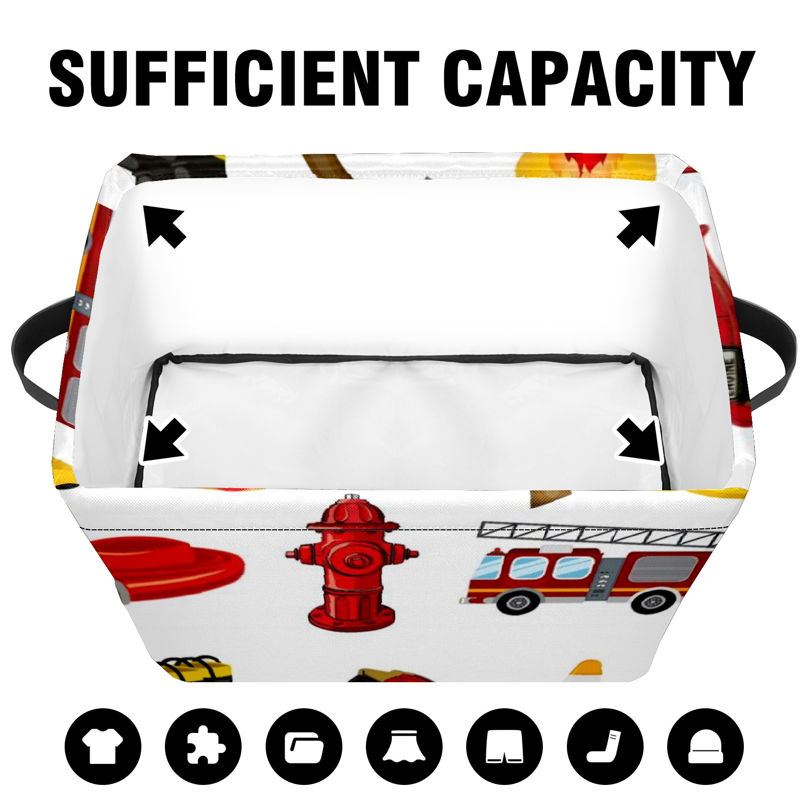 Collapsible 600D Oxford Storage Basket with Fire Fighter Truck - Metal Frame 10"x14"x8" Reinforced Handles, Multi-Purpose Organizer
