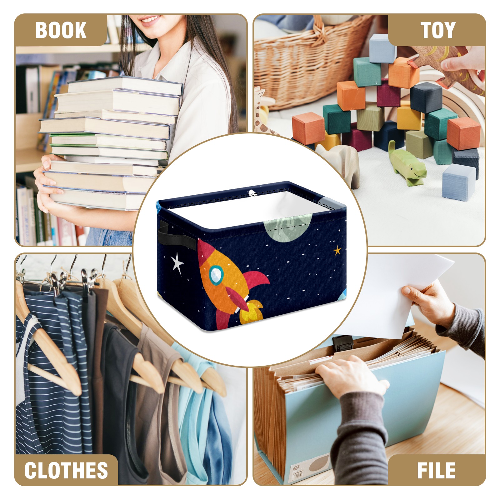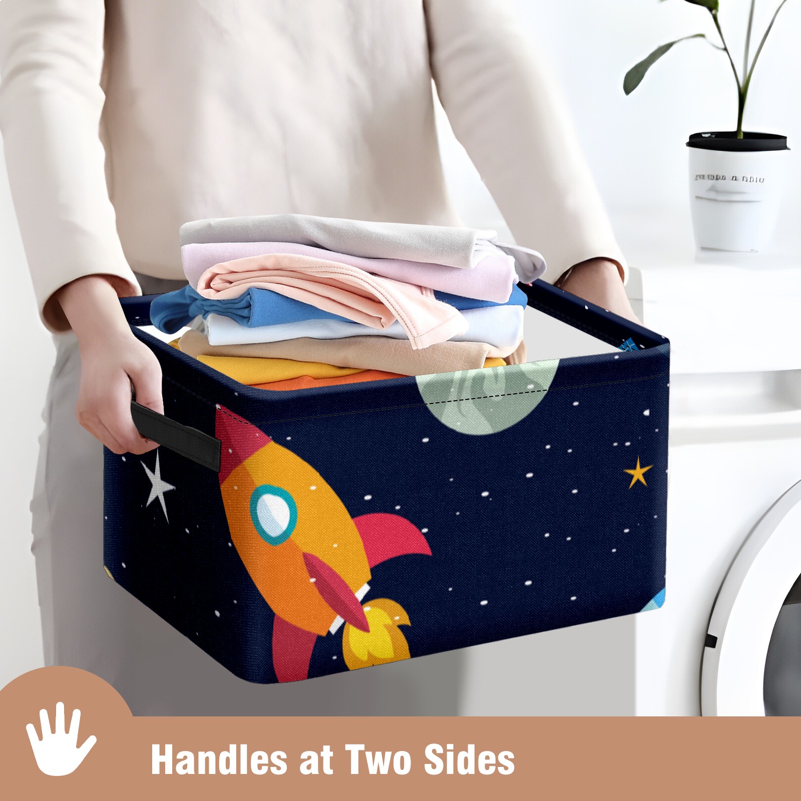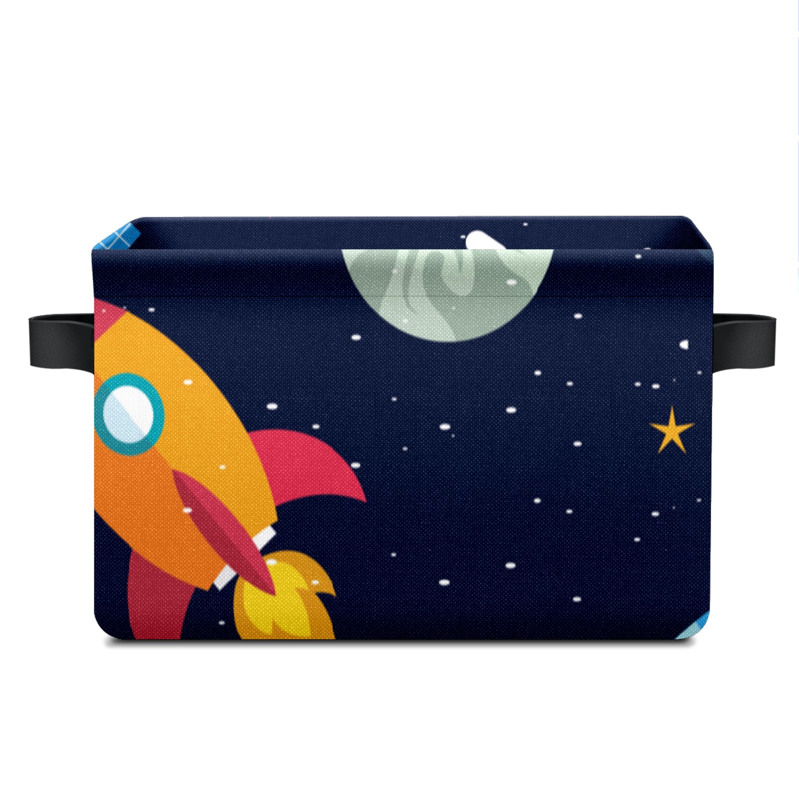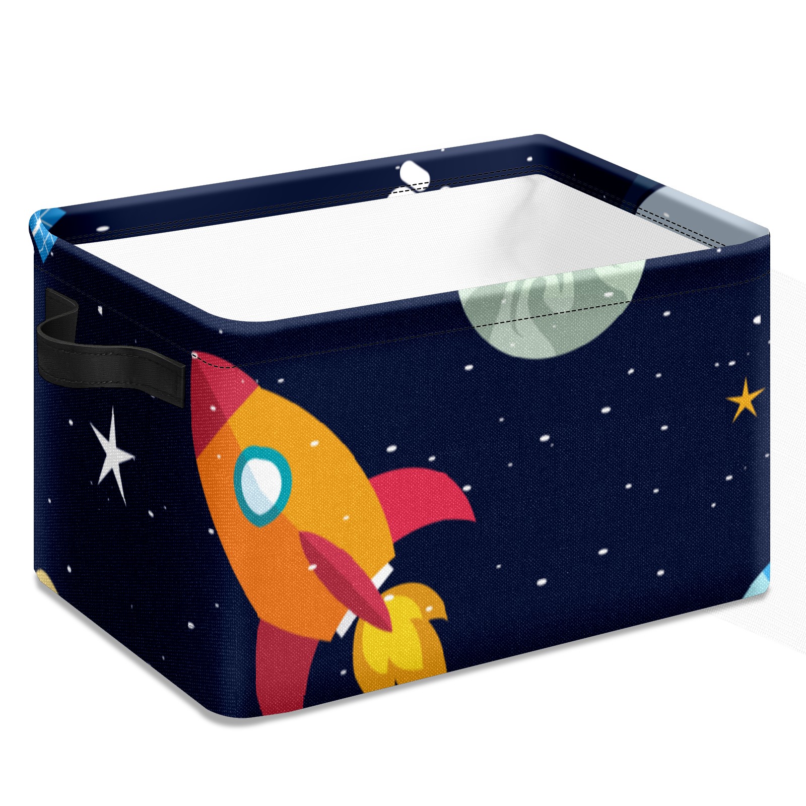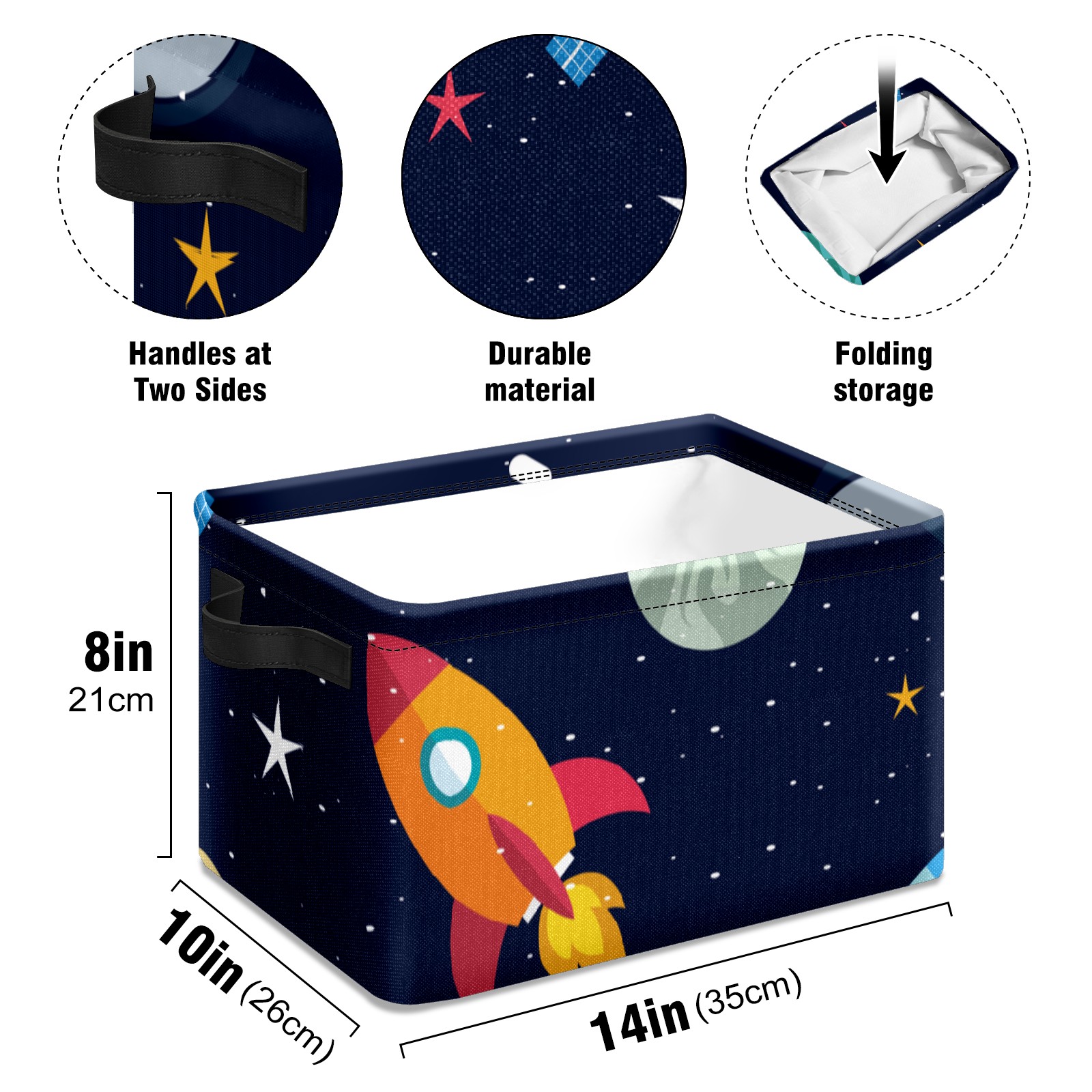 Collapsible 600D Oxford Storage Basket with Space Stars Planets With Rockets - Metal Frame 10"x14"x8" Reinforced Handles, Multi-Purpose Organizer