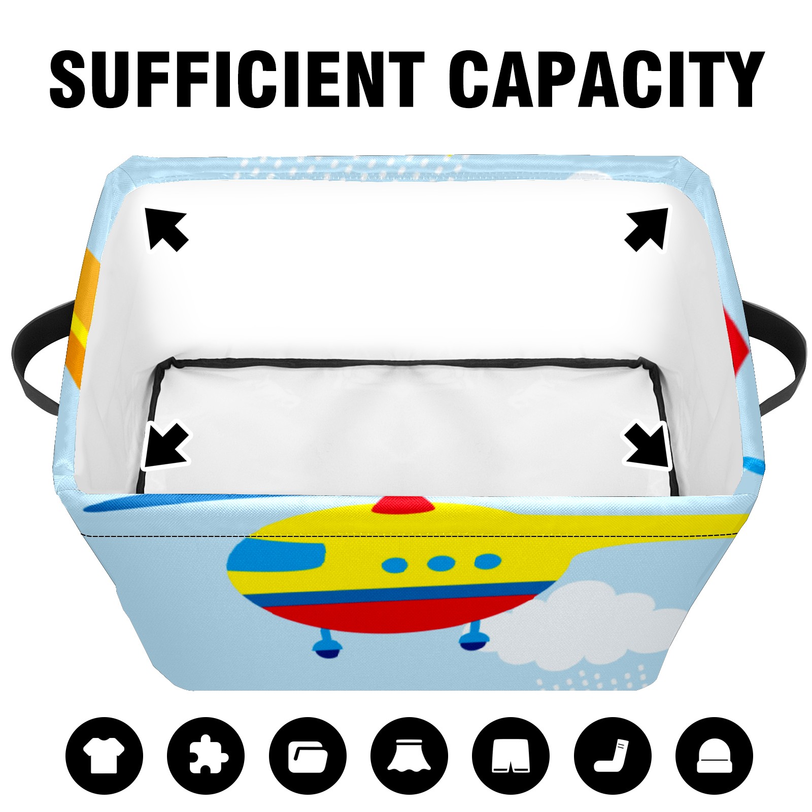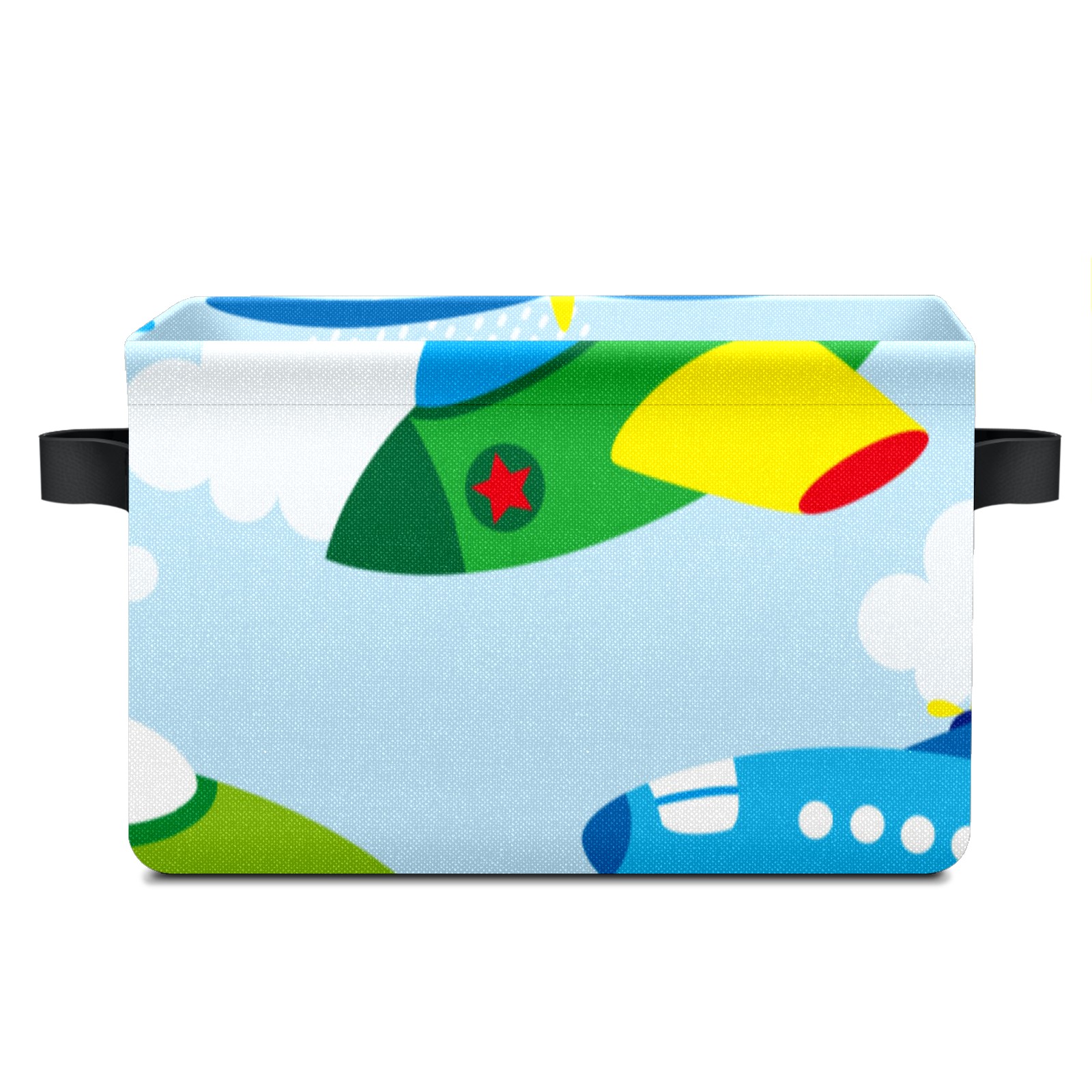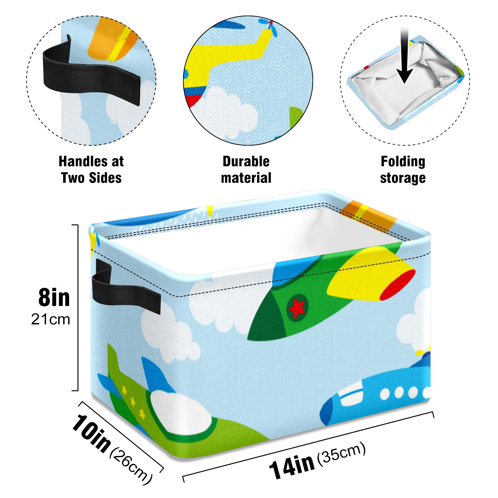 Collapsible 600D Oxford Storage Basket with Cute Cartoon Airplane Helicopter Pattern - Metal Frame 10"x14"x8" Reinforced Handles, Multi-Purpose Organizer