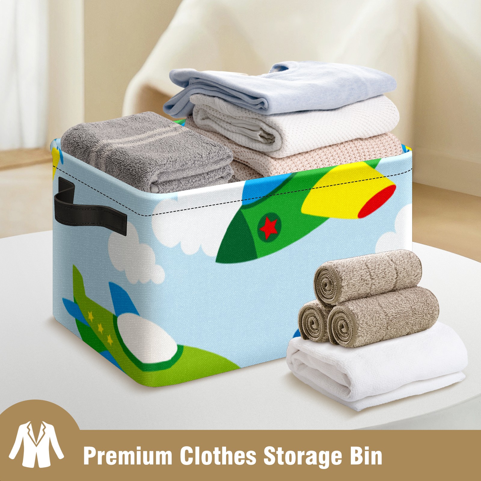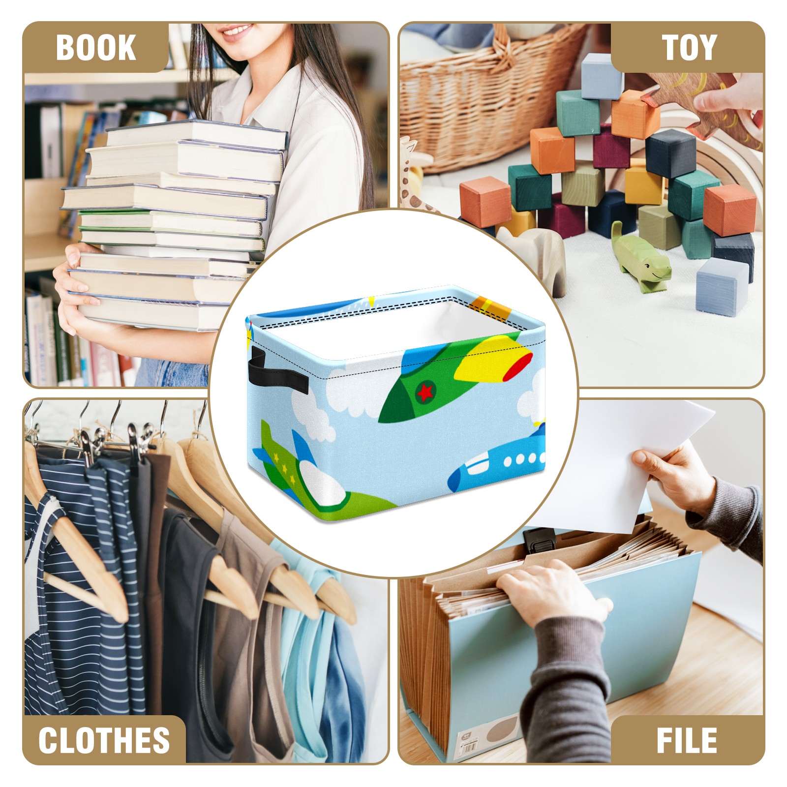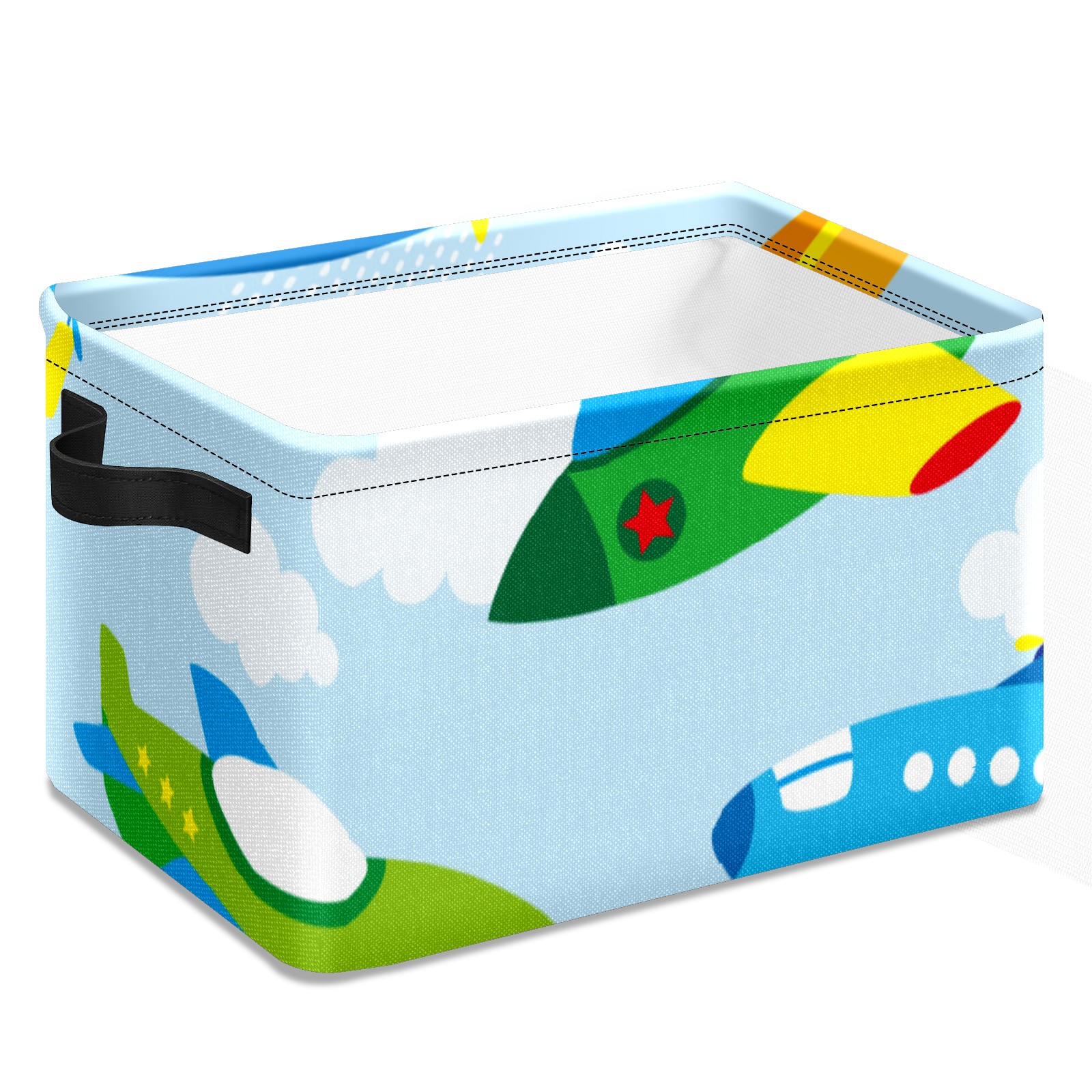 Collapsible 600D Oxford Storage Basket with Cute Cartoon Airplane Helicopter Pattern - Metal Frame 10"x14"x8" Reinforced Handles, Multi-Purpose Organizer