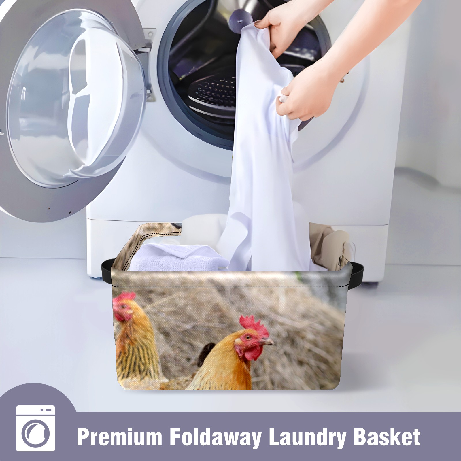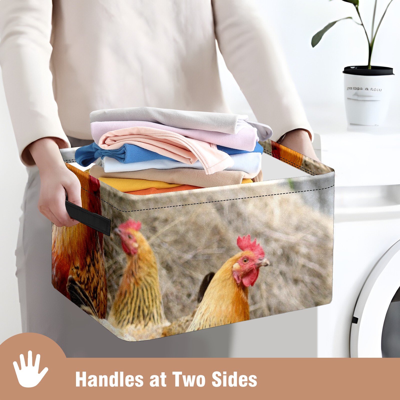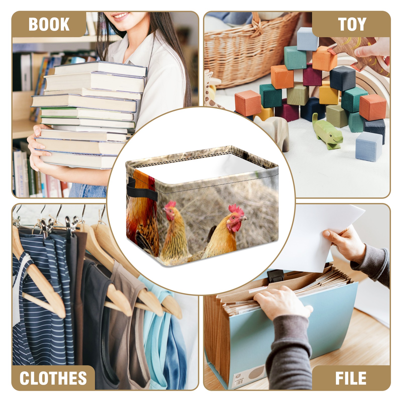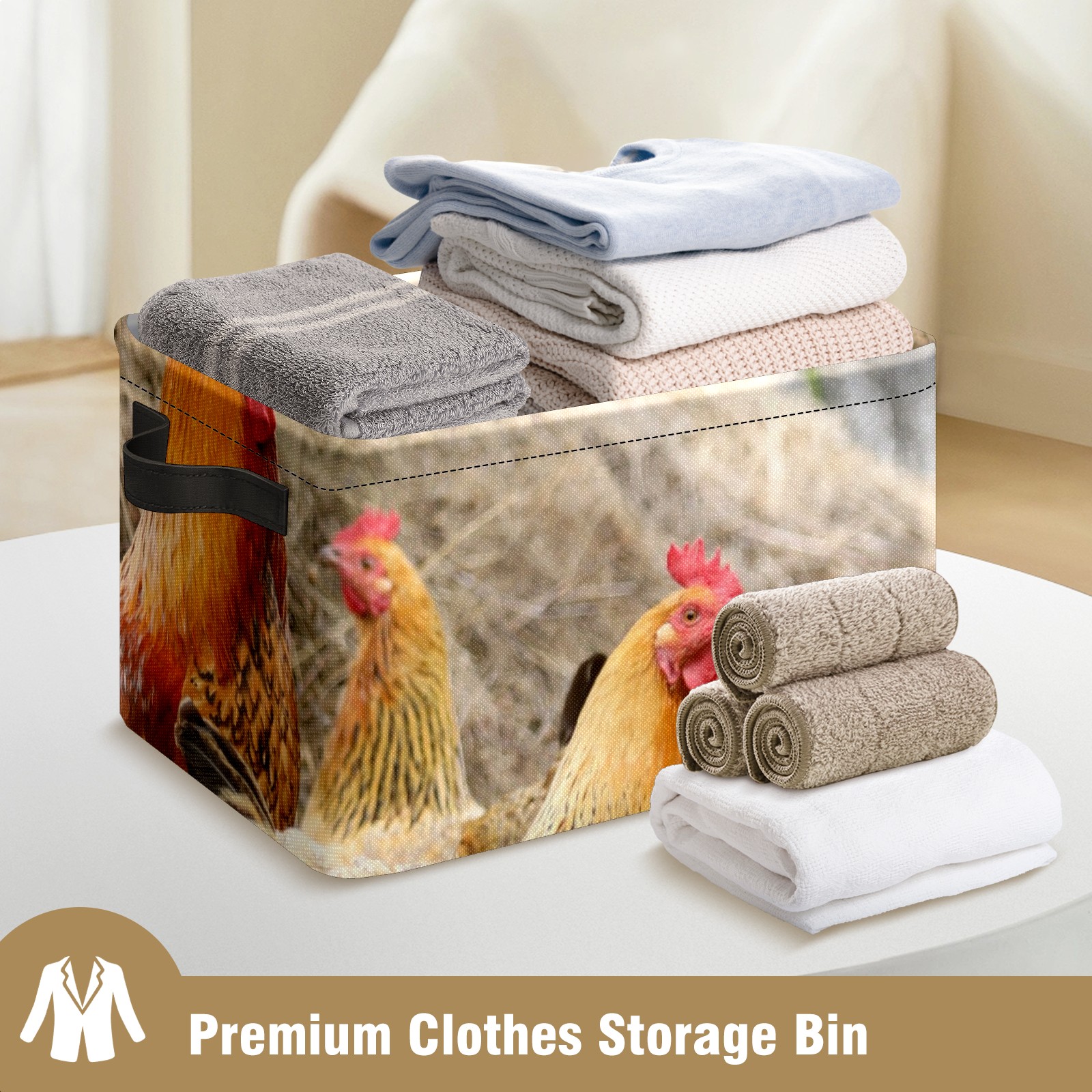 Collapsible 600D Oxford Storage Basket with Rooster Chicken Hen Farm - Metal Frame 10"x14"x8" Reinforced Handles, Multi-Purpose Organizer