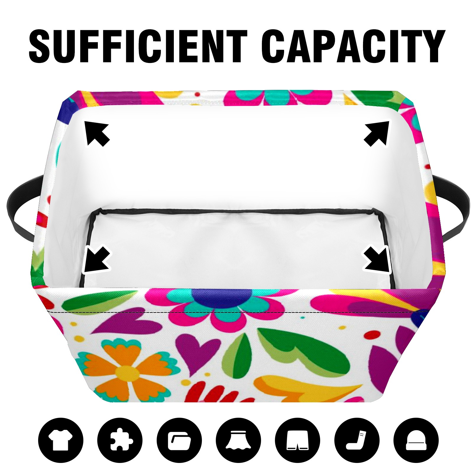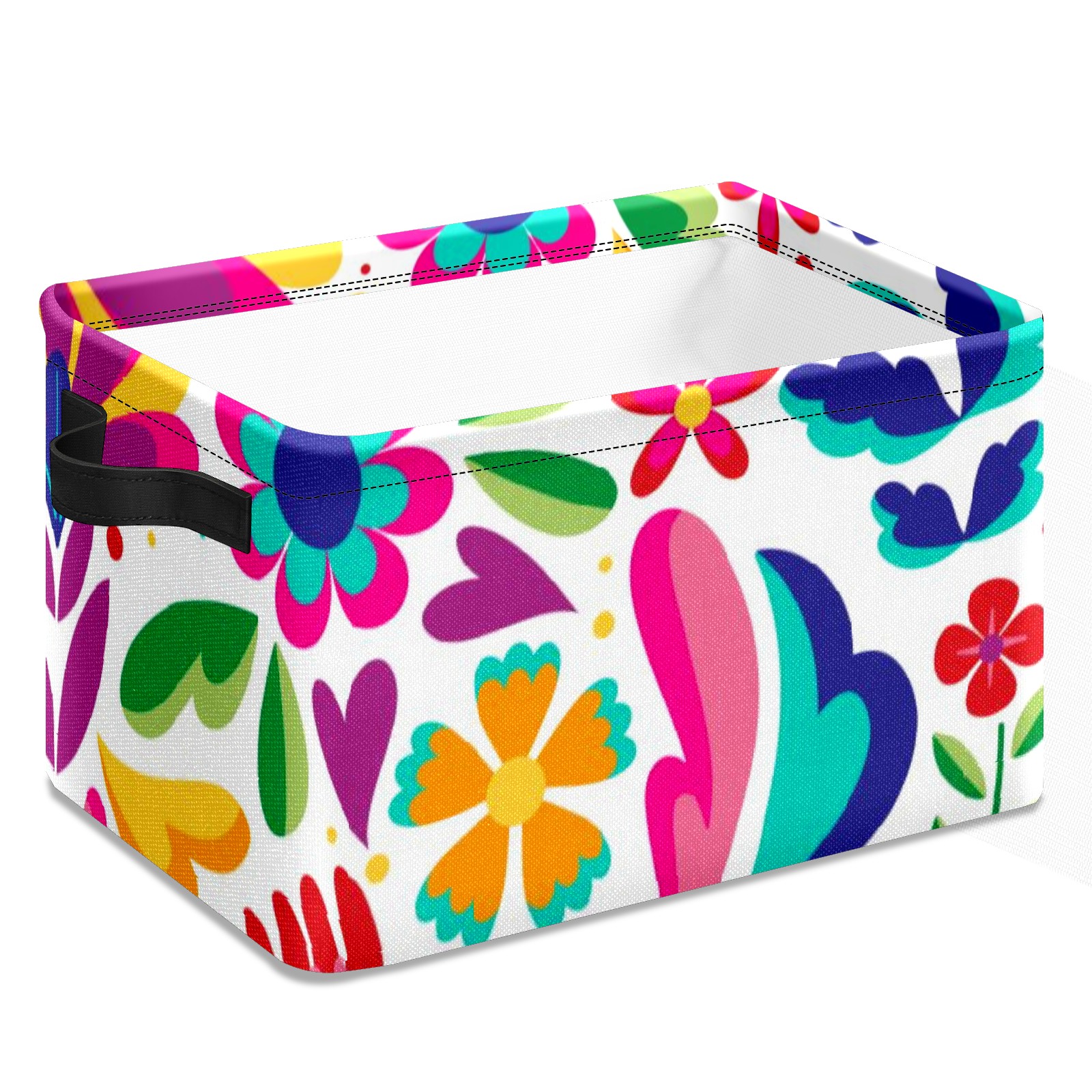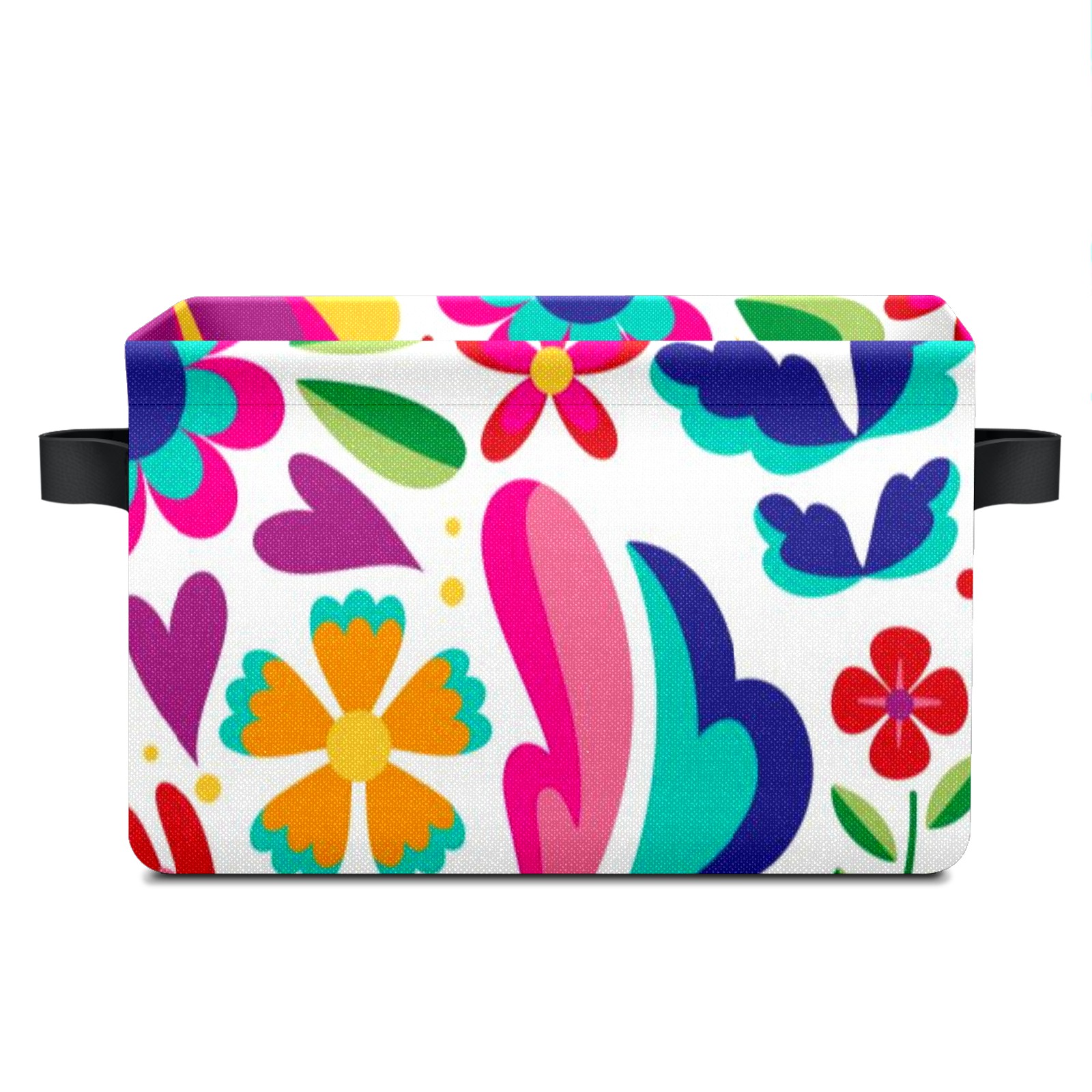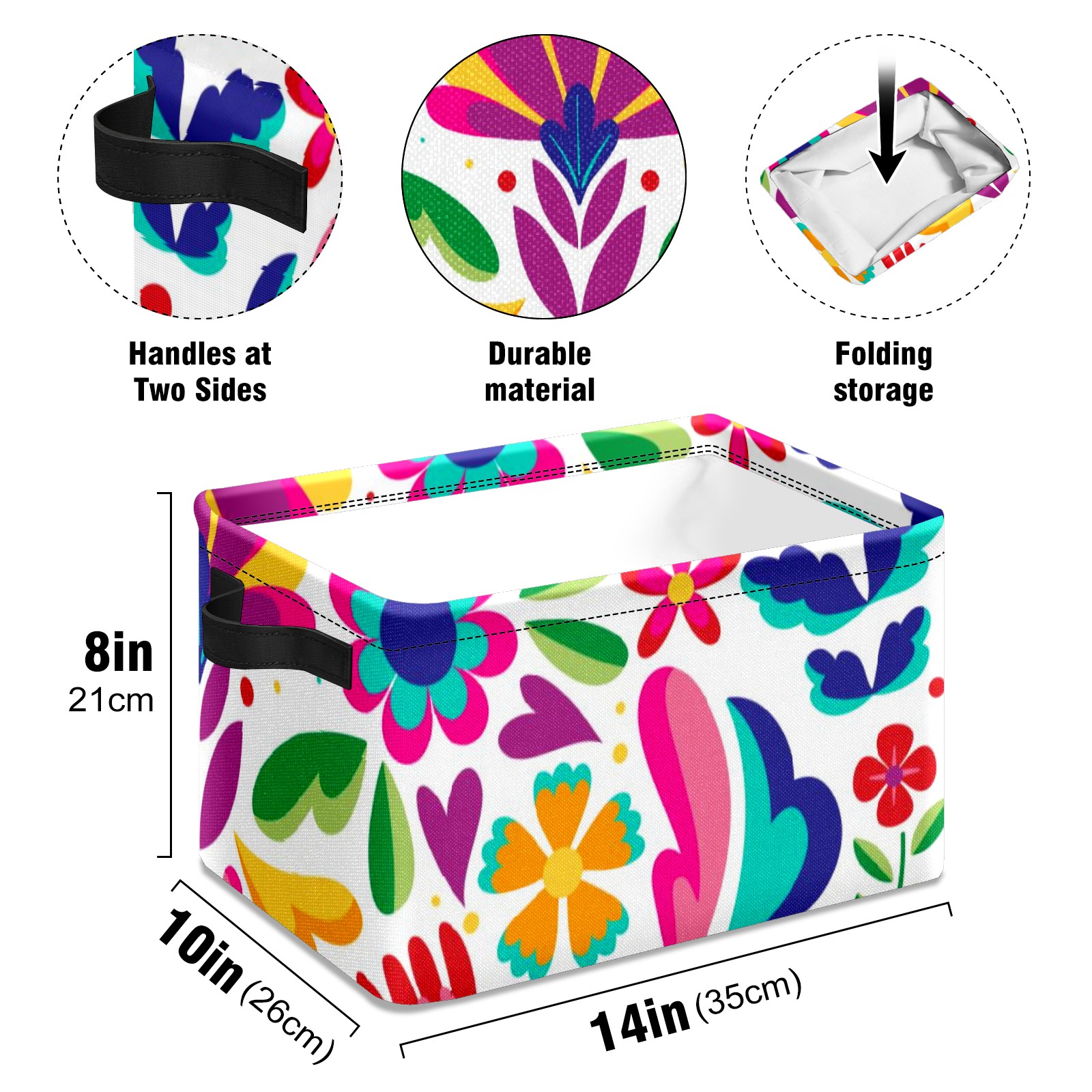 Collapsible 600D Oxford Storage Basket with Spring Mexican Flower Leaf - Metal Frame 10"x14"x8" Reinforced Handles, Multi-Purpose Organizer