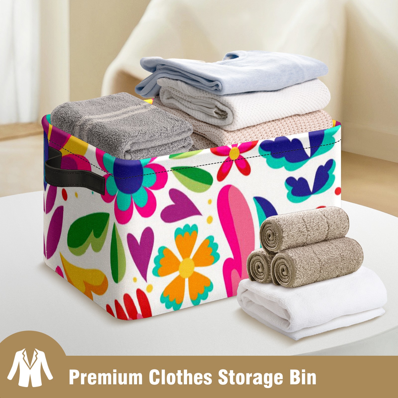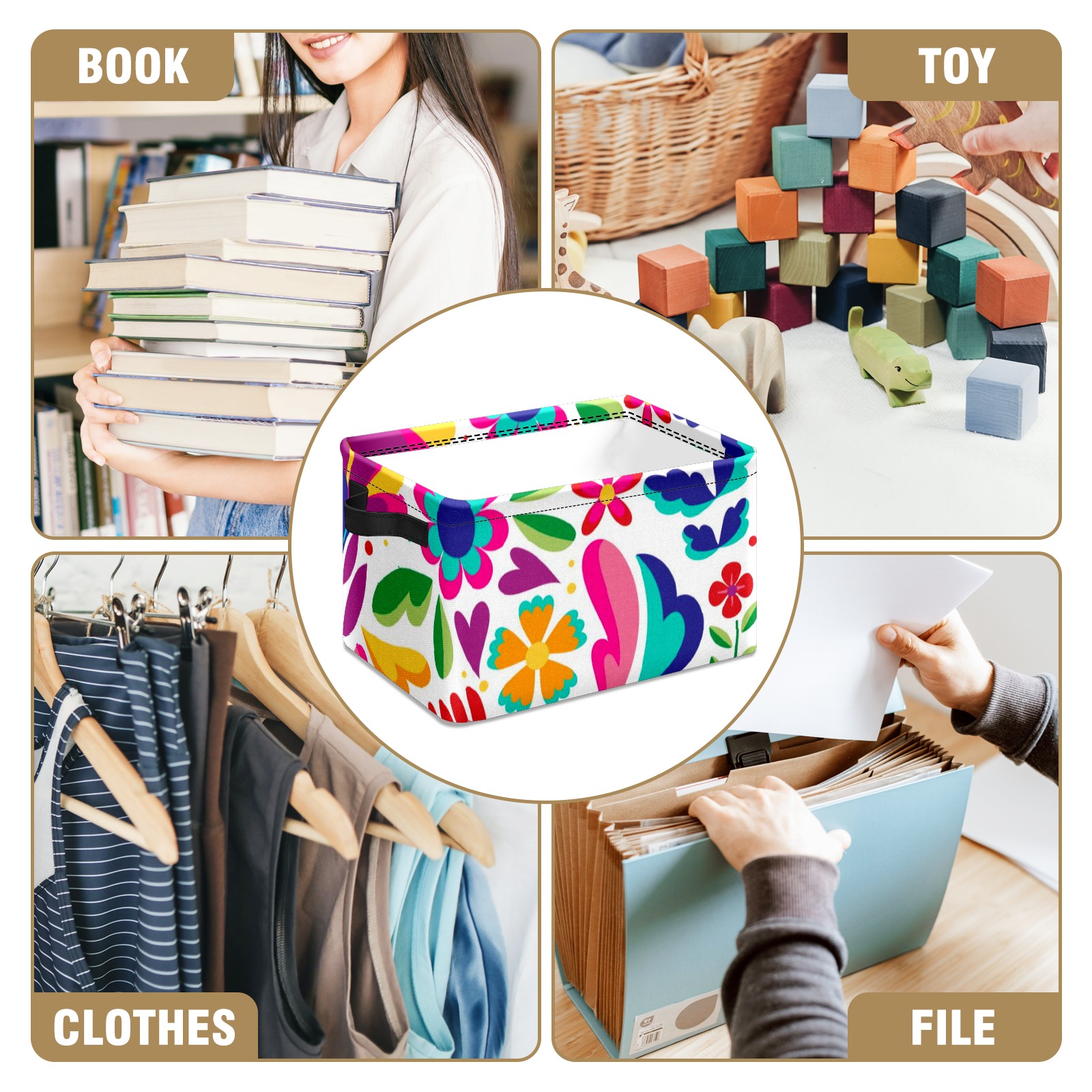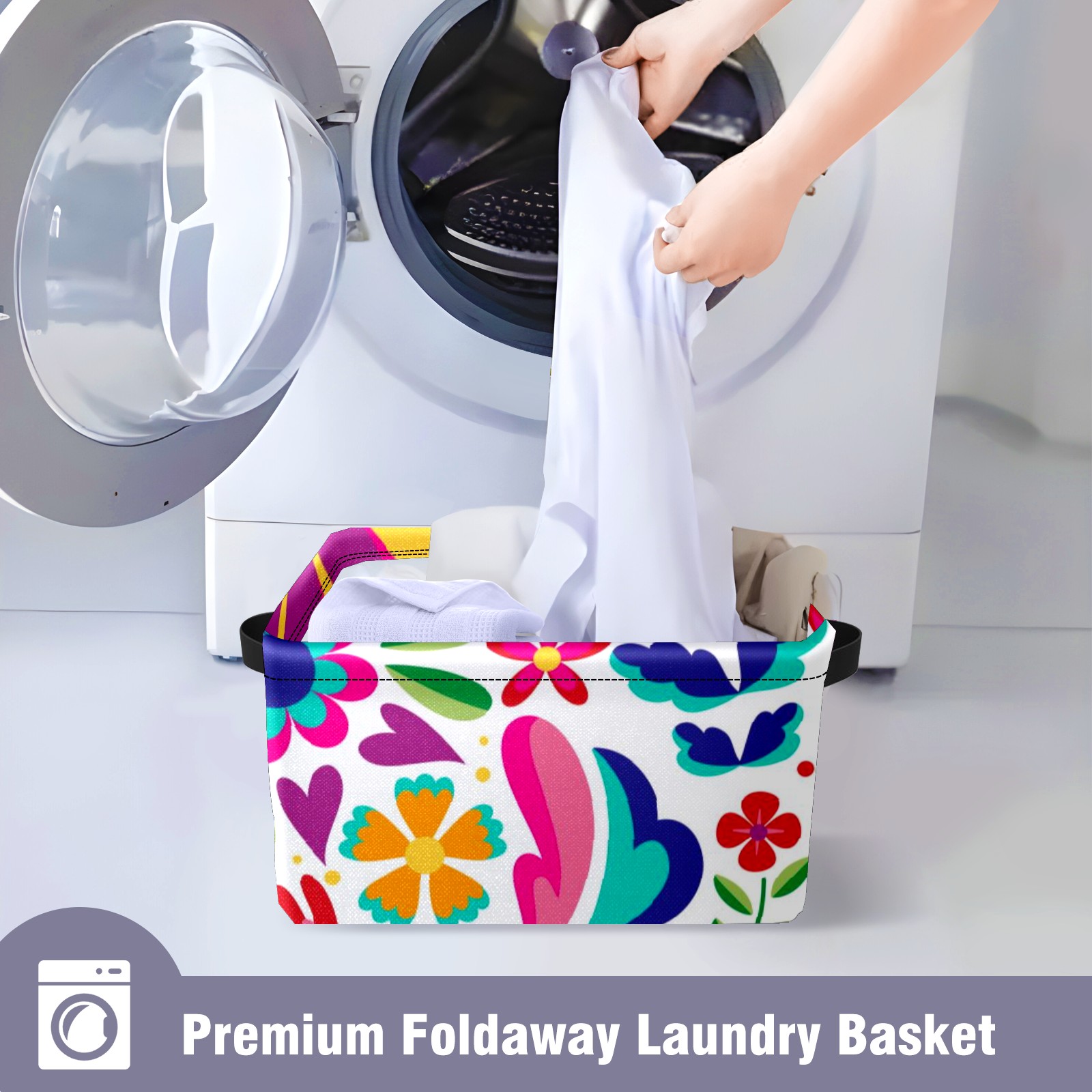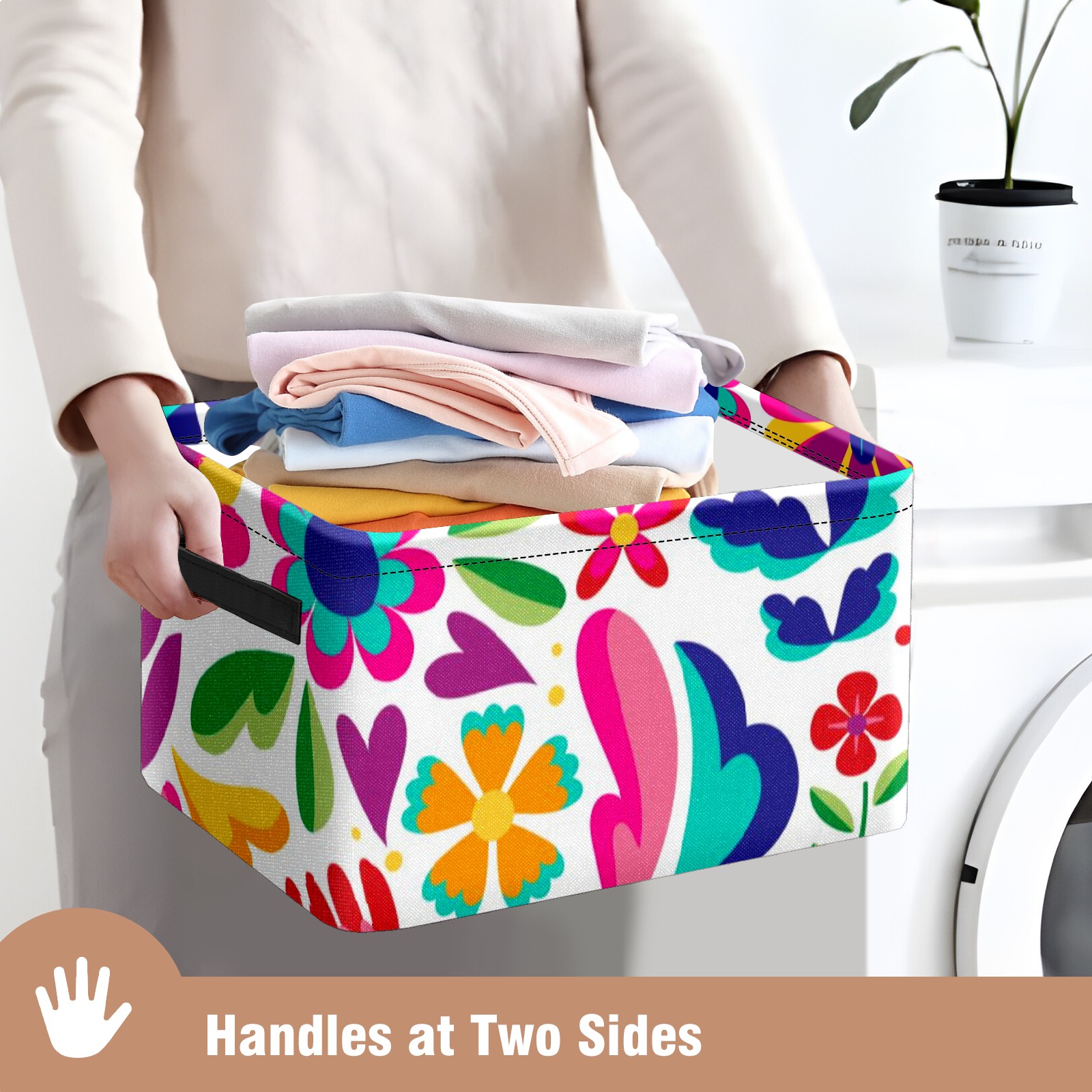 Collapsible 600D Oxford Storage Basket with Spring Mexican Flower Leaf - Metal Frame 10"x14"x8" Reinforced Handles, Multi-Purpose Organizer