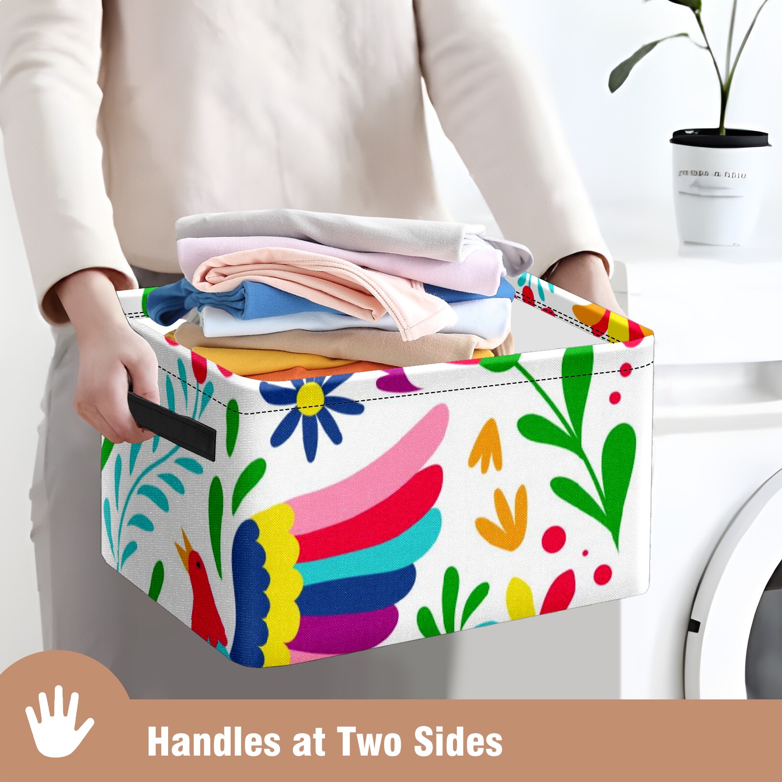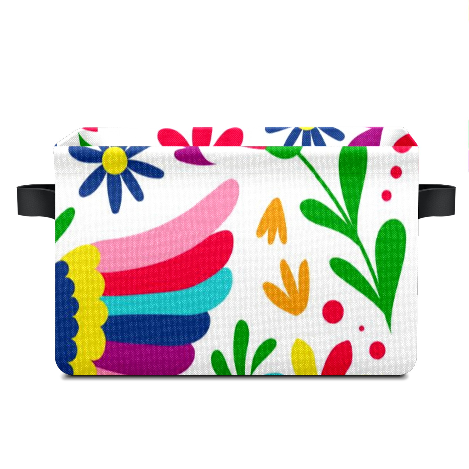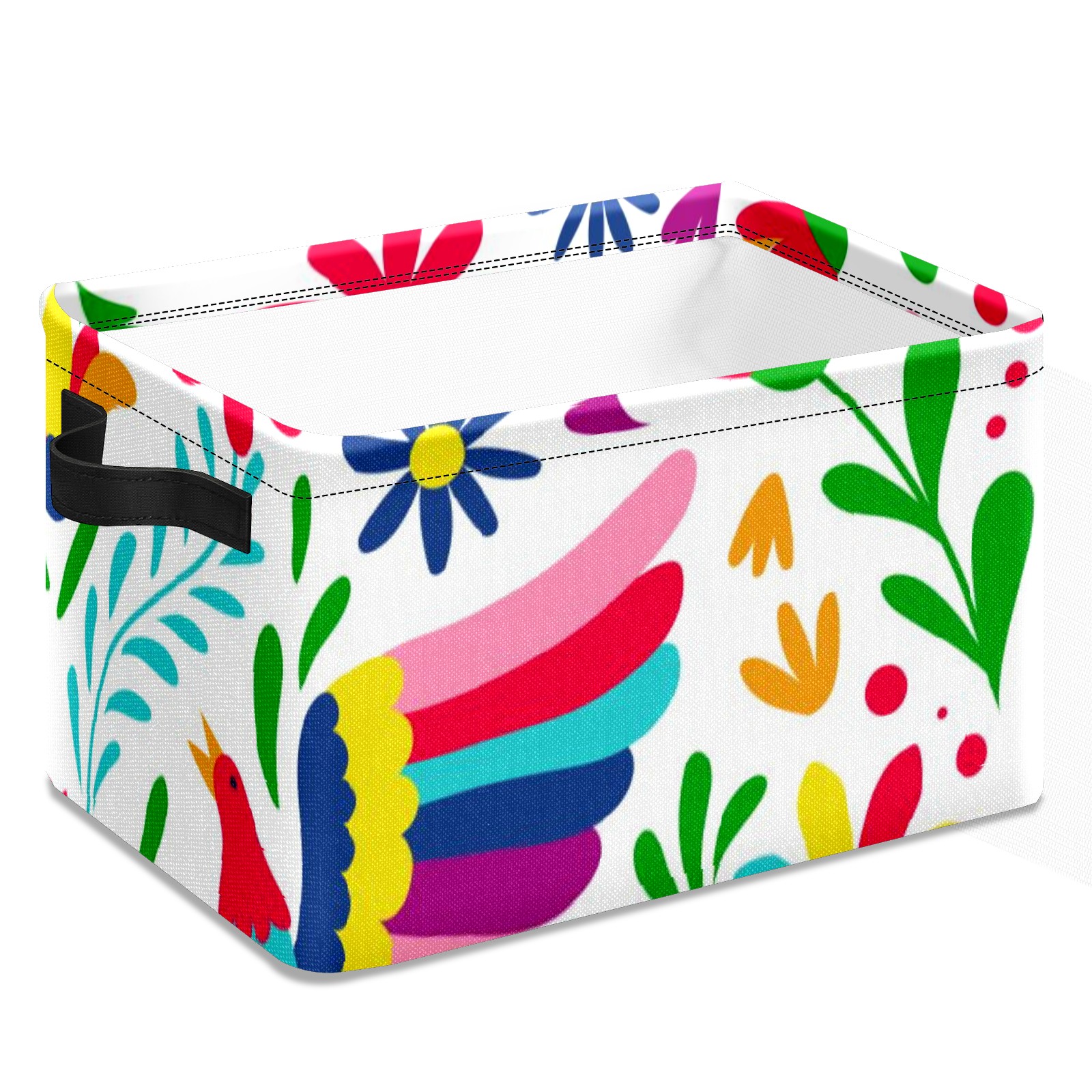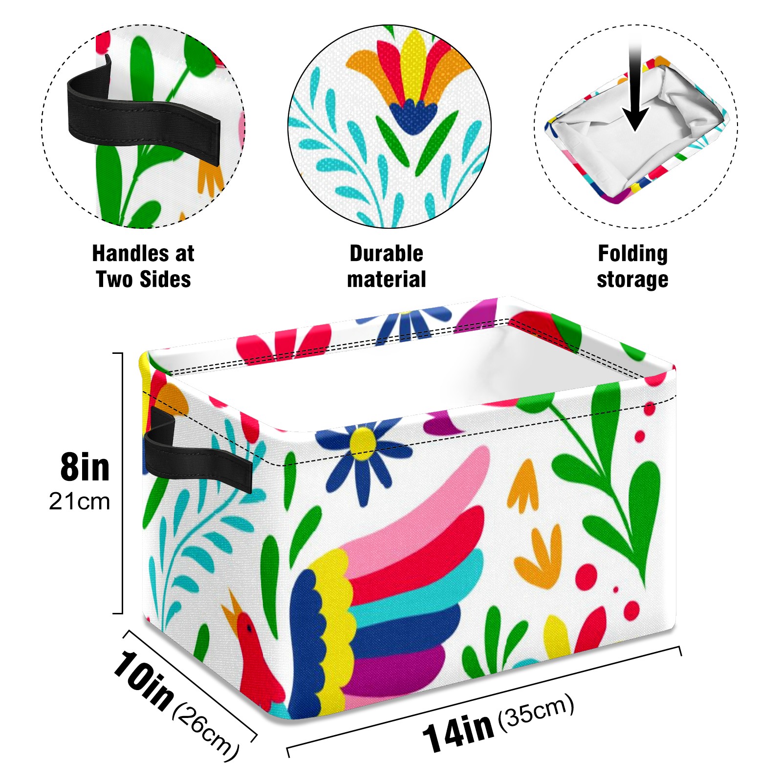 Collapsible 600D Oxford Storage Basket with Spring Mexican Bird Flower Leaves - Metal Frame 10"x14"x8" Reinforced Handles, Multi-Purpose Organizer