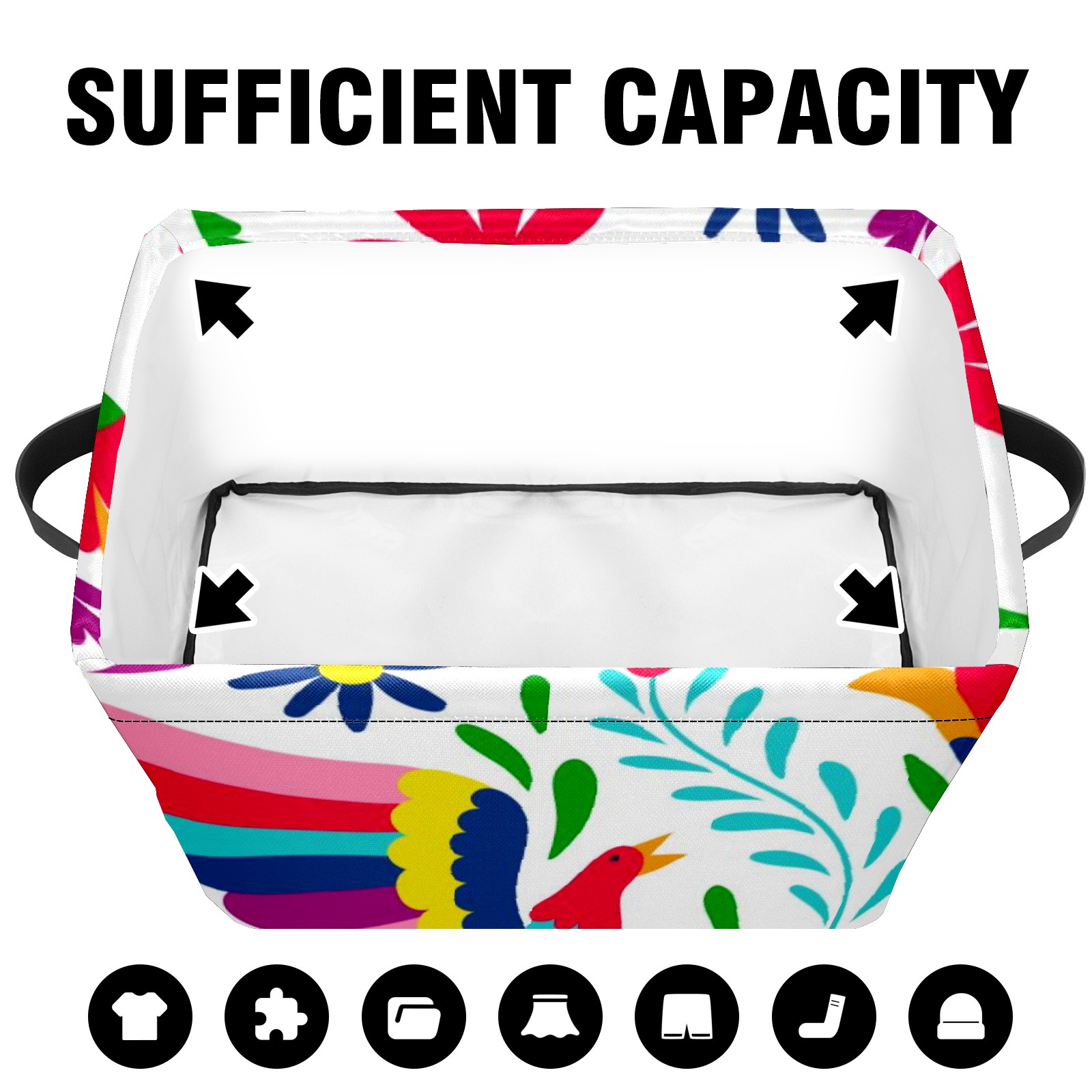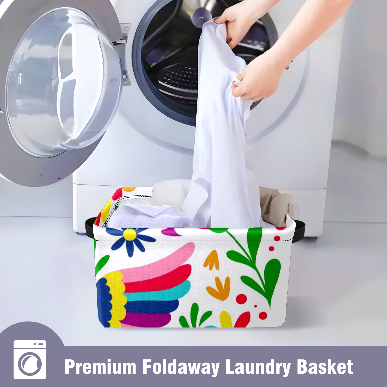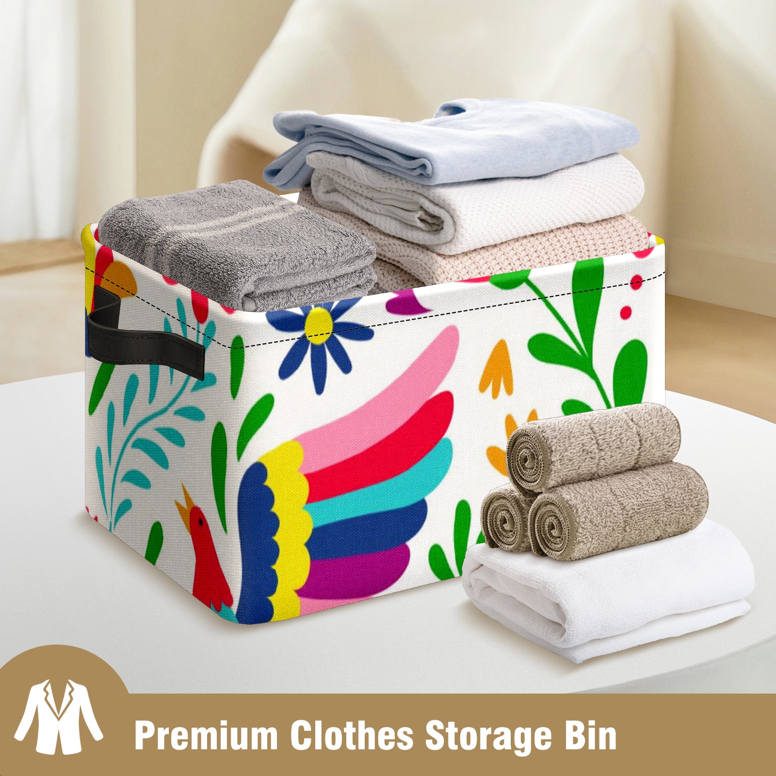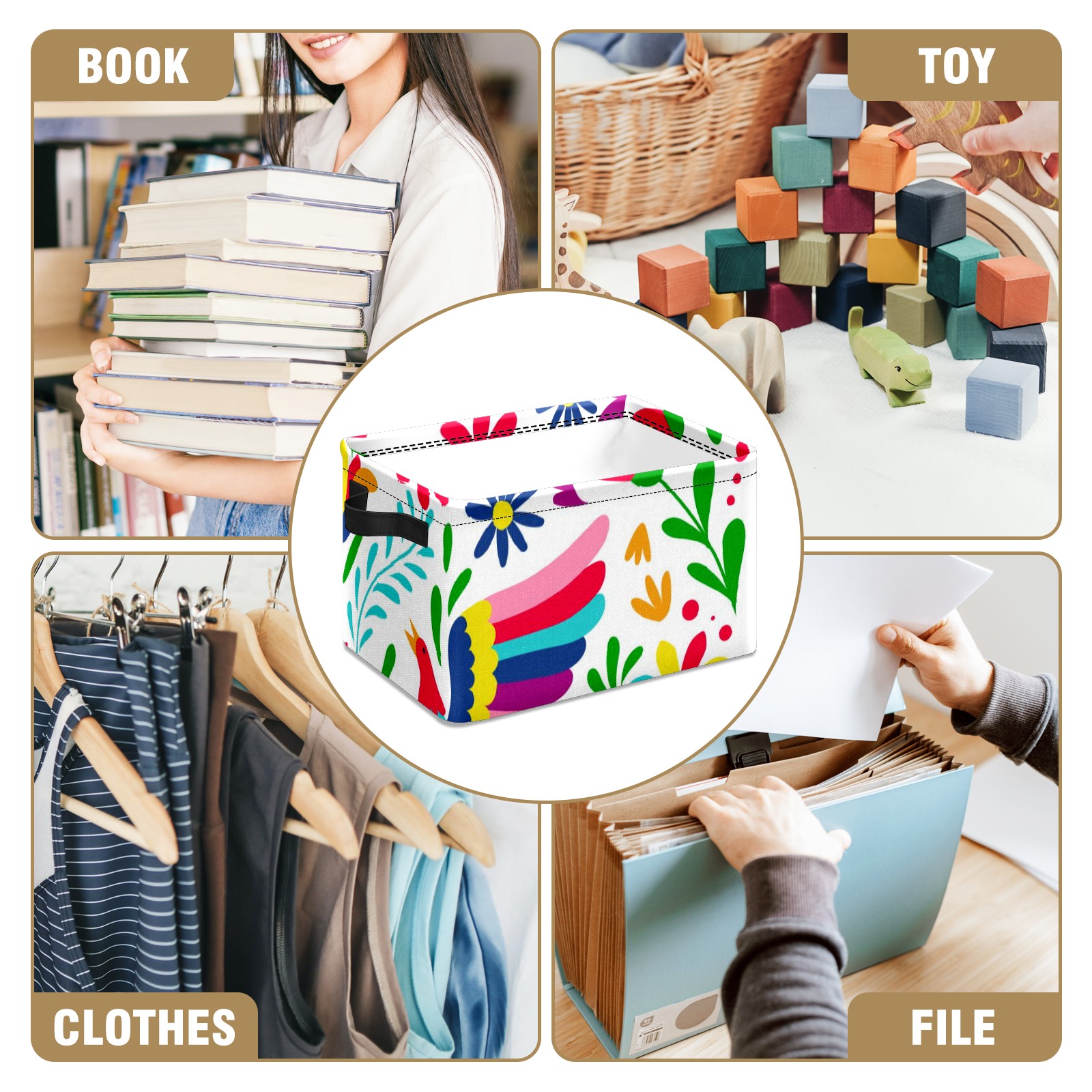 Collapsible 600D Oxford Storage Basket with Spring Mexican Bird Flower Leaves - Metal Frame 10"x14"x8" Reinforced Handles, Multi-Purpose Organizer