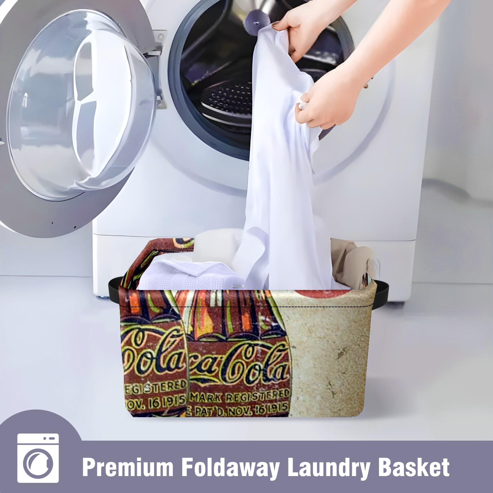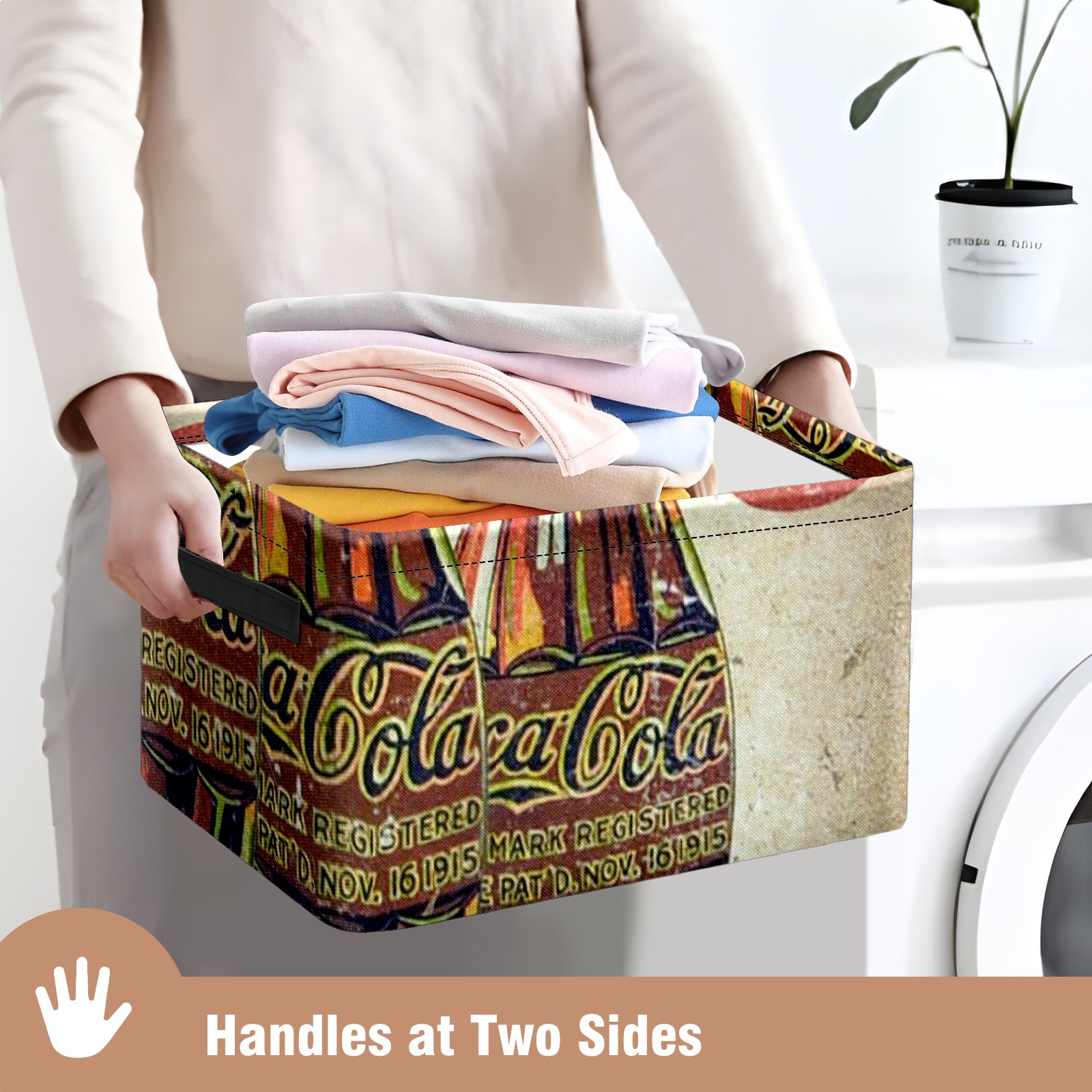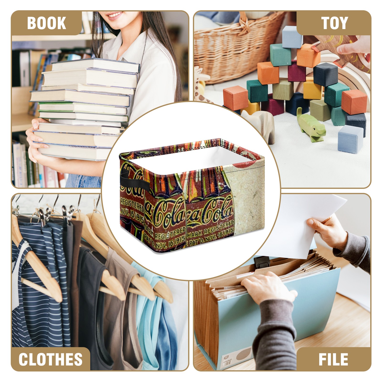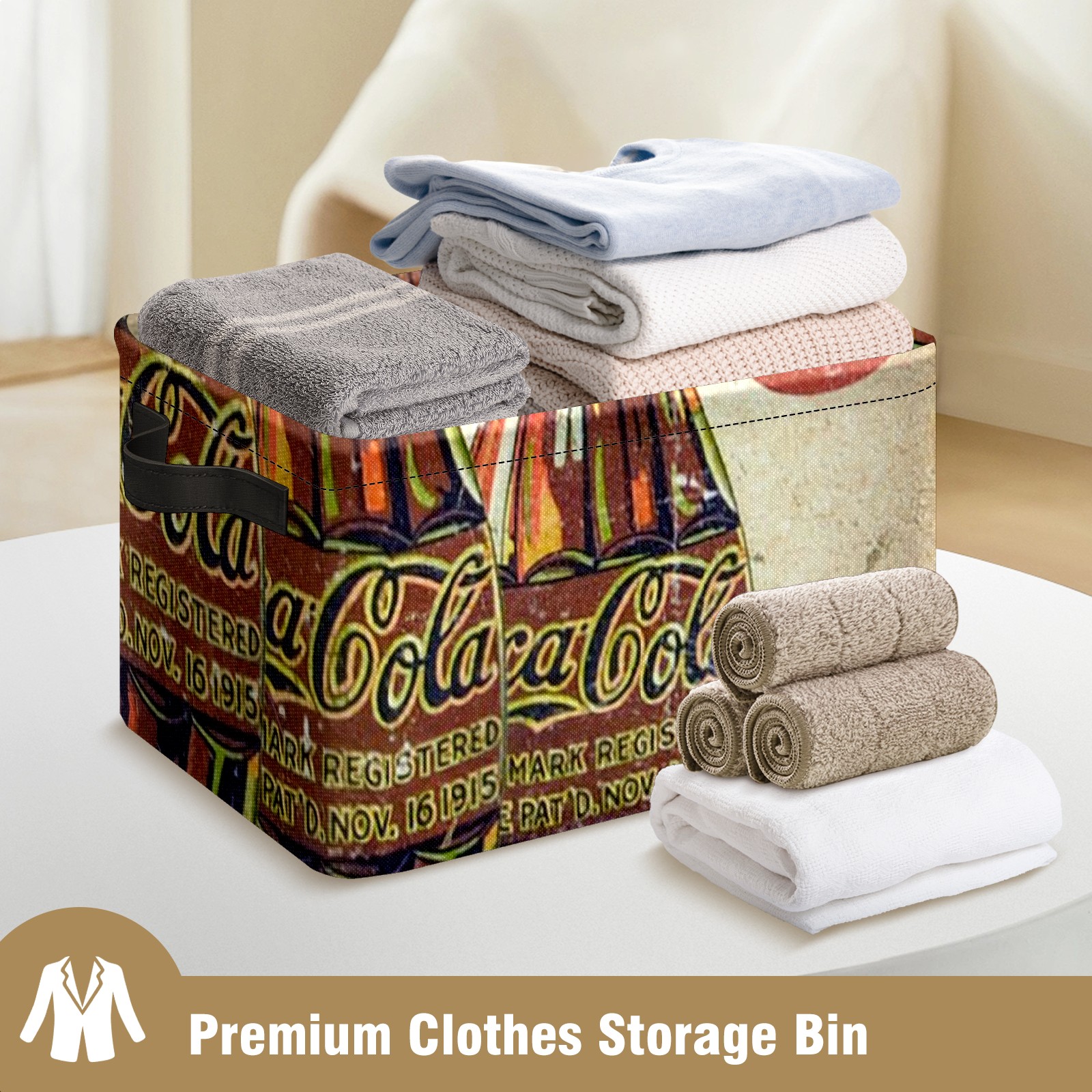Collapsible 600D Oxford Storage Basket with Coke Printing - Metal Frame 10"x14"x8" Reinforced Handles, Multi-Purpose Organizer
