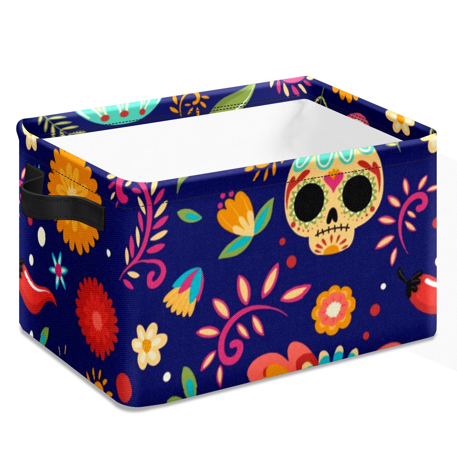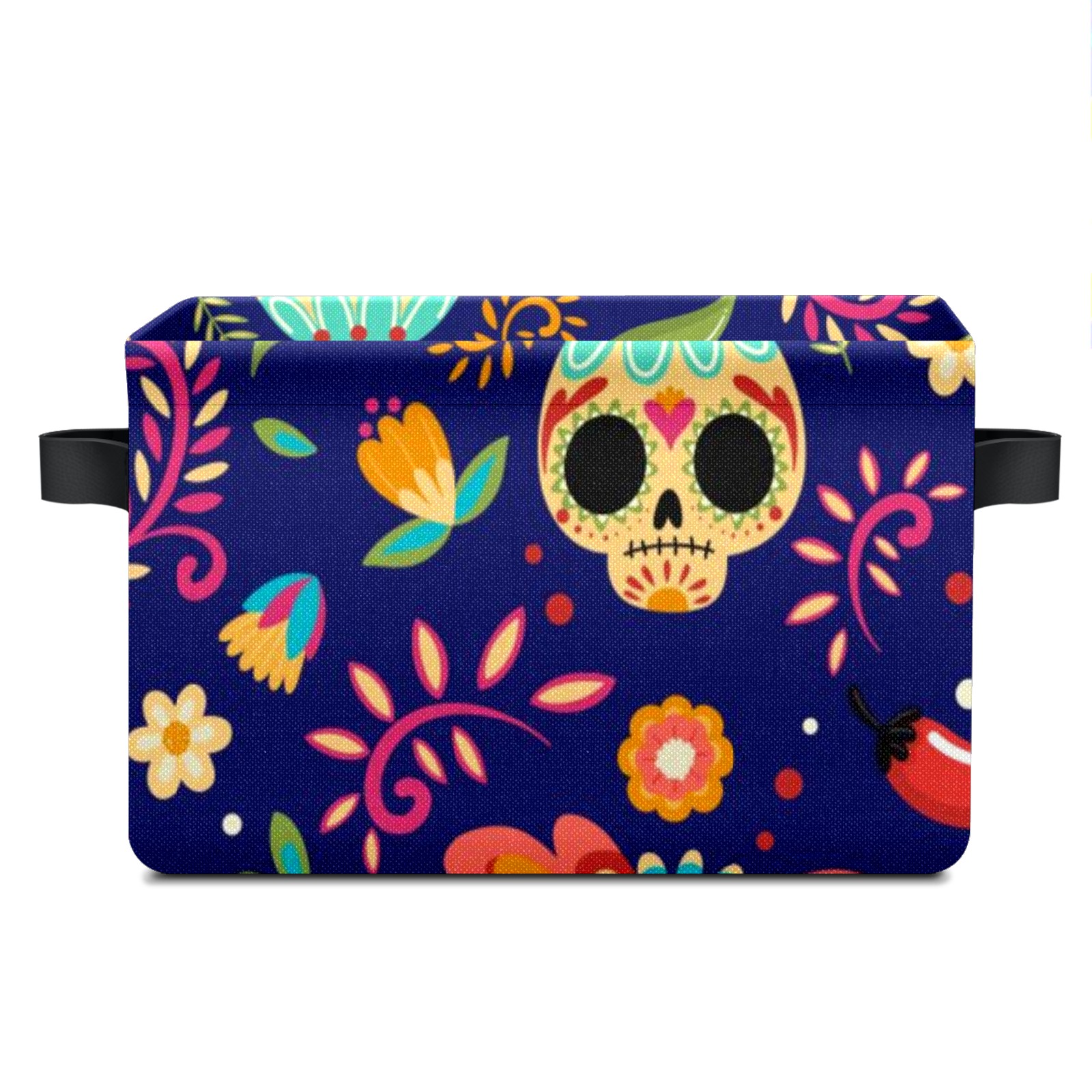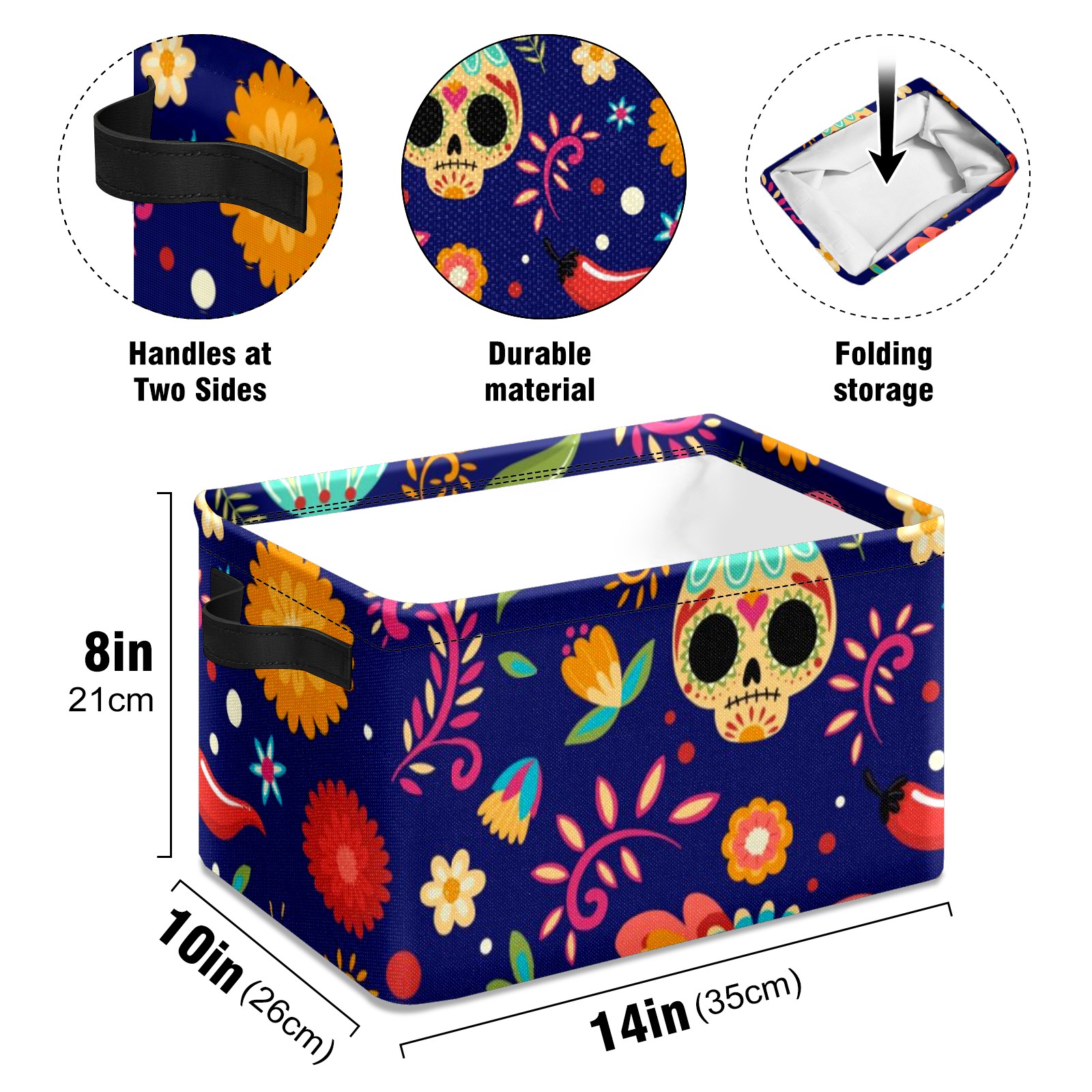 Collapsible 600D Oxford Storage Basket with Sugar Skull Floral - Metal Frame 10"x14"x8" Reinforced Handles, Multi-Purpose Organizer
