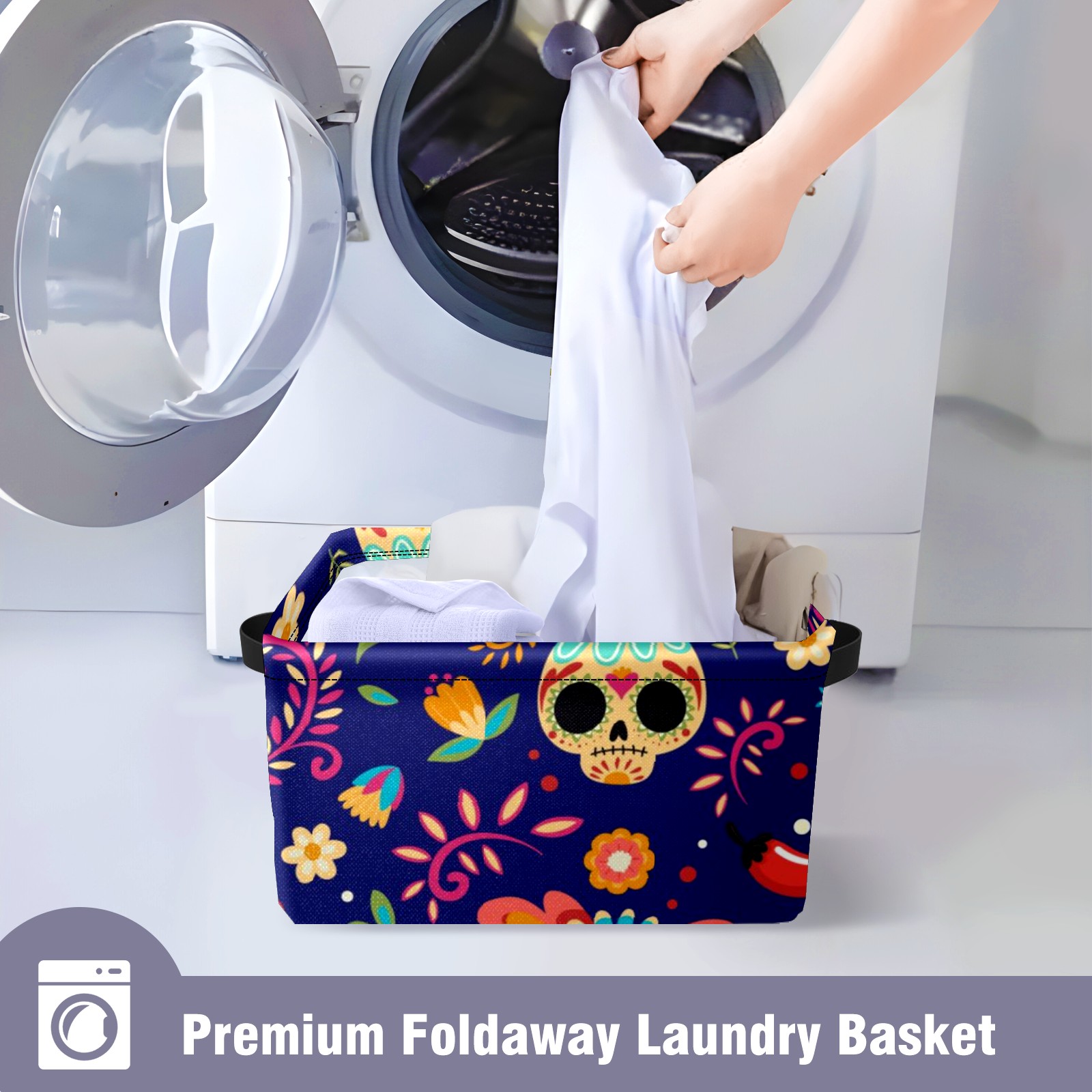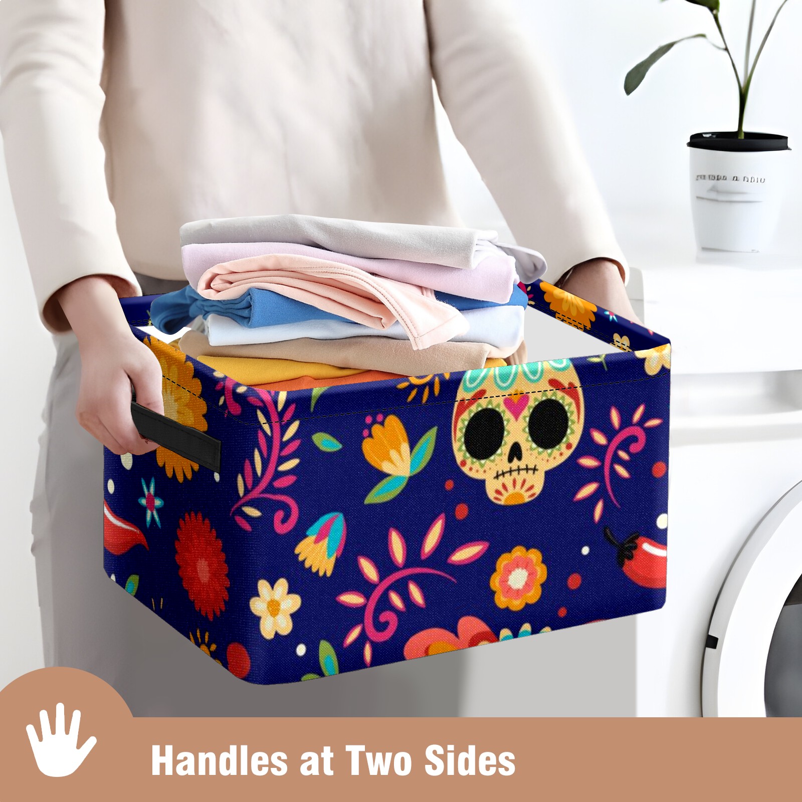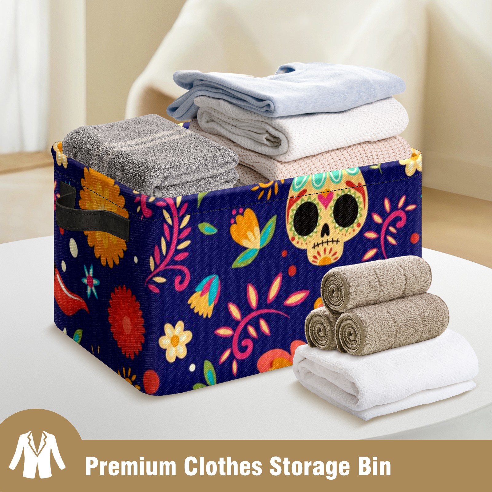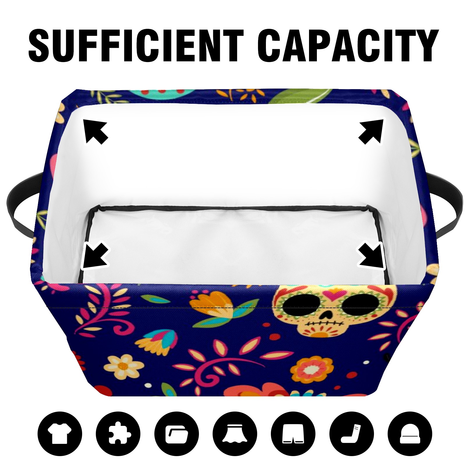 Collapsible 600D Oxford Storage Basket with Sugar Skull Floral - Metal Frame 10"x14"x8" Reinforced Handles, Multi-Purpose Organizer