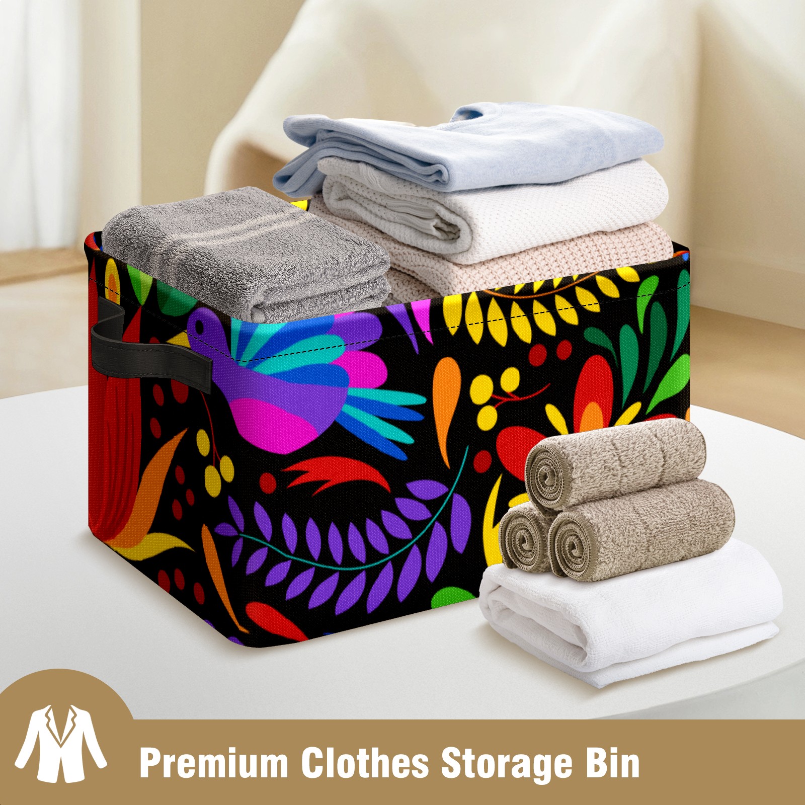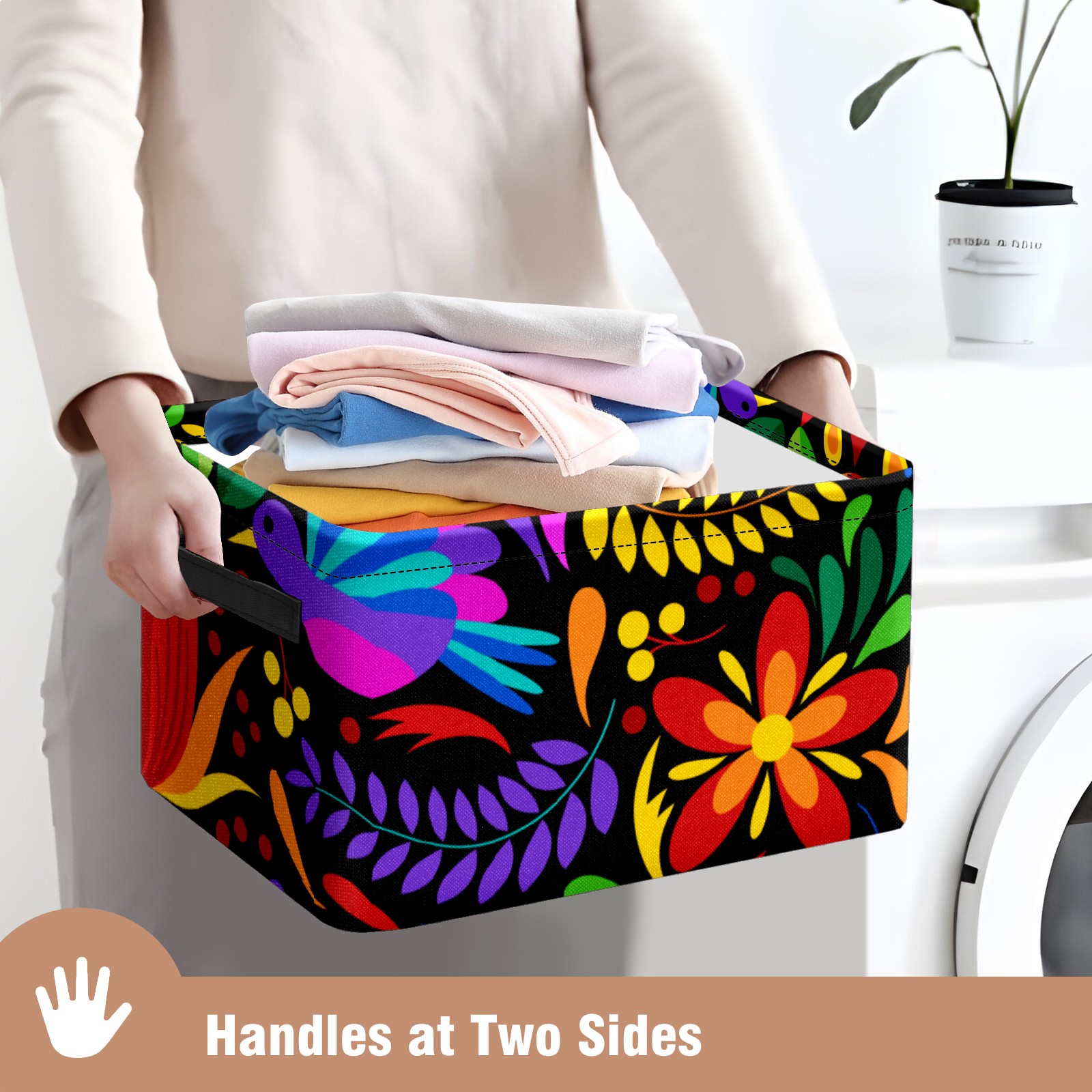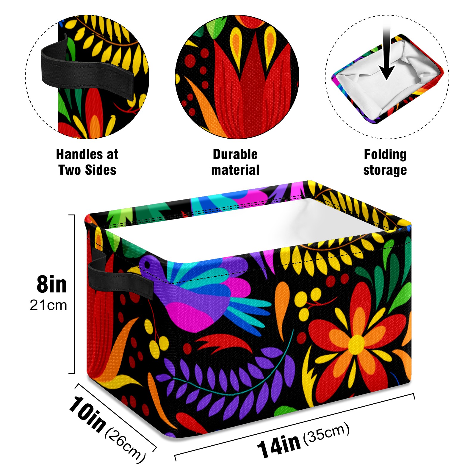 Collapsible 600D Oxford Storage Basket with Mexican Folk Bird Flower Leaves - Metal Frame 10"x14"x8" Reinforced Handles, Multi-Purpose Organizer