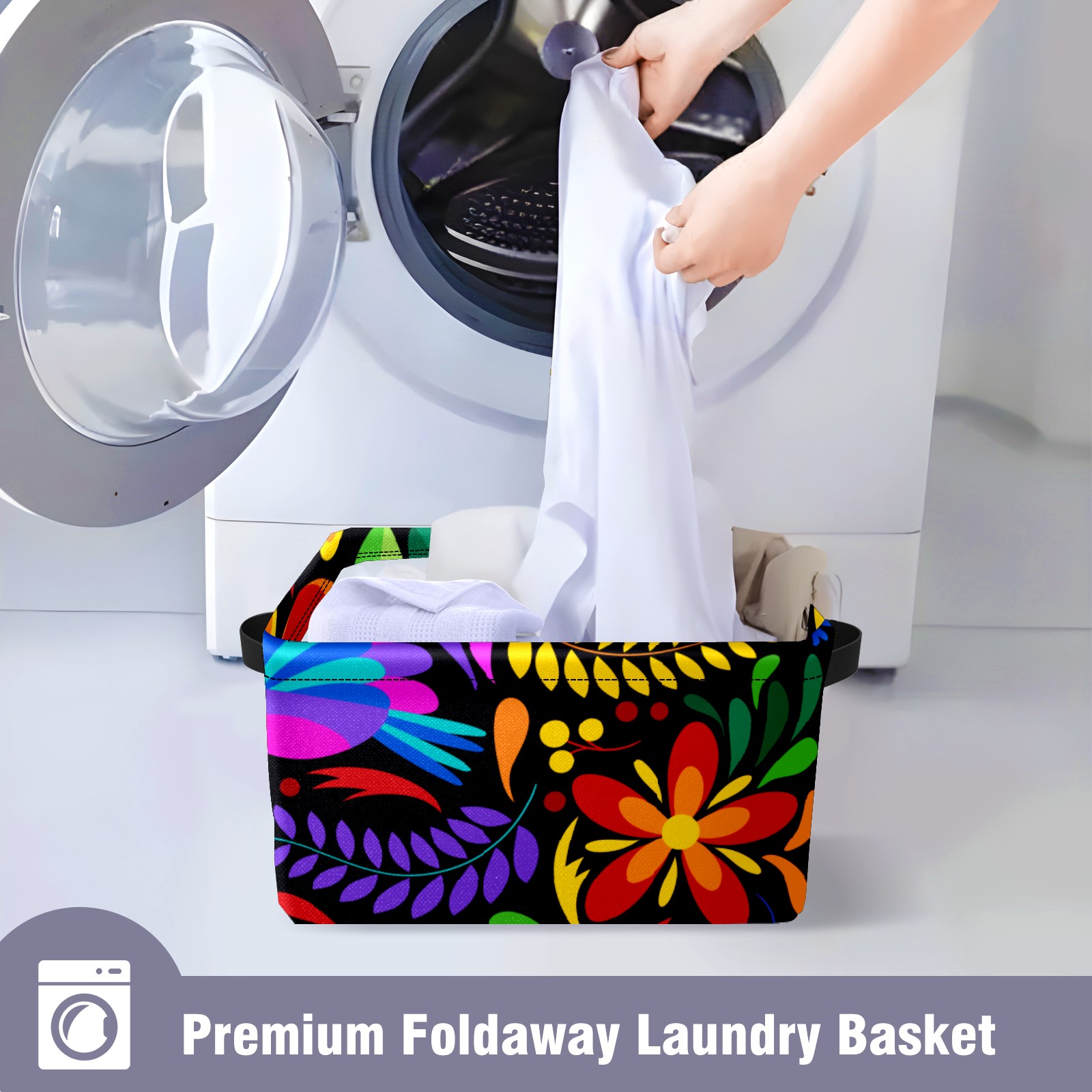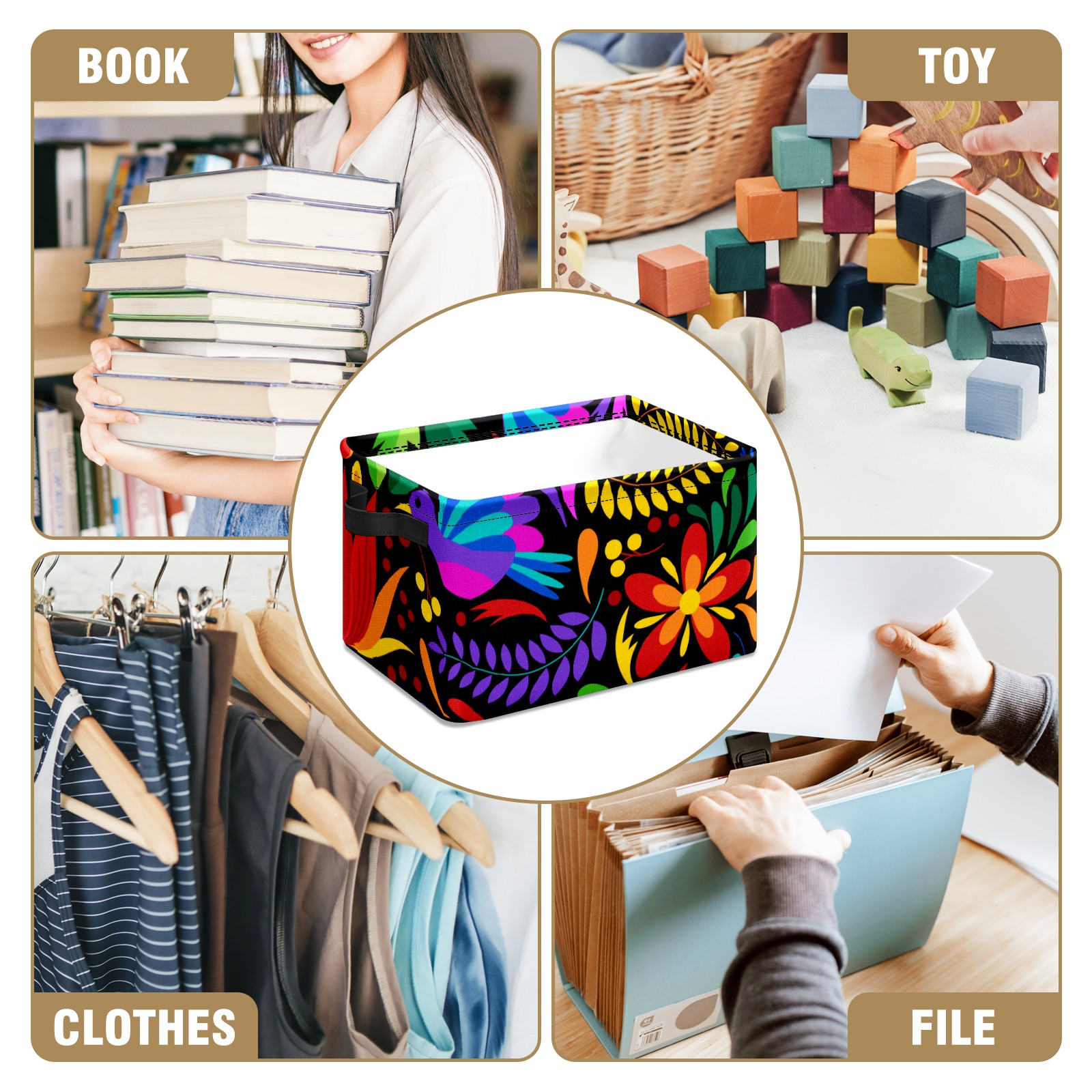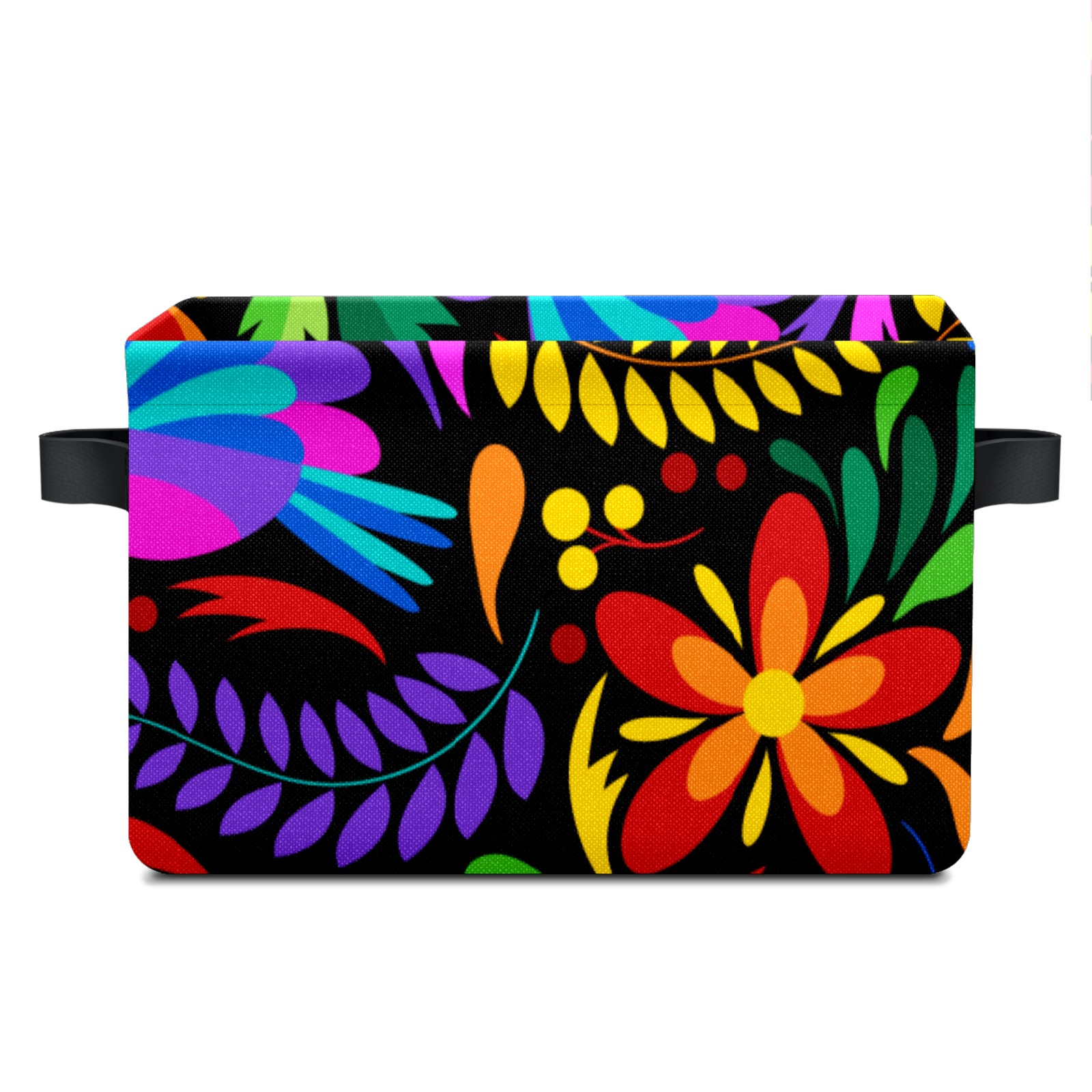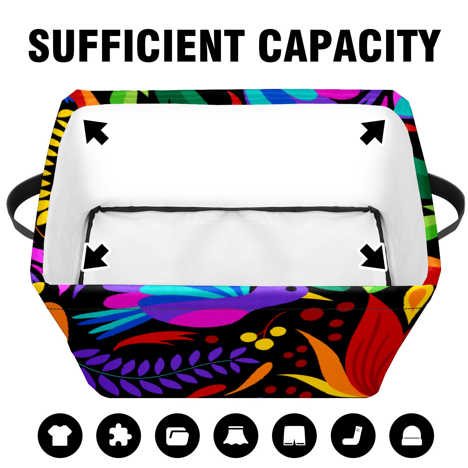 Collapsible 600D Oxford Storage Basket with Mexican Folk Bird Flower Leaves - Metal Frame 10"x14"x8" Reinforced Handles, Multi-Purpose Organizer