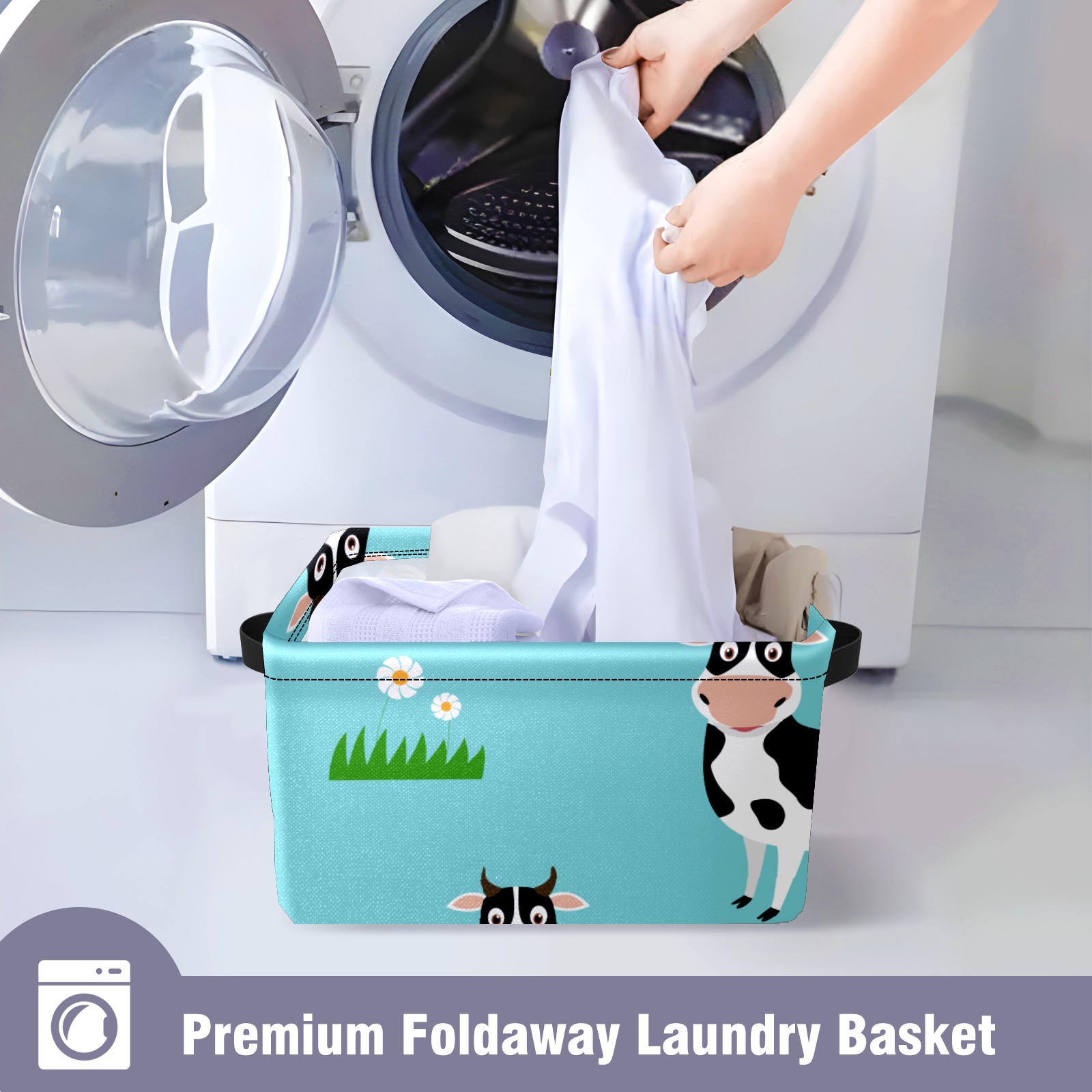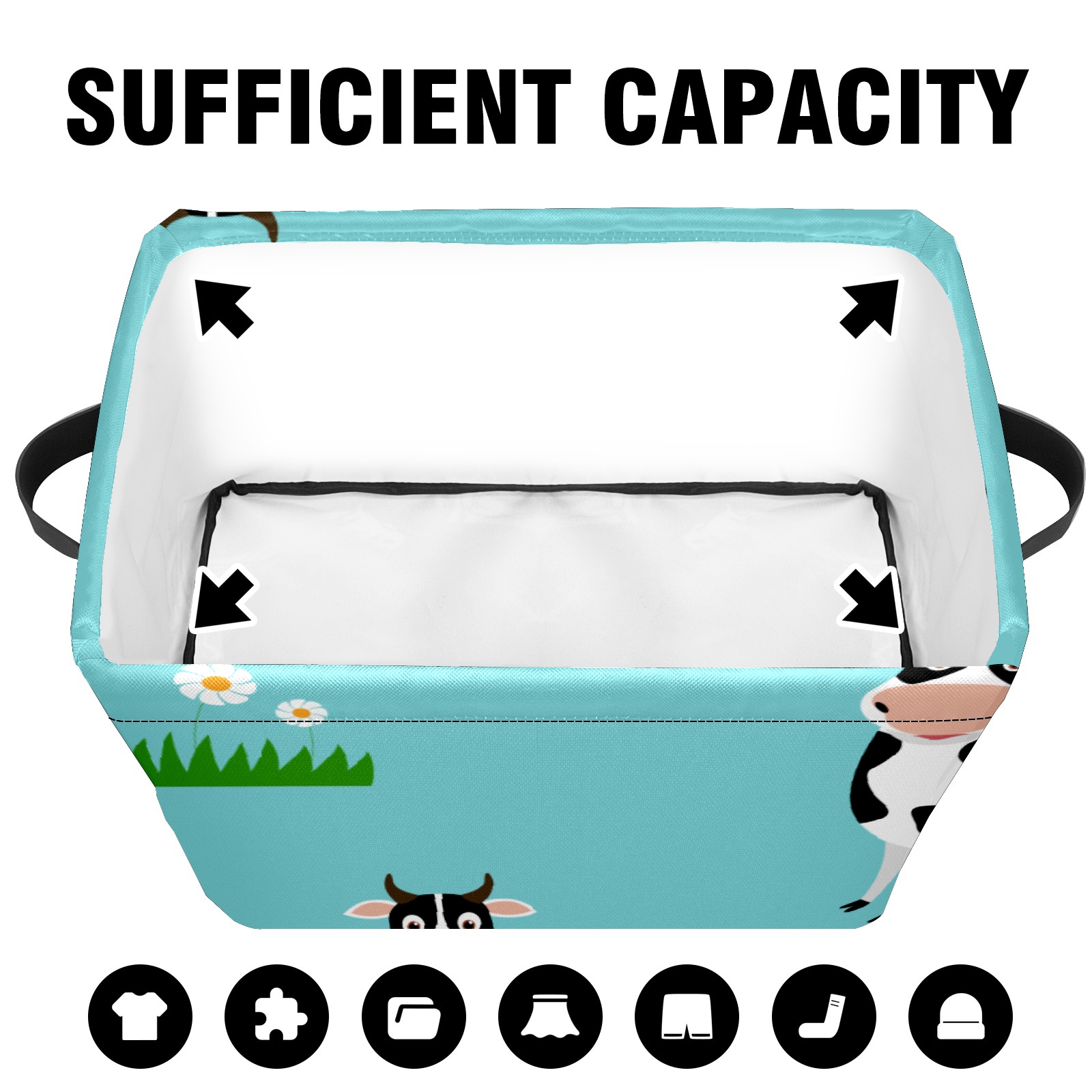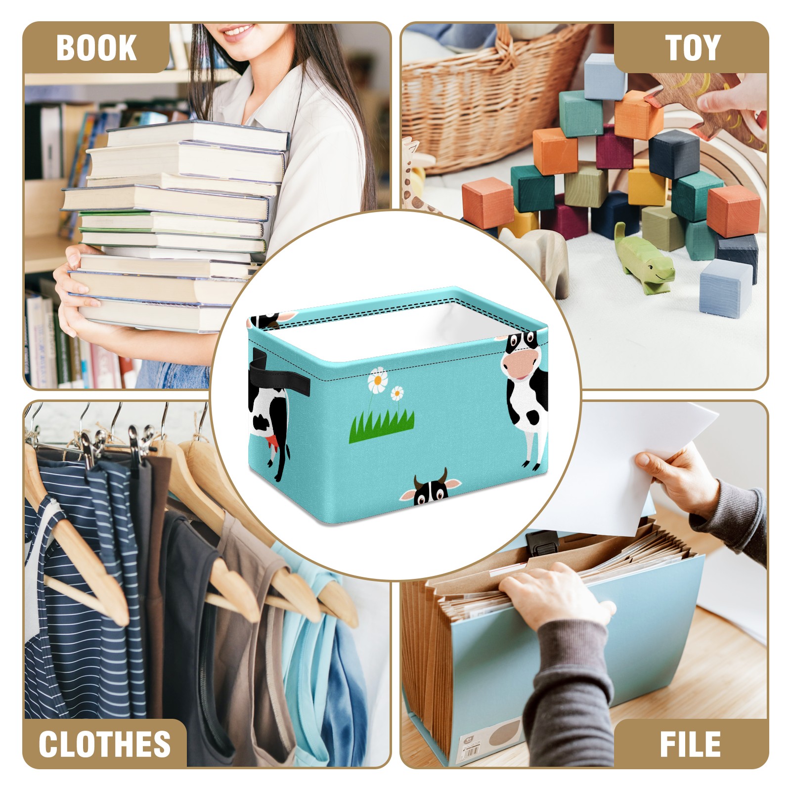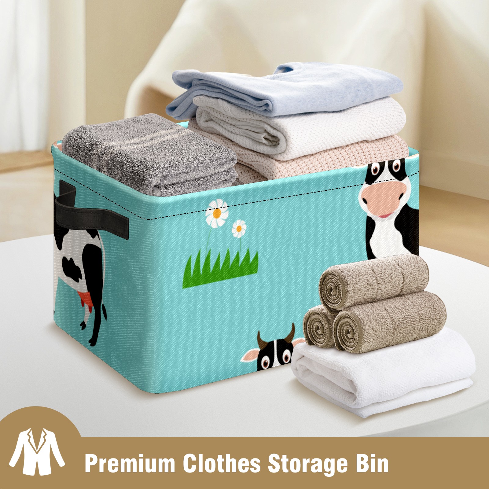 Collapsible 600D Oxford Storage Basket with Cute Cow - Metal Frame 10"x14"x8" Reinforced Handles, Multi-Purpose Organizer