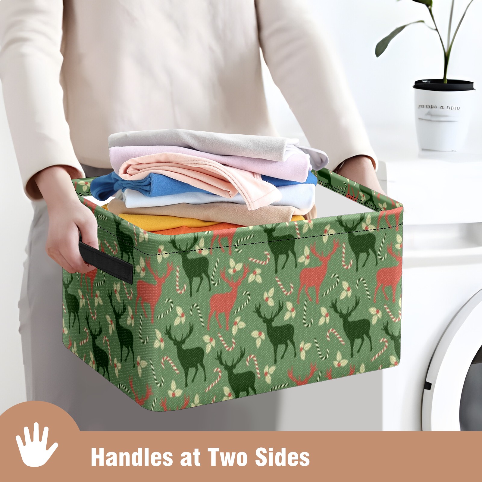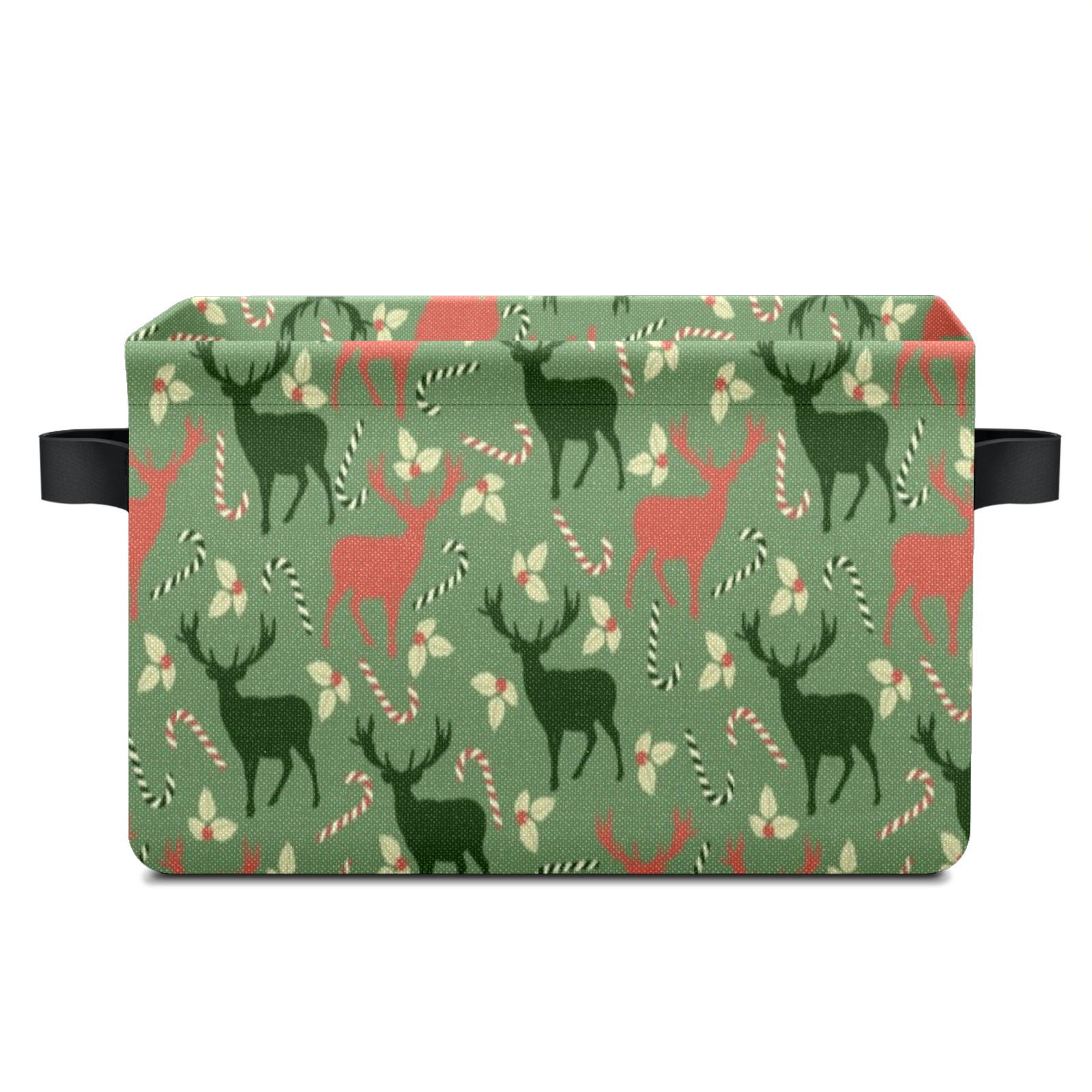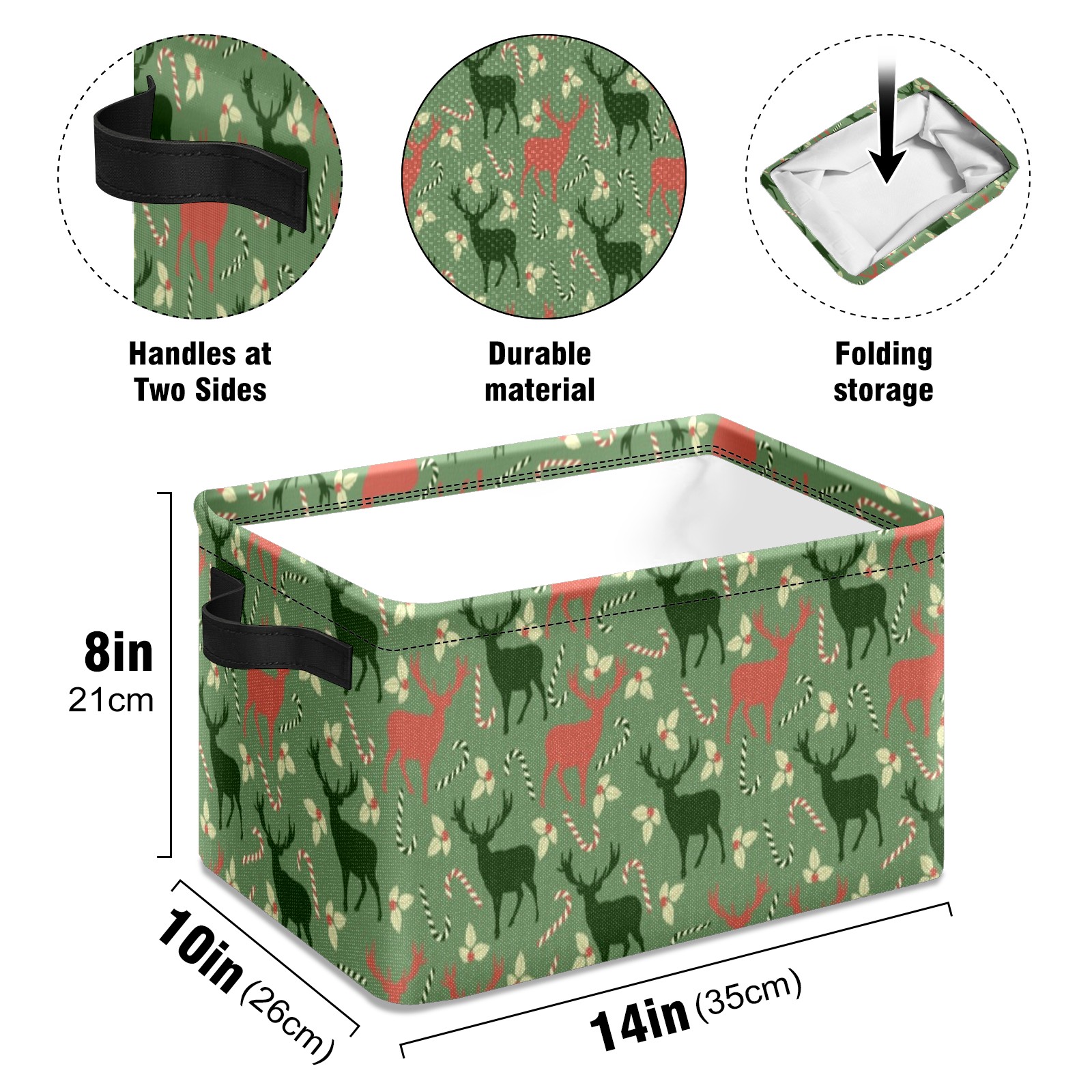Collapsible 600D Oxford Storage Basket with Green And Red Reindeer - Metal Frame 10"x14"x8" Reinforced Handles, Multi-Purpose Organizer