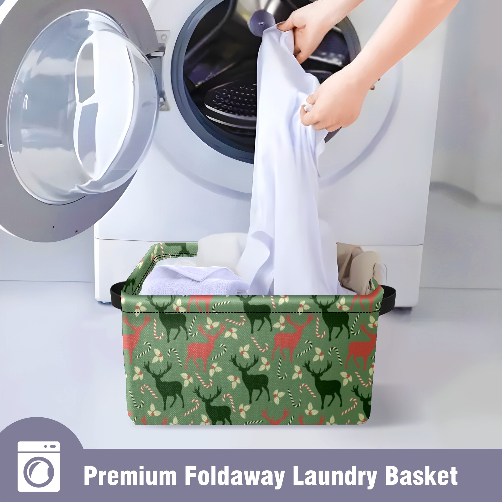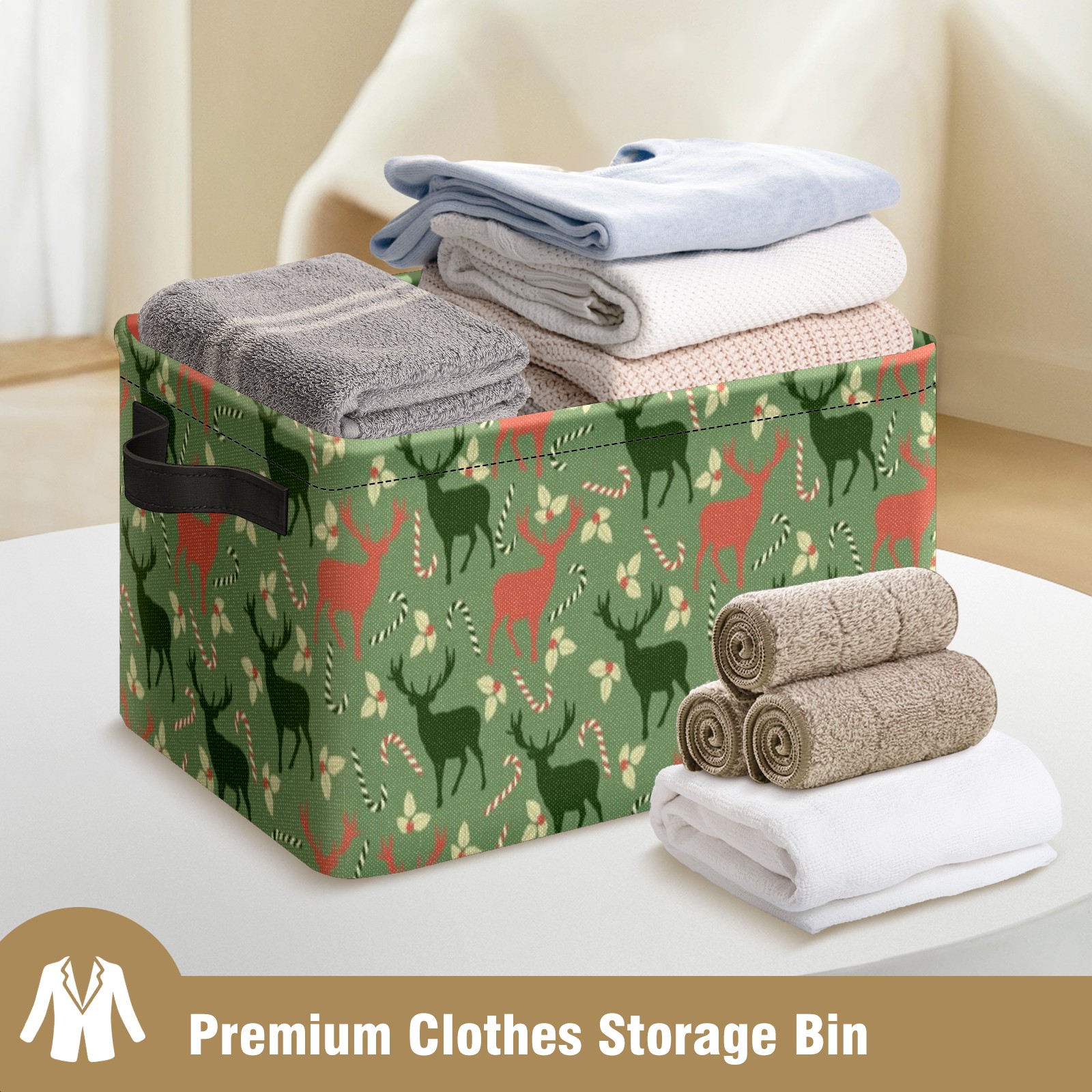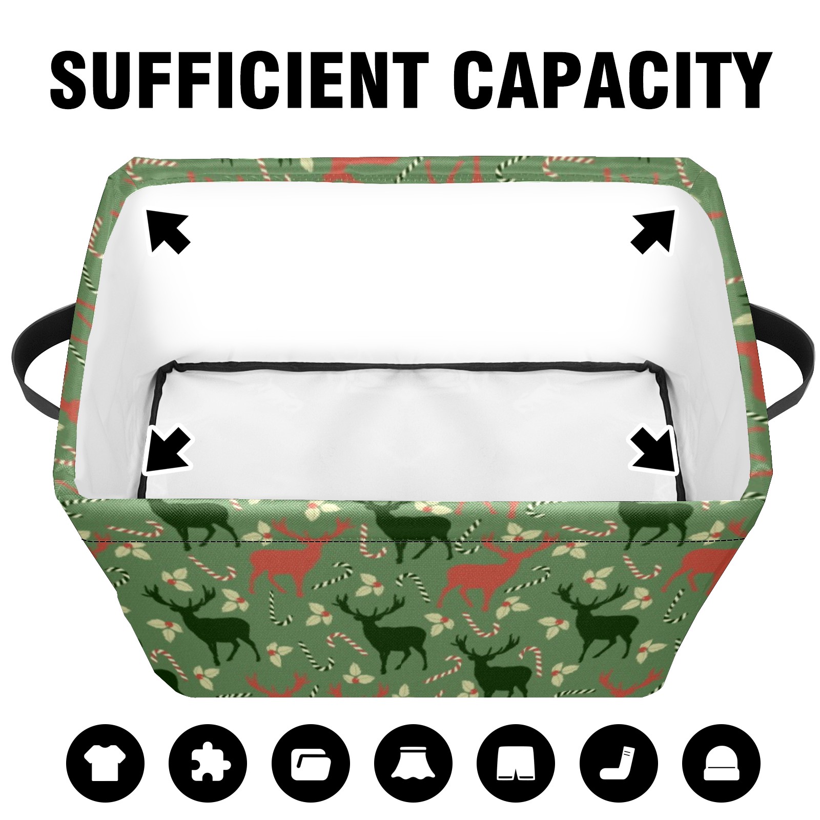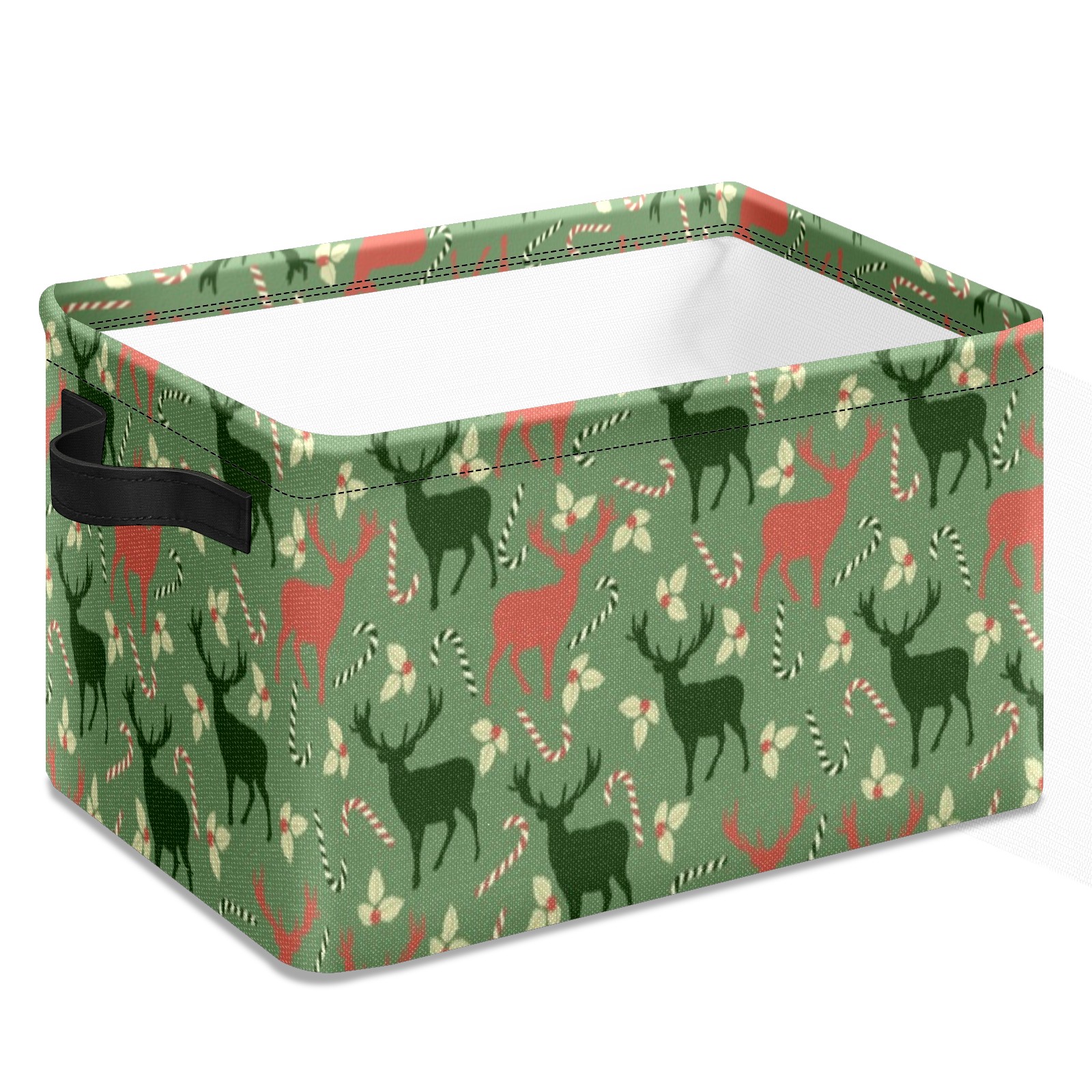 Collapsible 600D Oxford Storage Basket with Green And Red Reindeer - Metal Frame 10"x14"x8" Reinforced Handles, Multi-Purpose Organizer