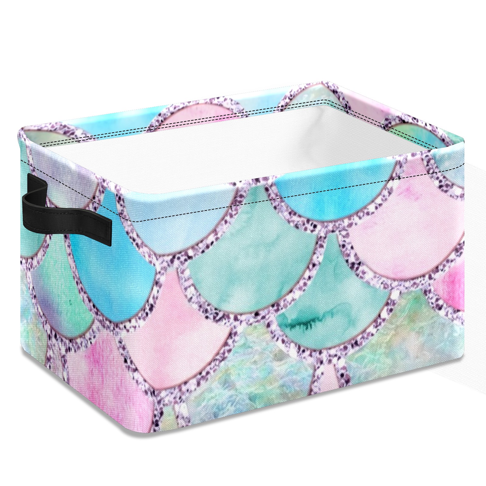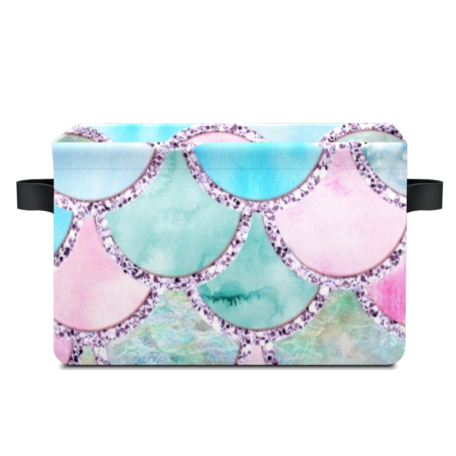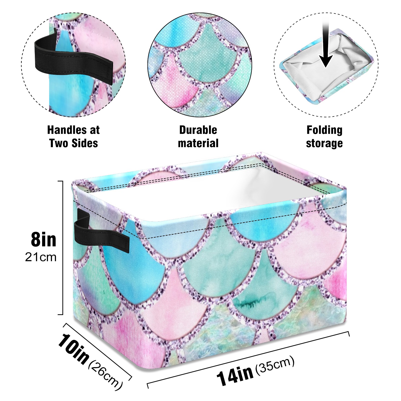 Collapsible 600D Oxford Storage Basket with Colorful Mermaid Scales - Metal Frame 10"x14"x8" Reinforced Handles, Multi-Purpose Organizer