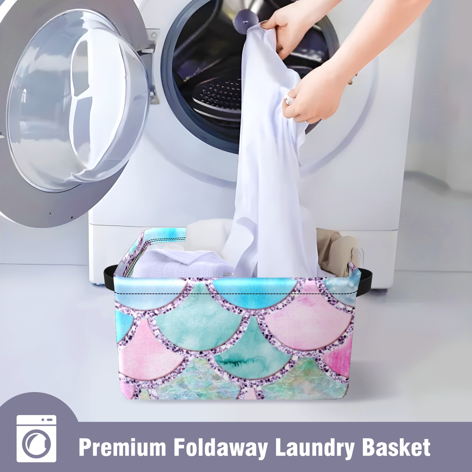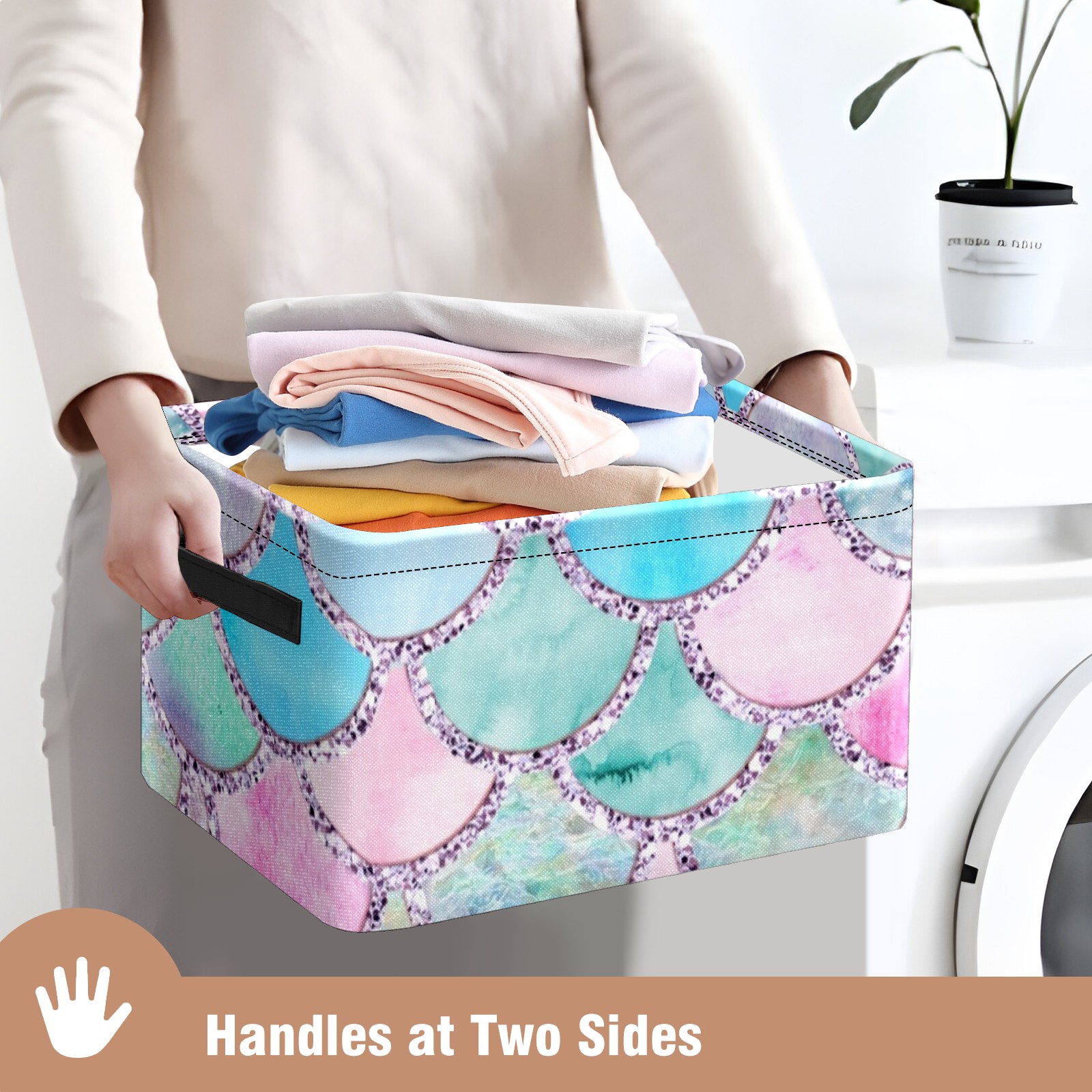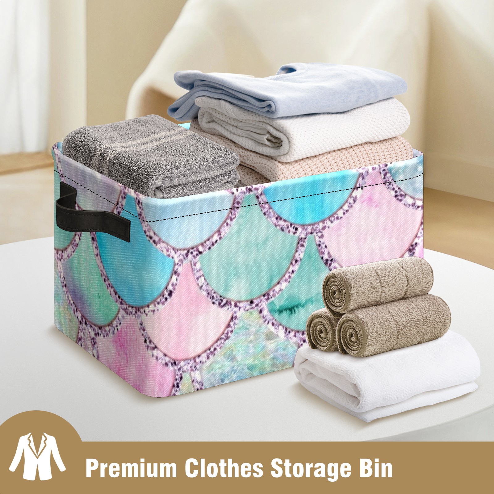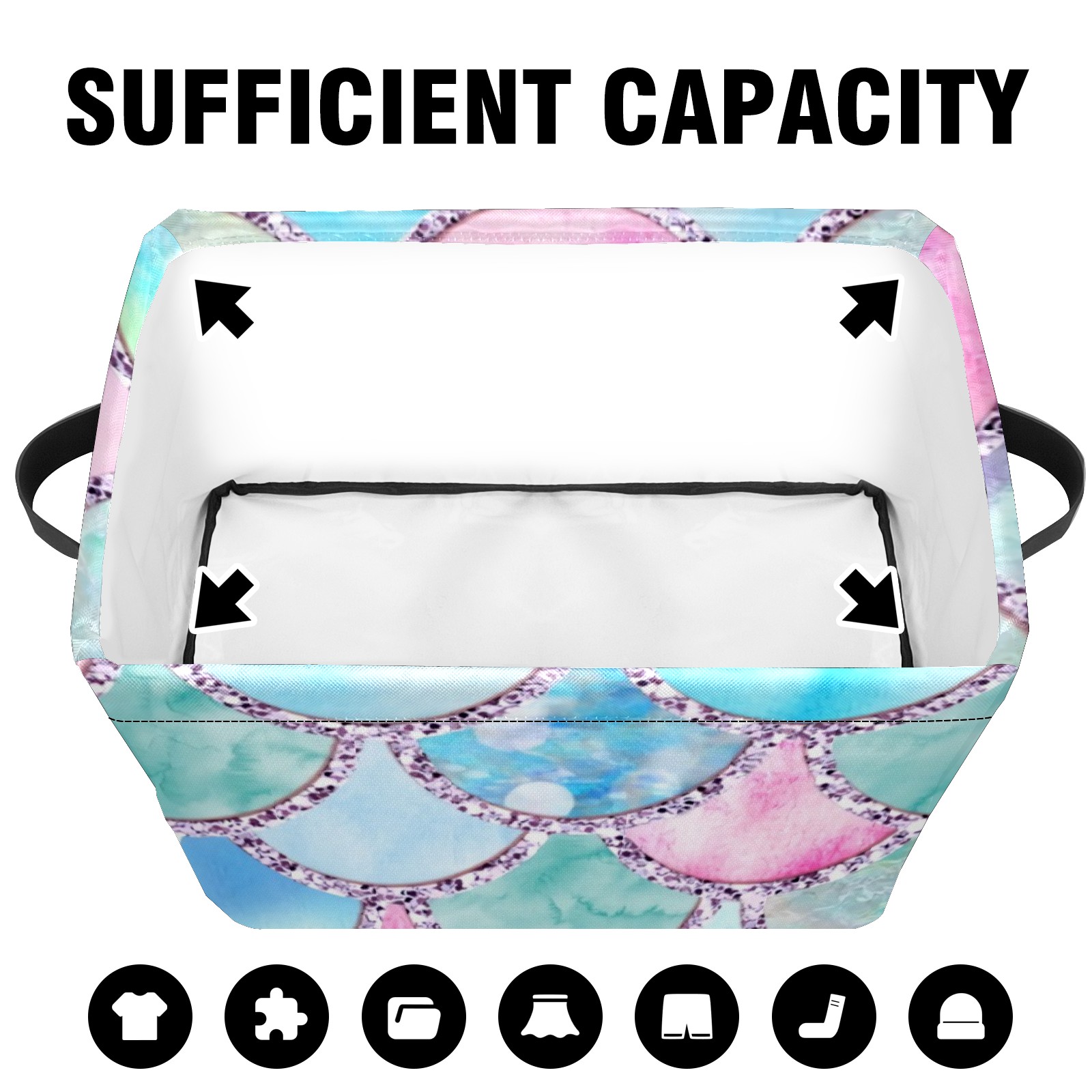 Collapsible 600D Oxford Storage Basket with Colorful Mermaid Scales - Metal Frame 10"x14"x8" Reinforced Handles, Multi-Purpose Organizer