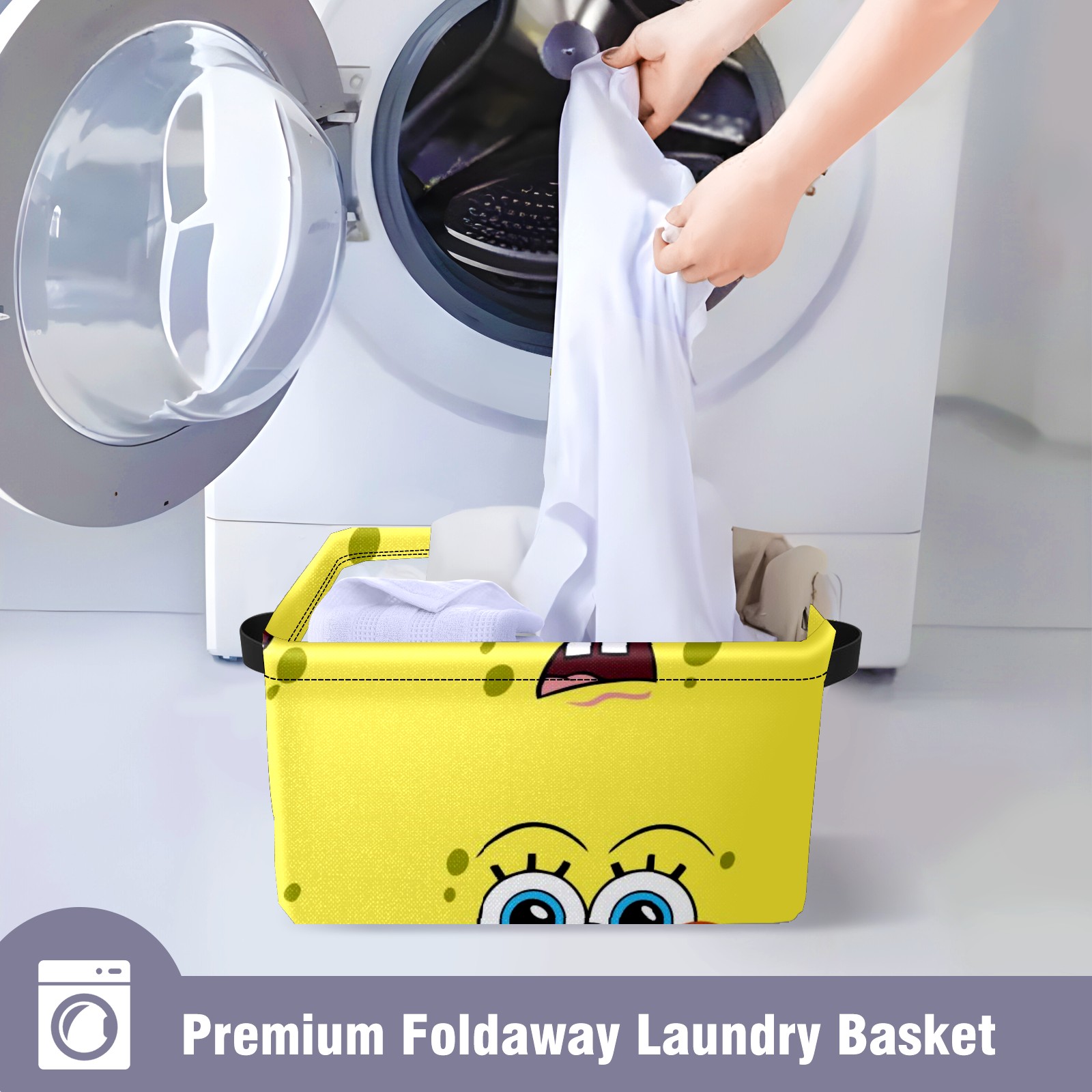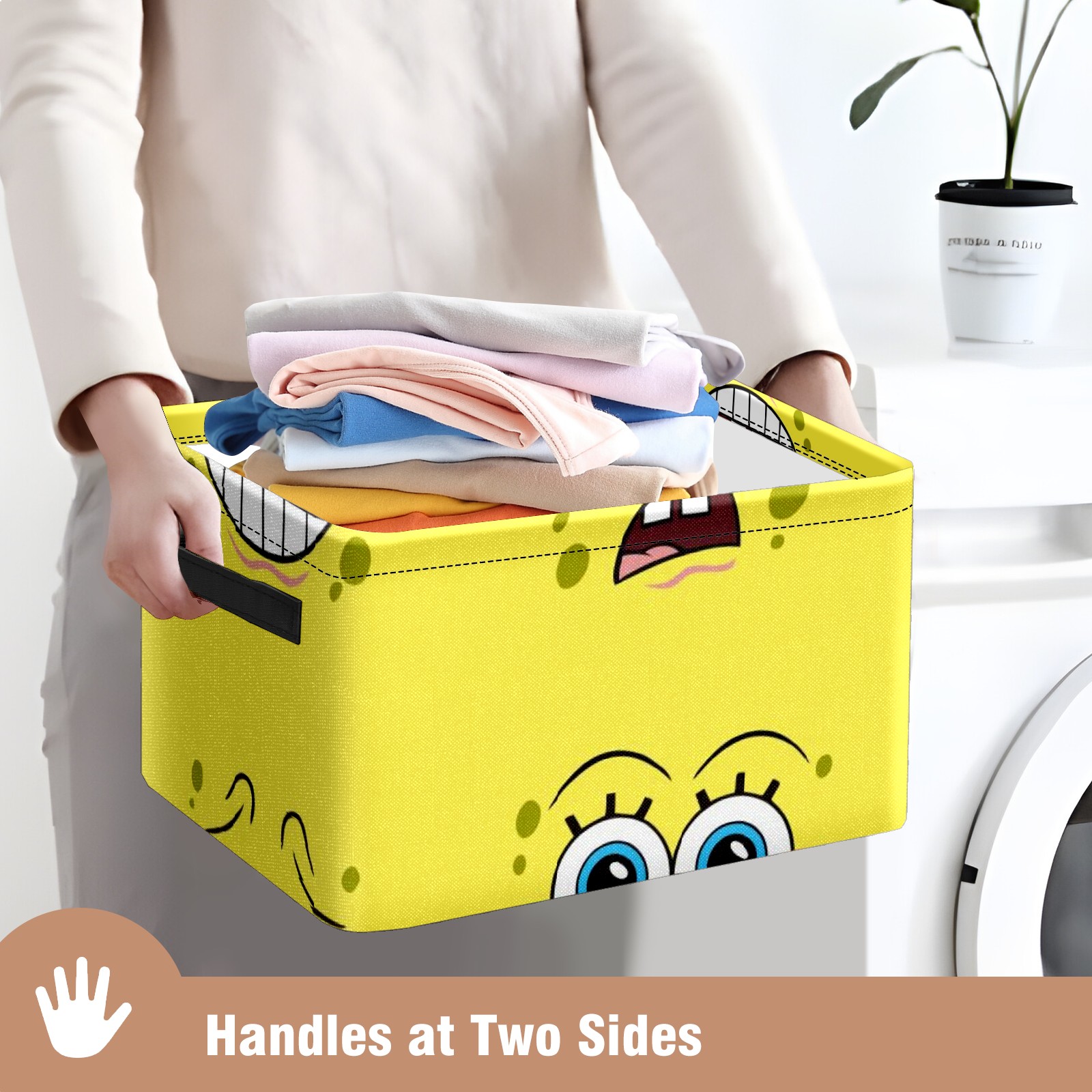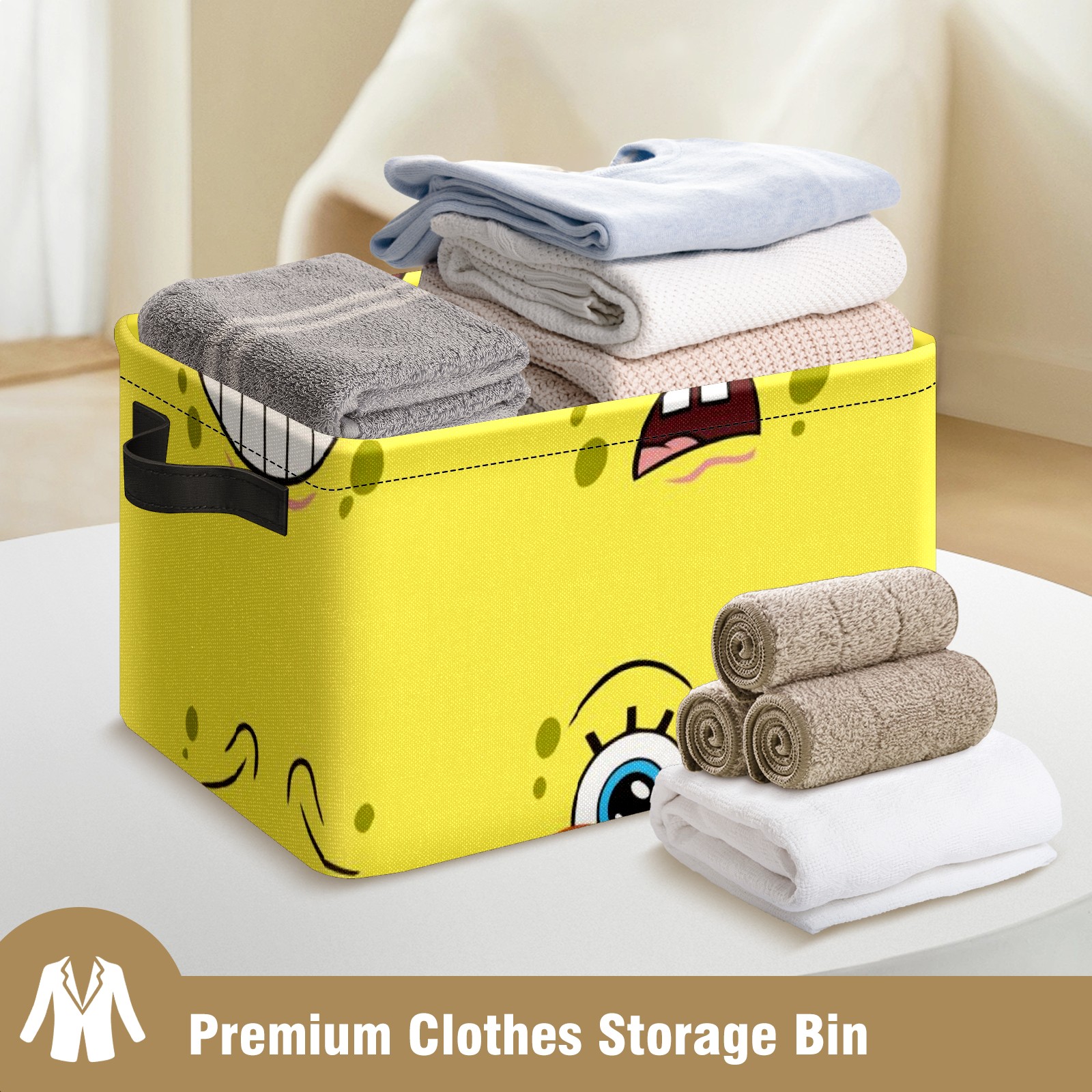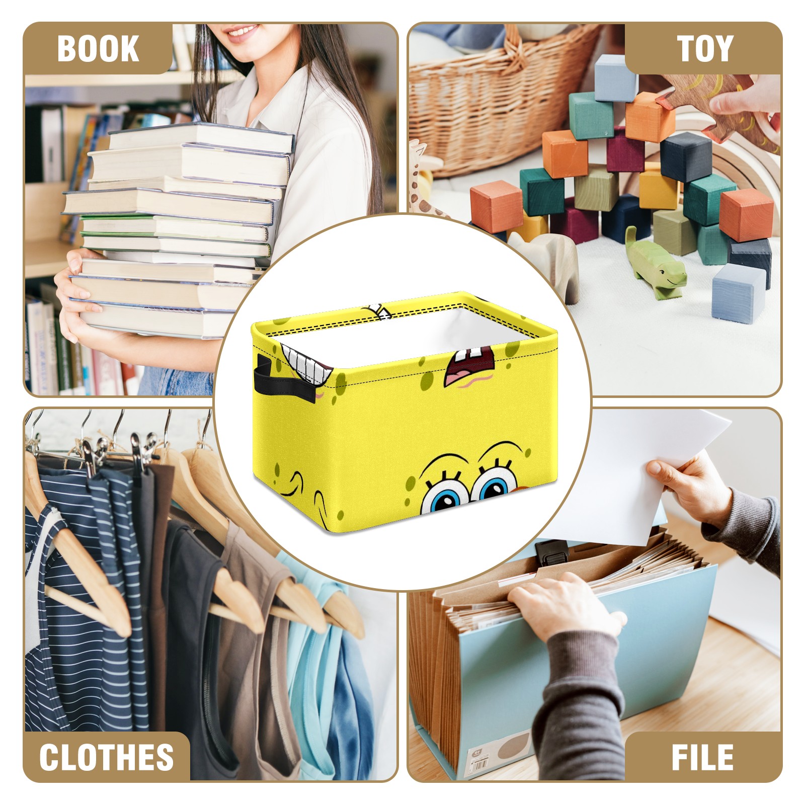 Collapsible 600D Oxford Storage Basket with Spongebob Expression Cartoons - Metal Frame 10"x14"x8" Reinforced Handles, Multi-Purpose Organizer