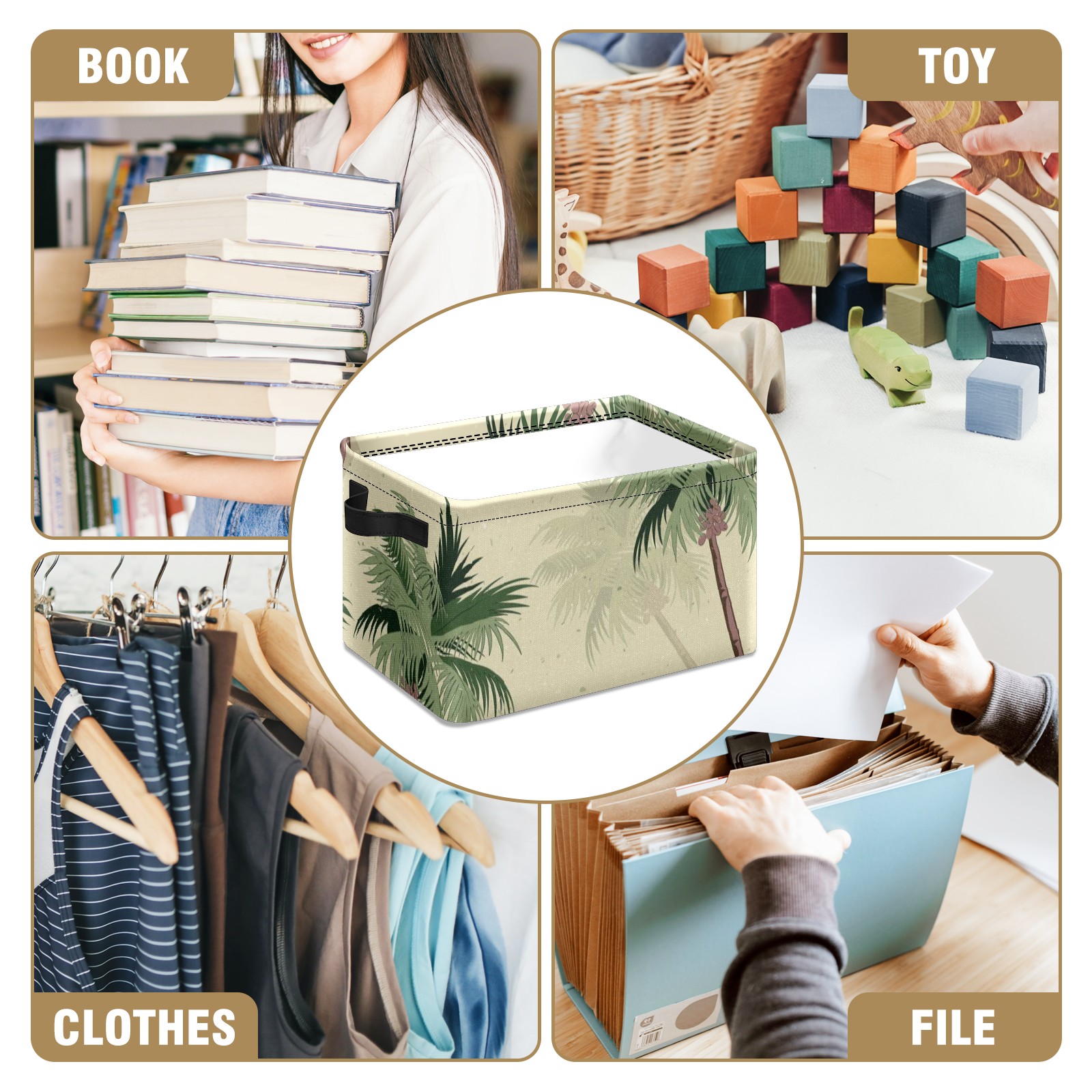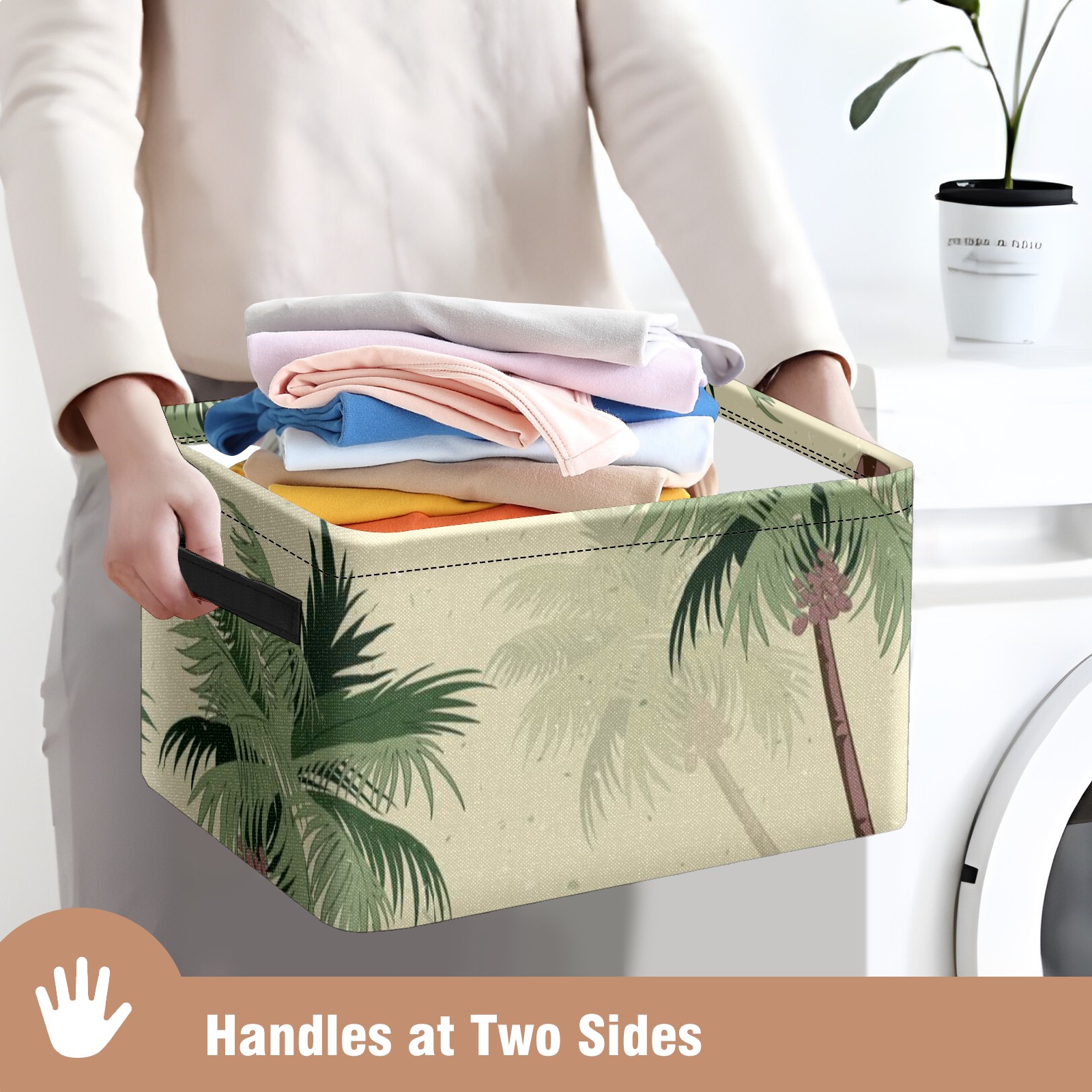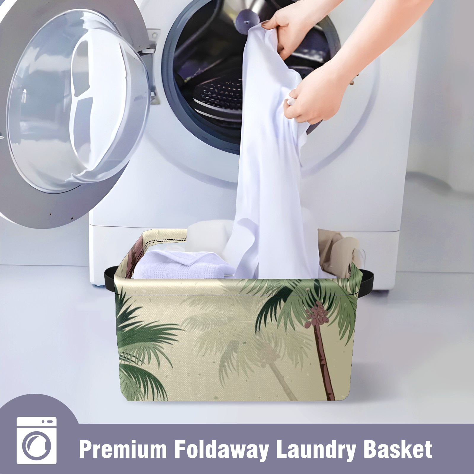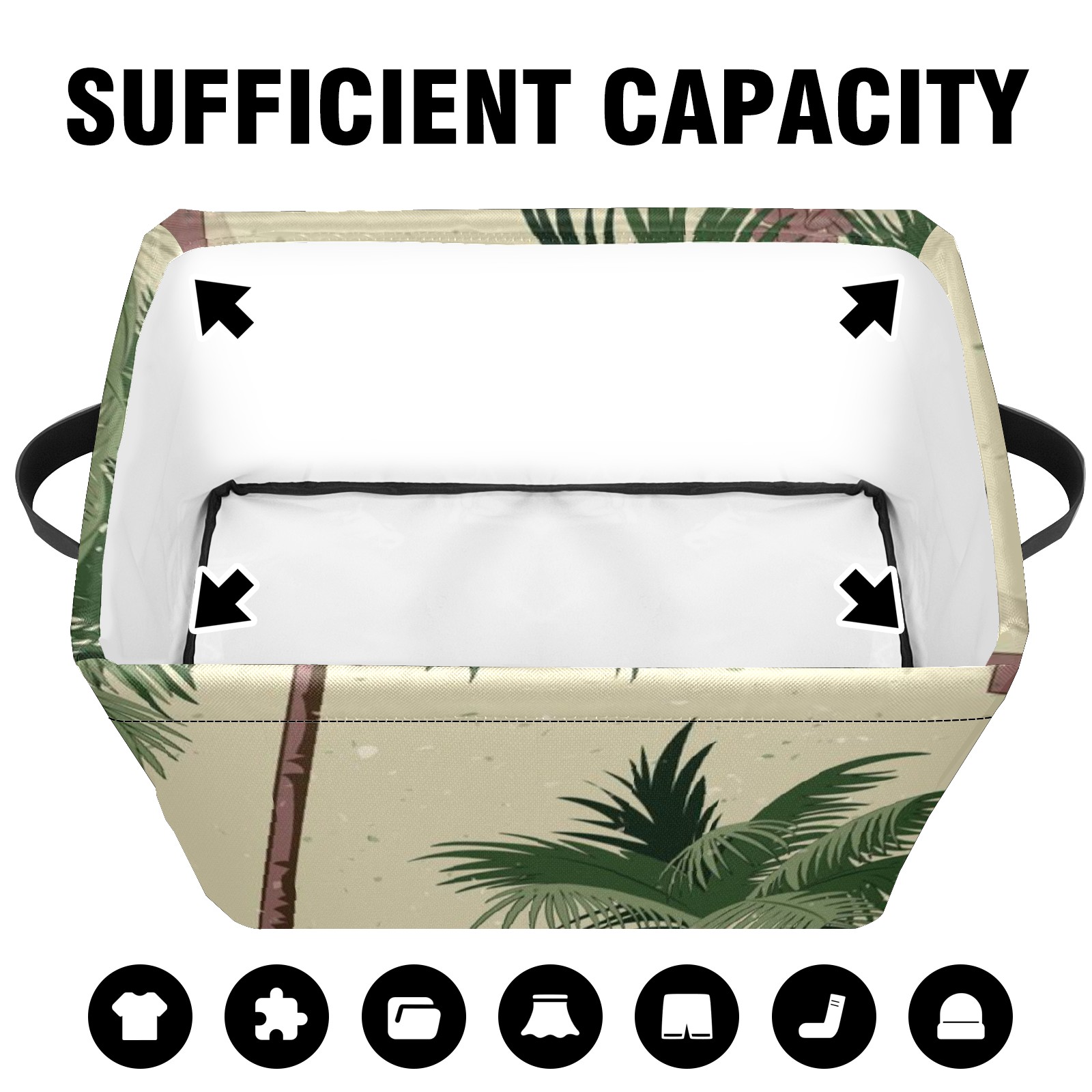Collapsible 600D Oxford Storage Basket with Vintage Green Palm Trees - Metal Frame 10"x14"x8" Reinforced Handles, Multi-Purpose Organizer