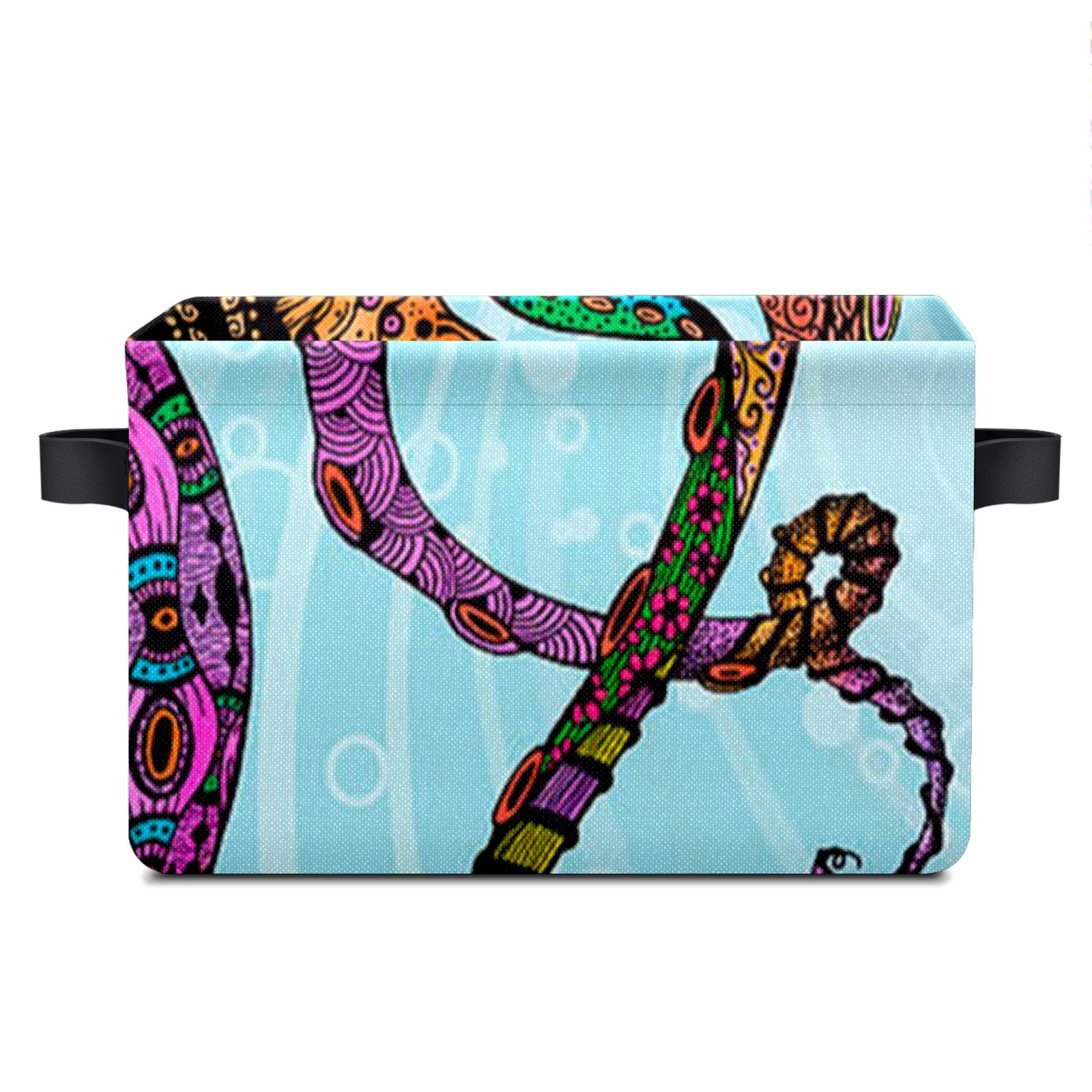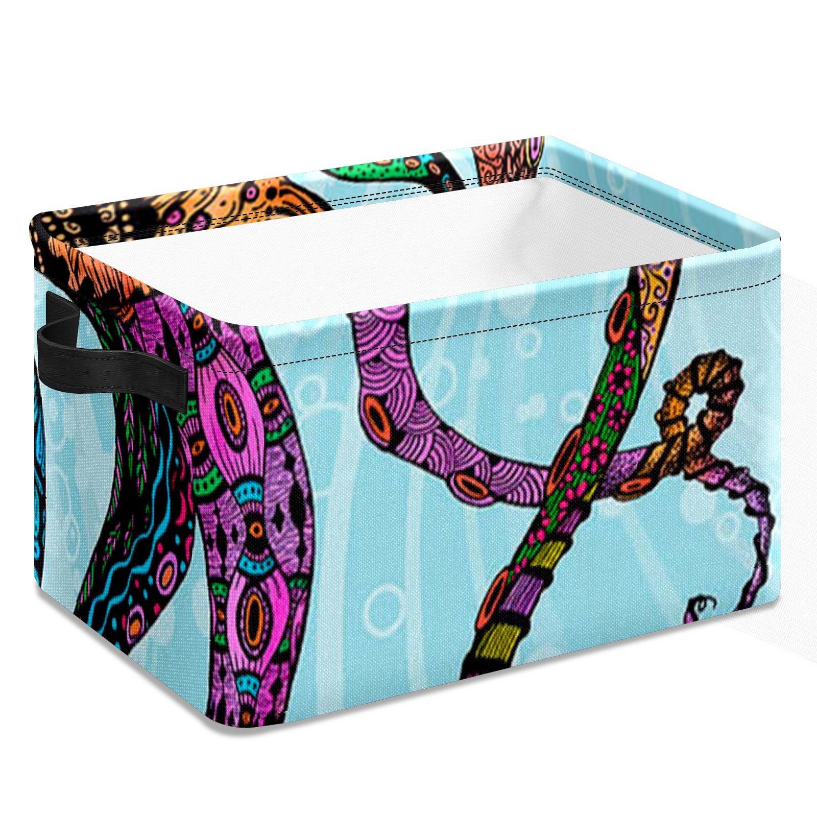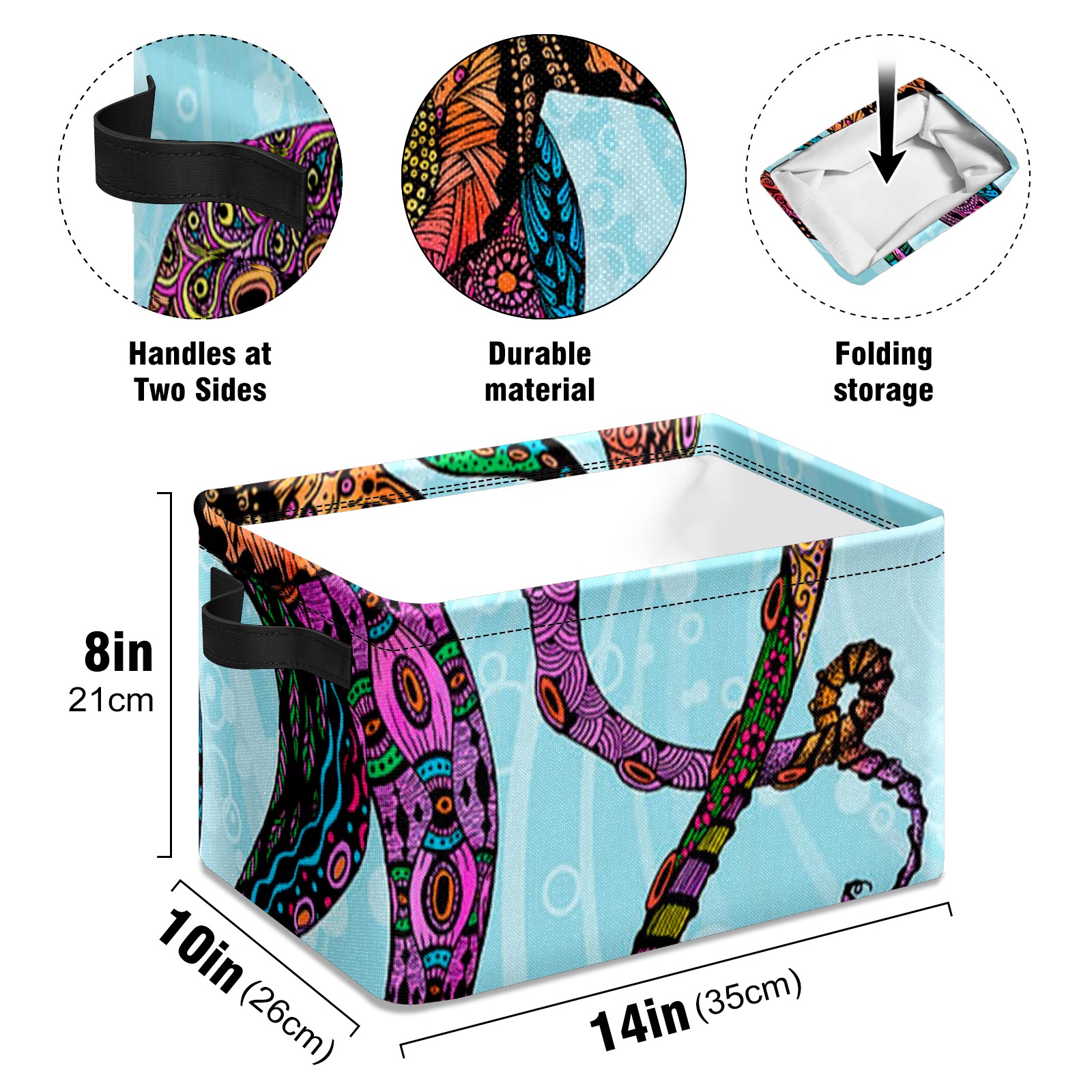Collapsible 600D Oxford Storage Basket with Colorful Octopus - Metal Frame 10"x14"x8" Reinforced Handles, Multi-Purpose Organizer