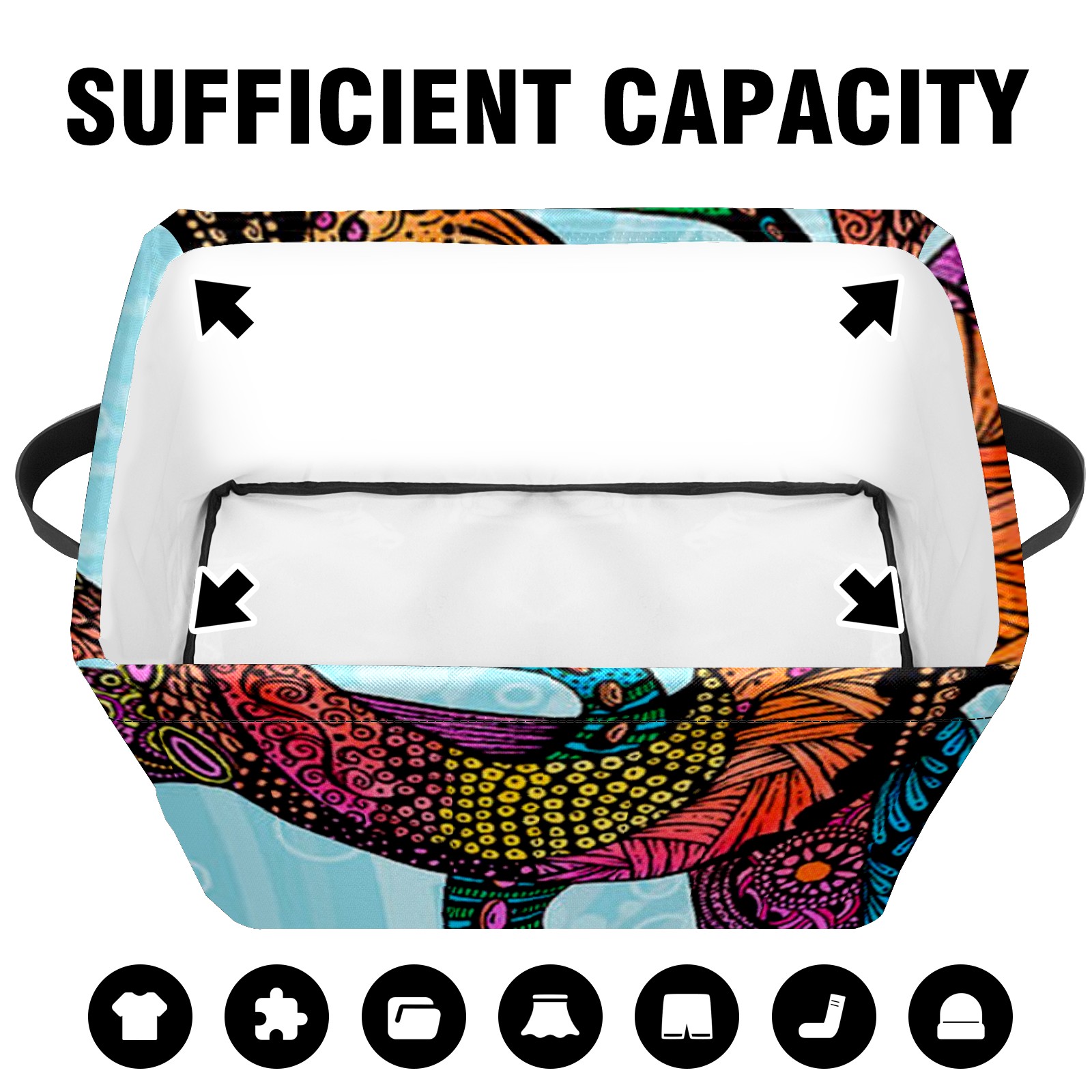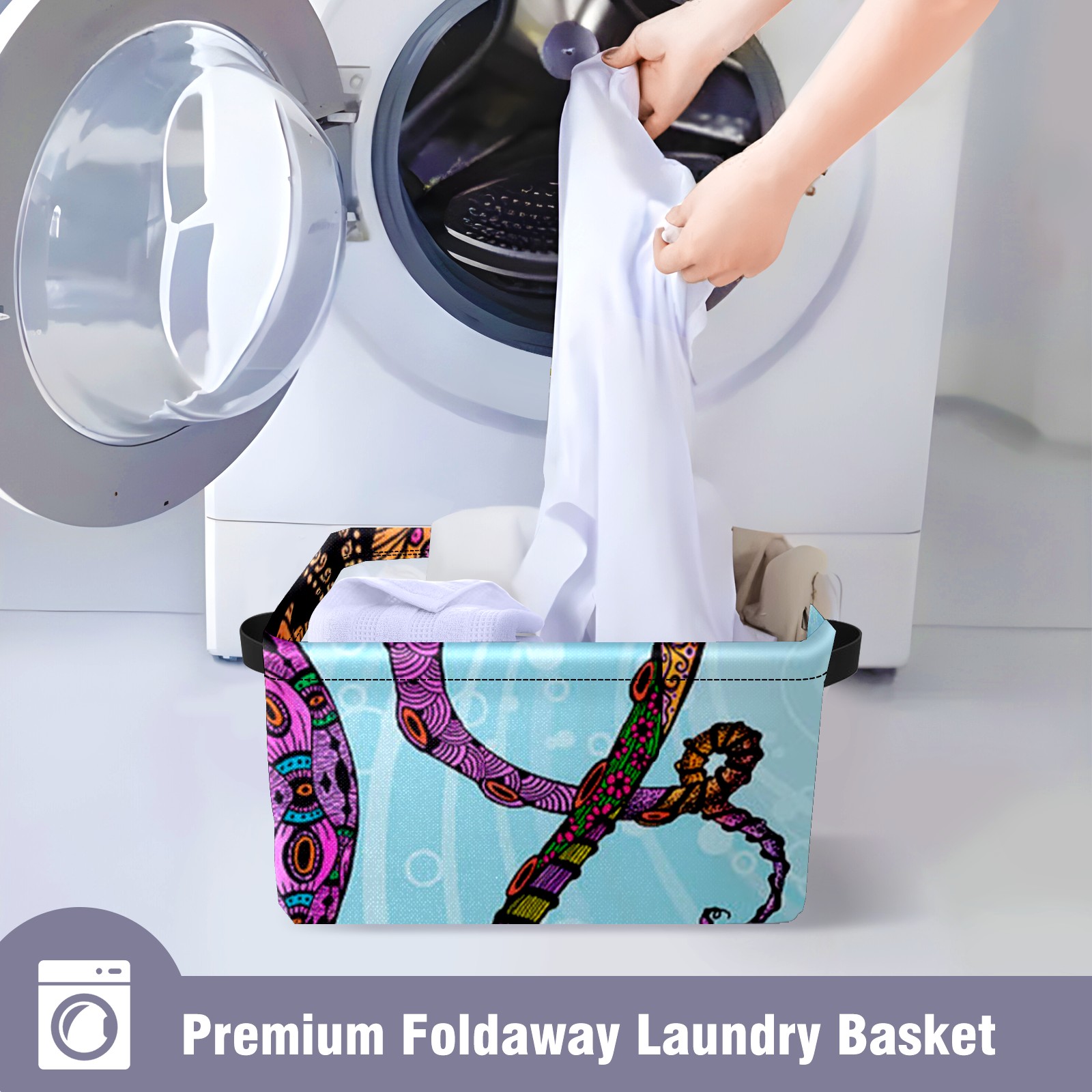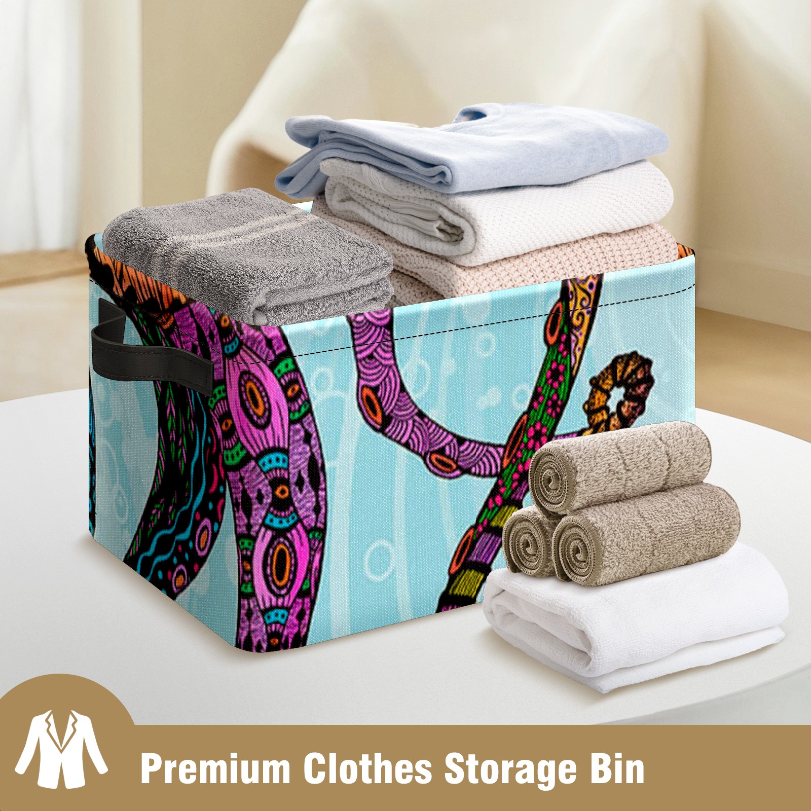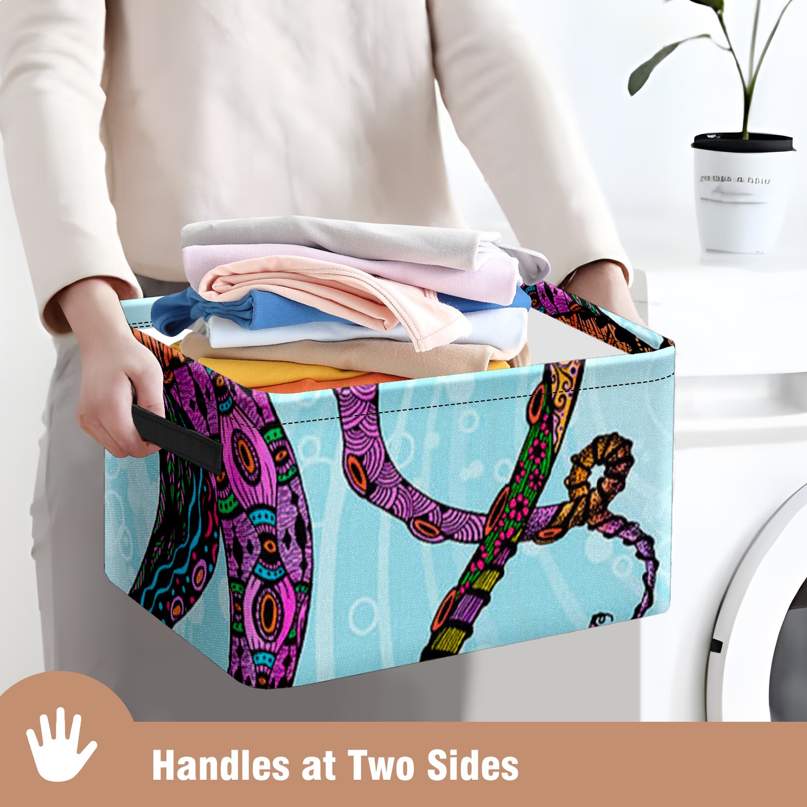 Collapsible 600D Oxford Storage Basket with Colorful Octopus - Metal Frame 10"x14"x8" Reinforced Handles, Multi-Purpose Organizer