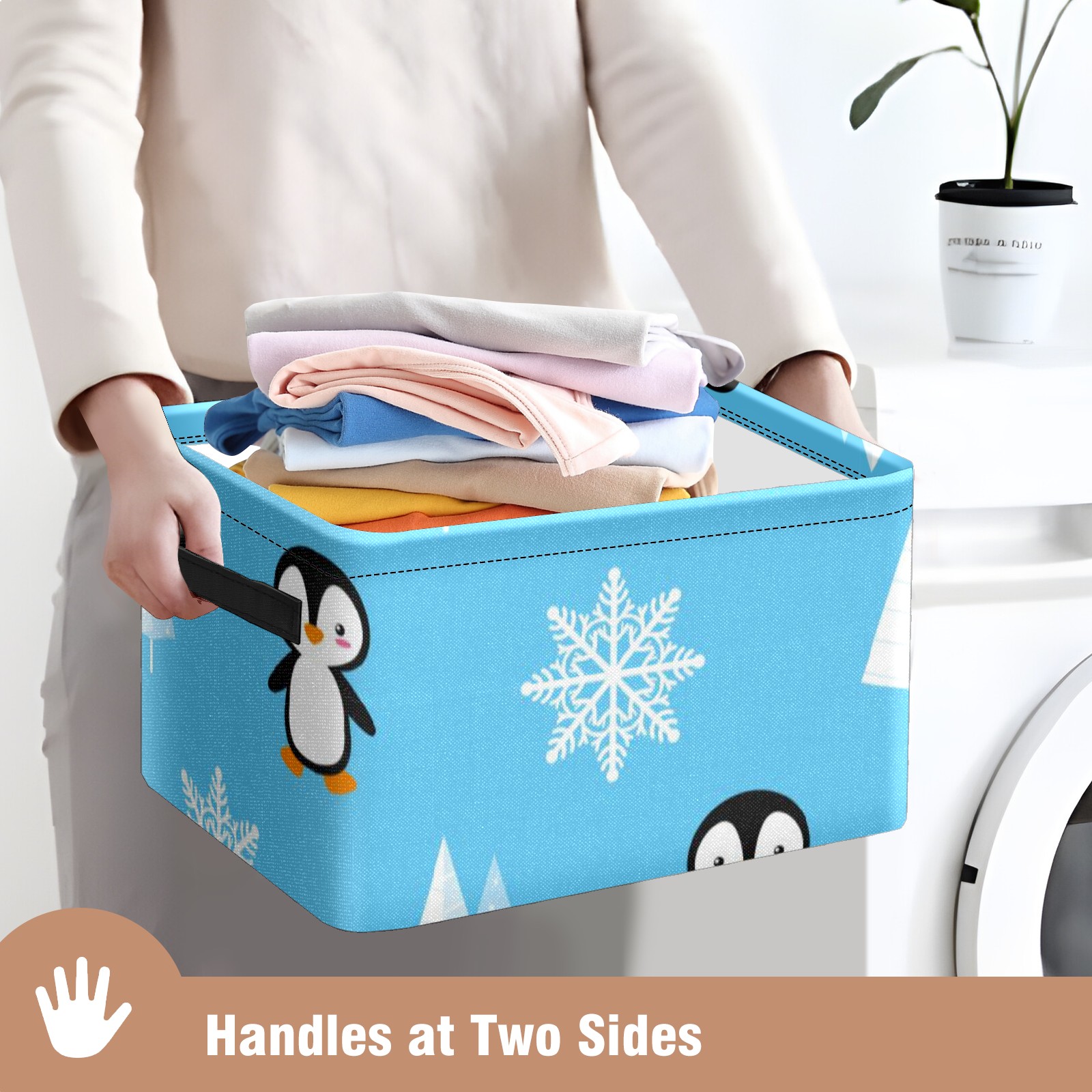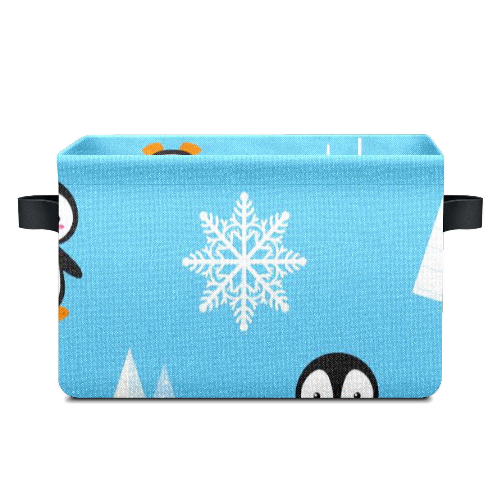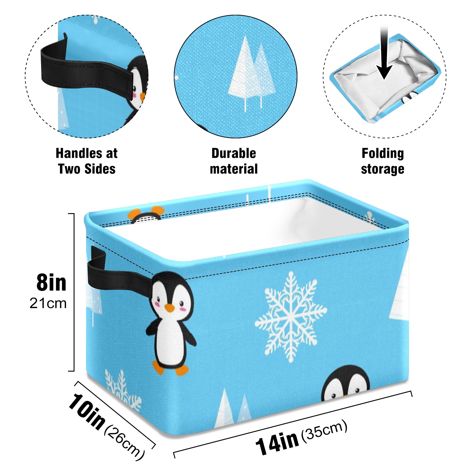 Collapsible 600D Oxford Storage Basket with Winter Penguin Snowflake - Metal Frame 10"x14"x8" Reinforced Handles, Multi-Purpose Organizer