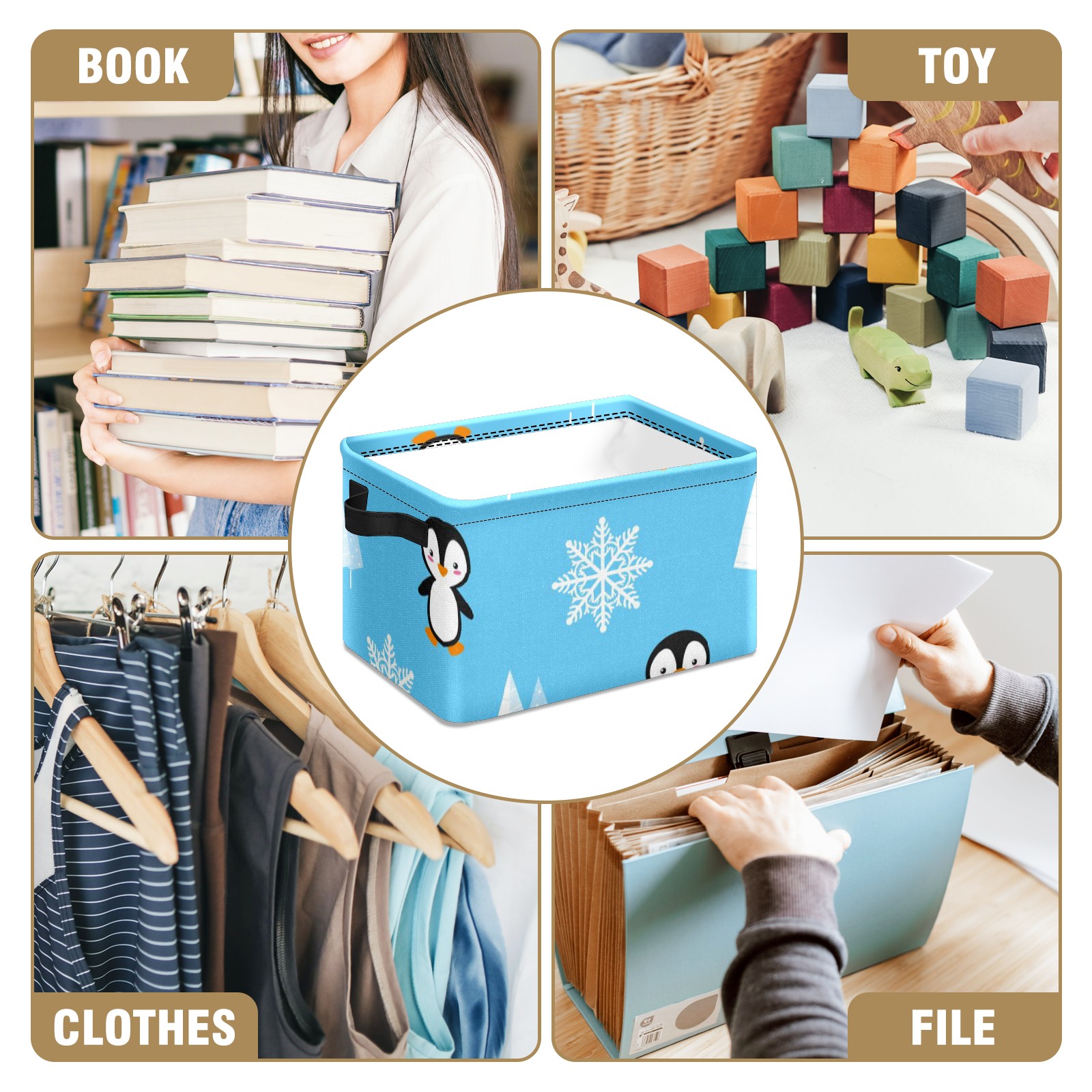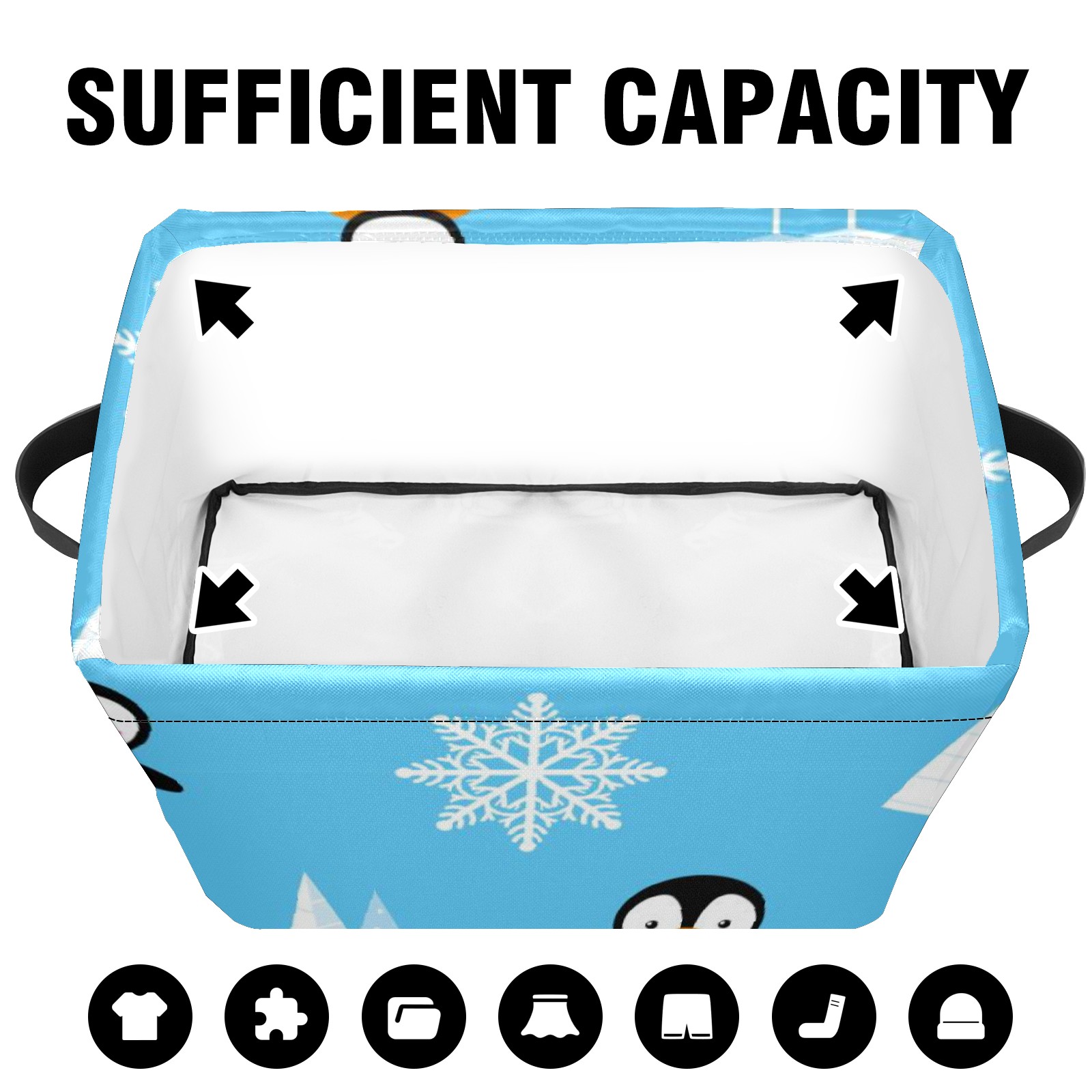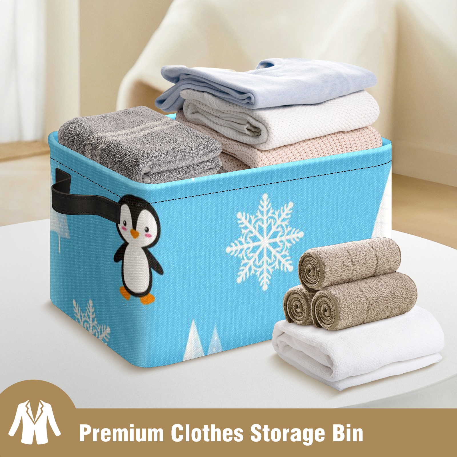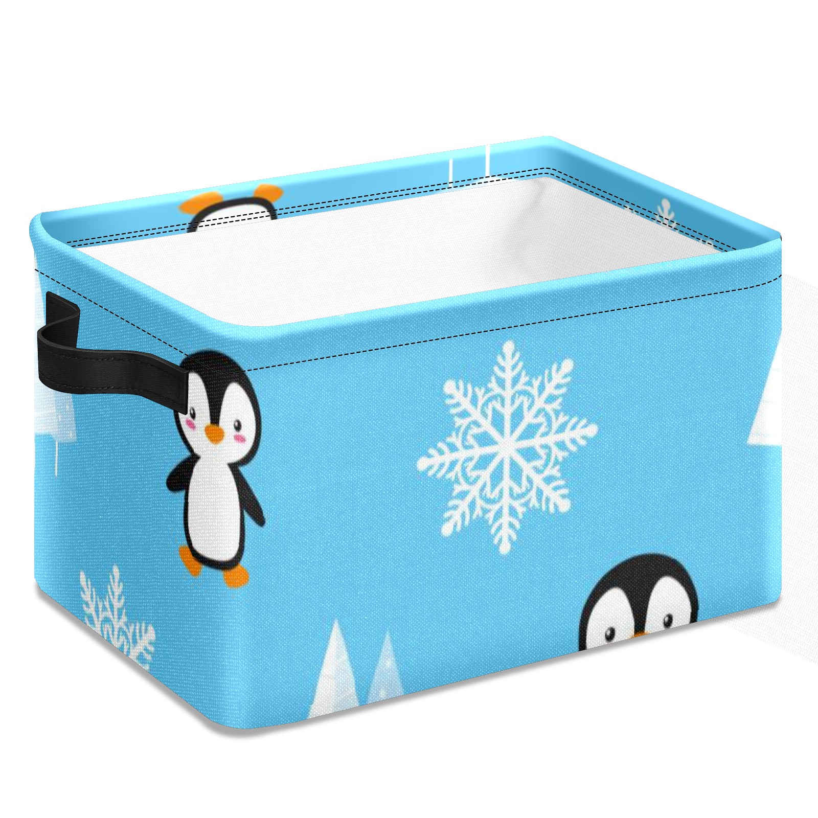 Collapsible 600D Oxford Storage Basket with Winter Penguin Snowflake - Metal Frame 10"x14"x8" Reinforced Handles, Multi-Purpose Organizer