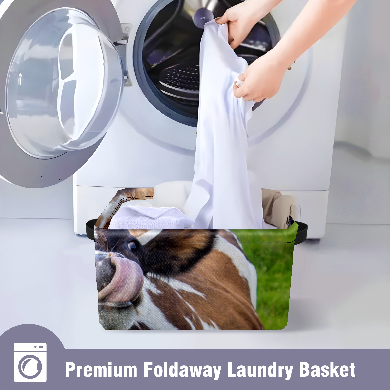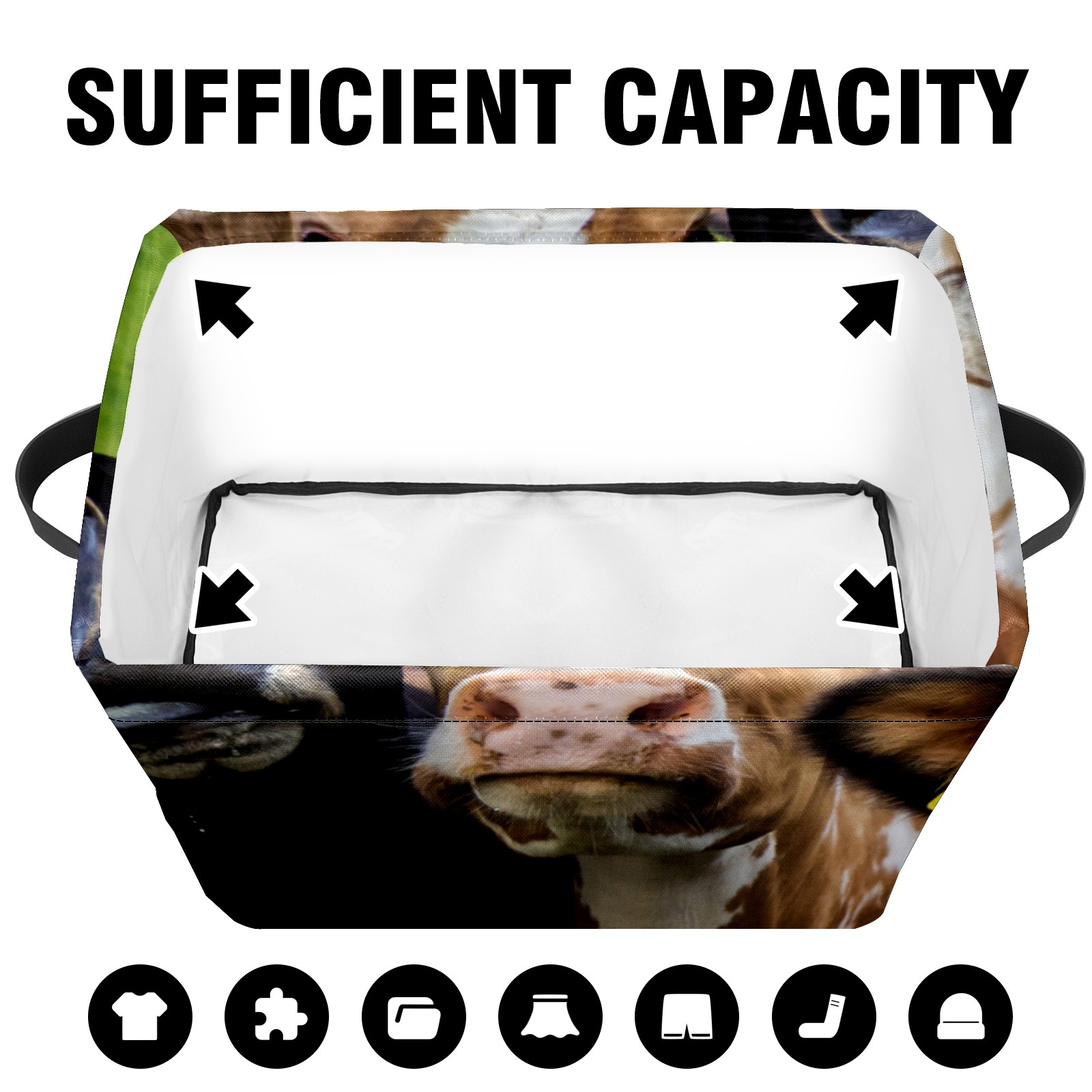 Collapsible 600D Oxford Storage Basket with Funny Cow Print Farm Cattle - Metal Frame 10"x14"x8" Reinforced Handles, Multi-Purpose Organizer