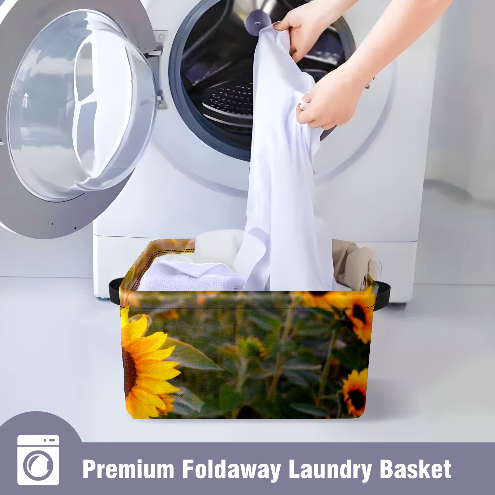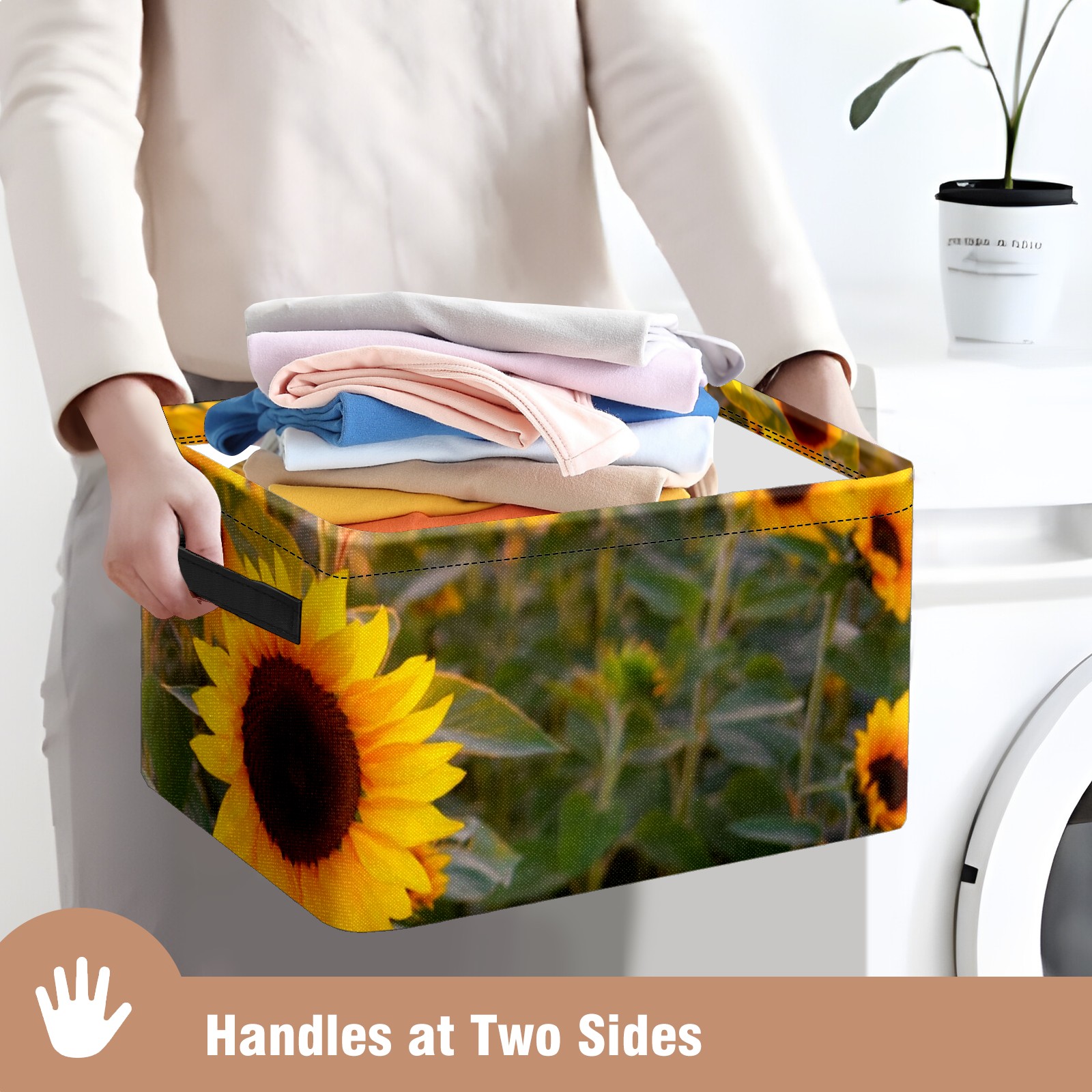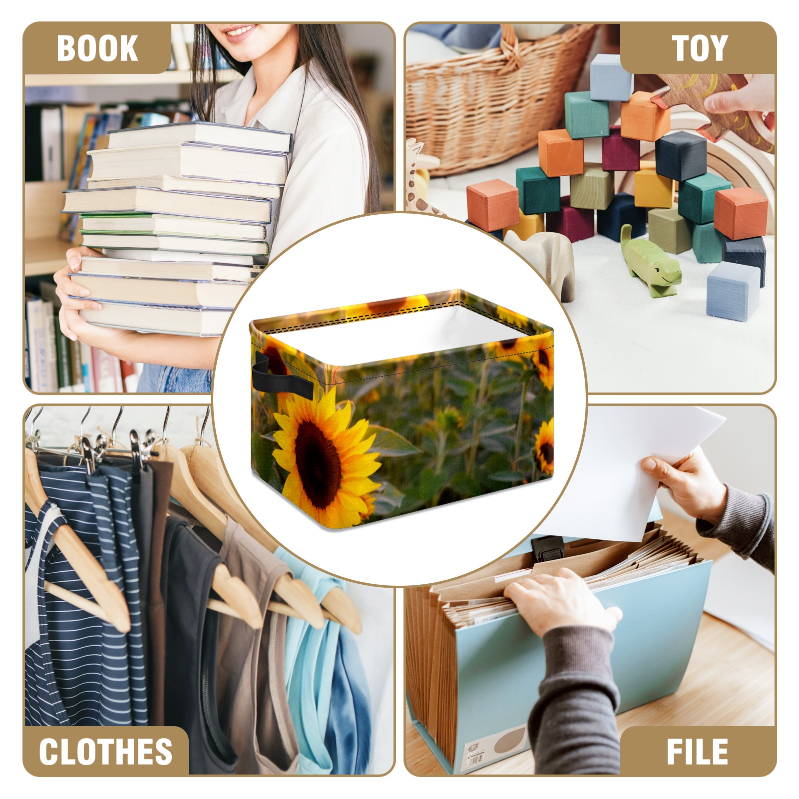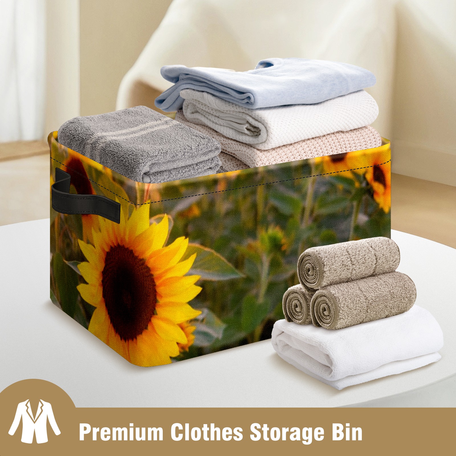 Collapsible 600D Oxford Storage Basket with Sunflowers Blooming Sunset - Metal Frame 10"x14"x8" Reinforced Handles, Multi-Purpose Organizer