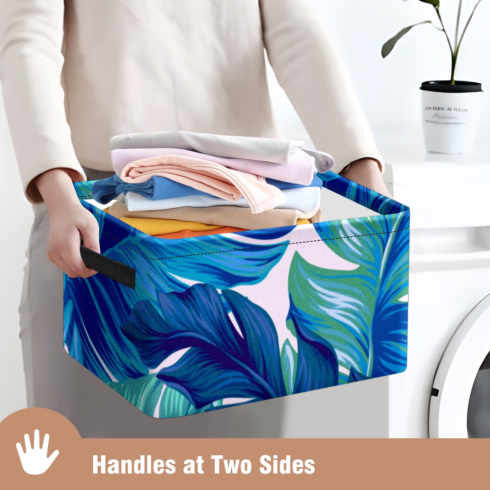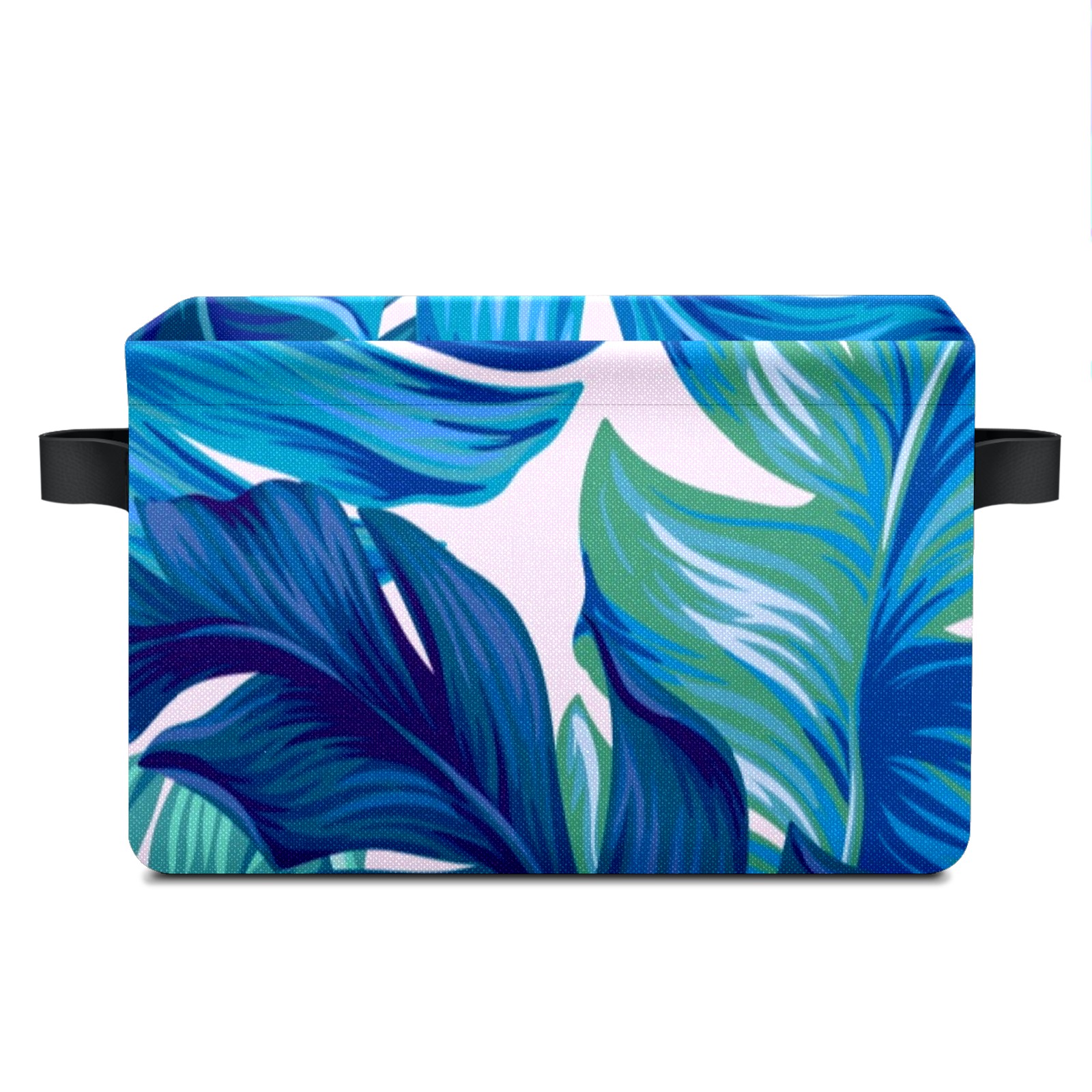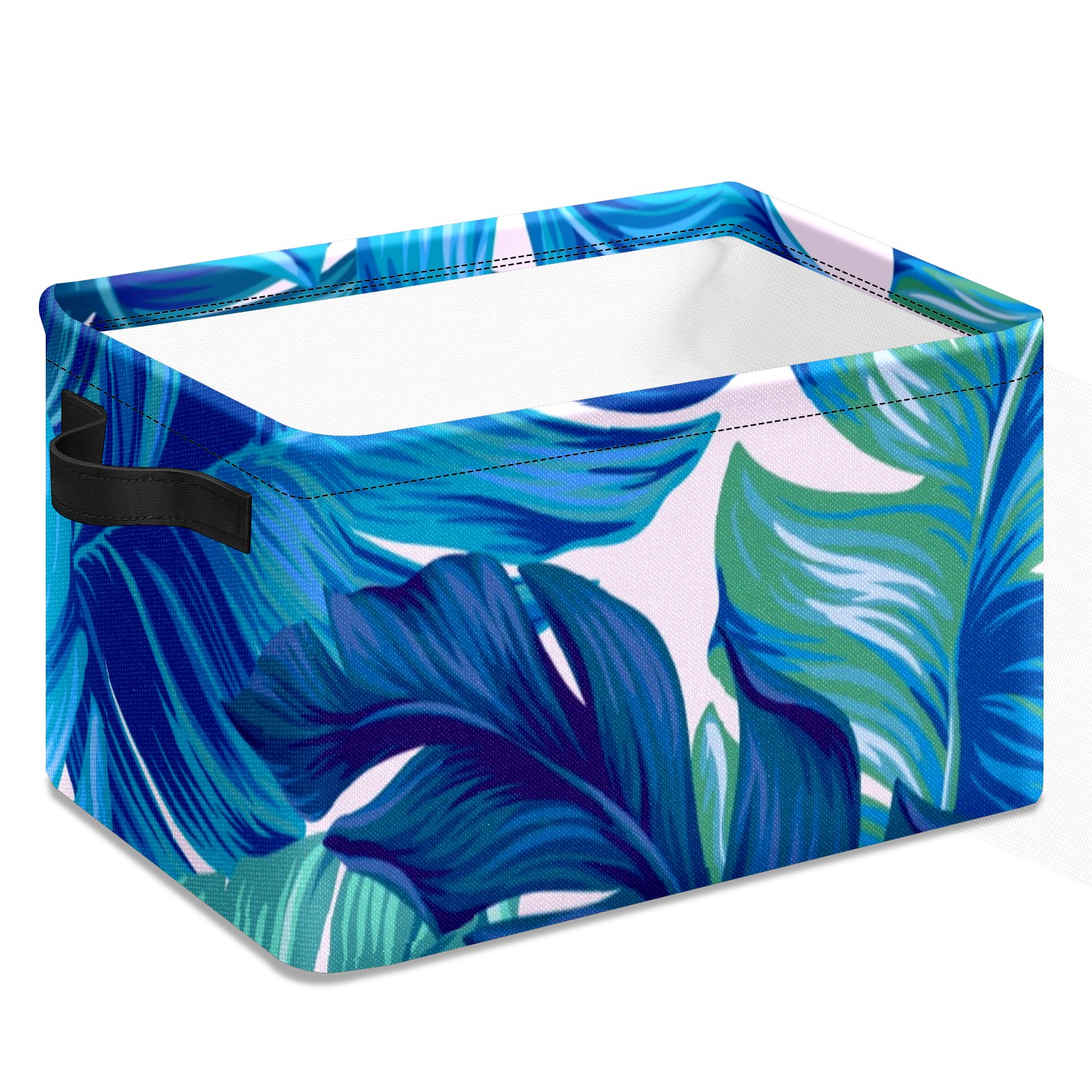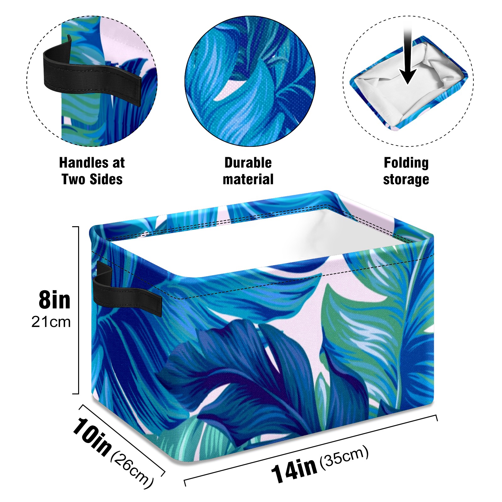 Collapsible 600D Oxford Storage Basket with Blue Watercolor Tropical Palm Leaves - Metal Frame 10"x14"x8" Reinforced Handles, Multi-Purpose Organizer