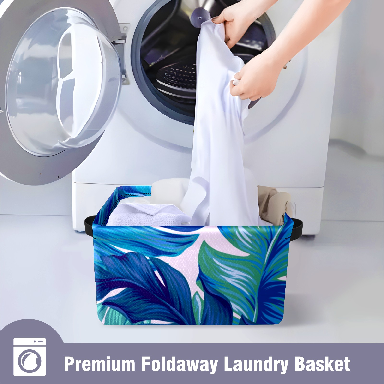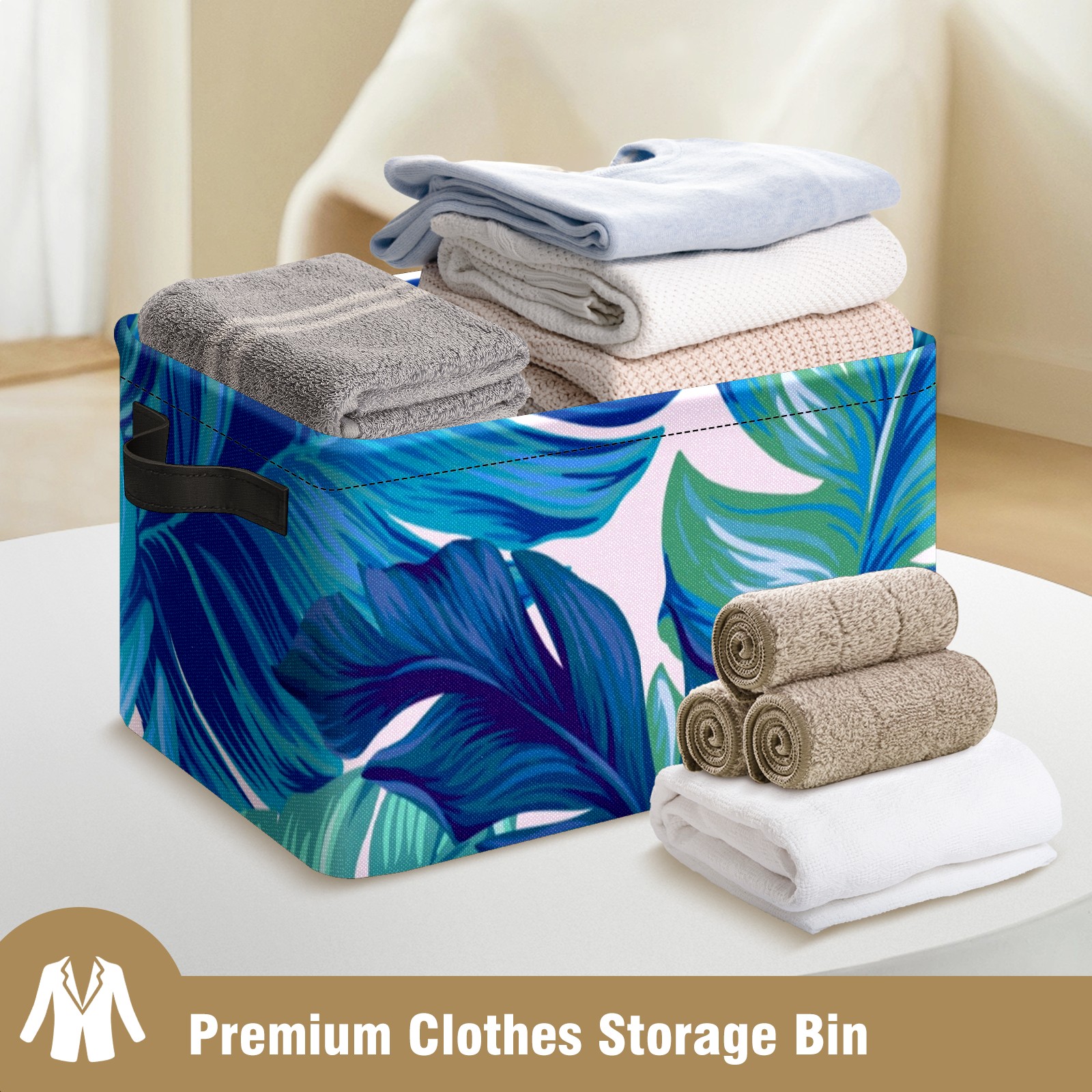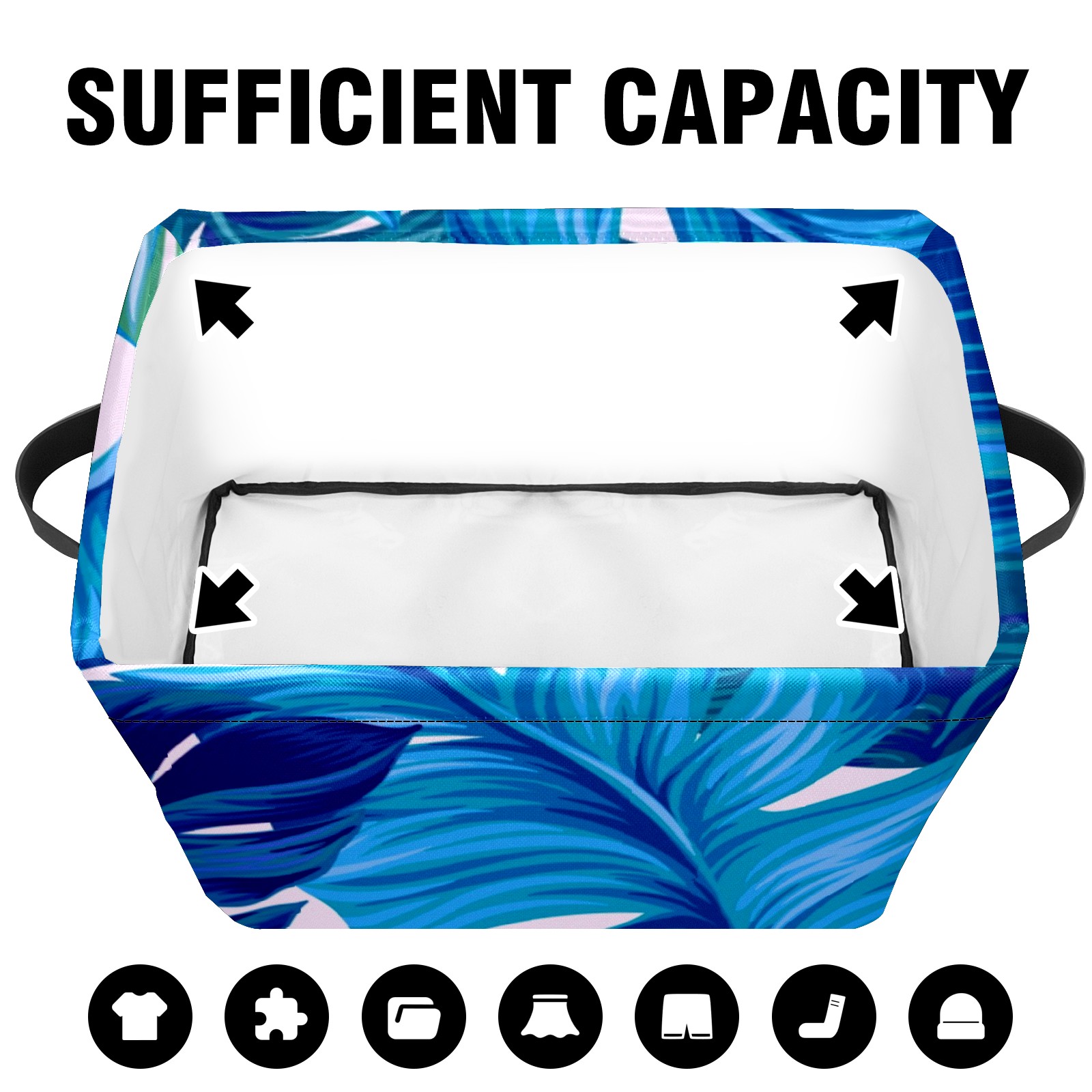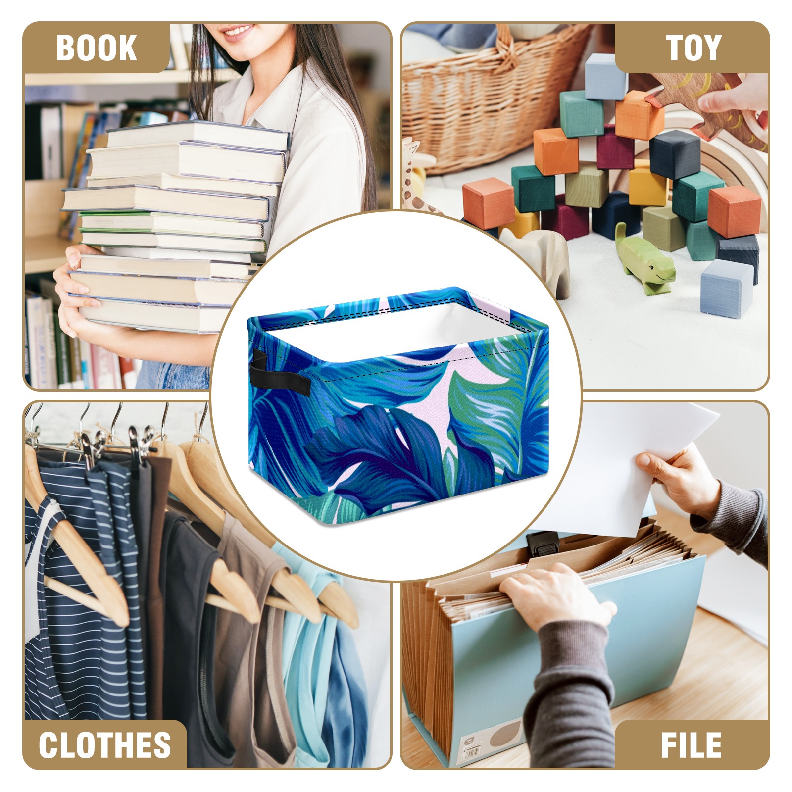 Collapsible 600D Oxford Storage Basket with Blue Watercolor Tropical Palm Leaves - Metal Frame 10"x14"x8" Reinforced Handles, Multi-Purpose Organizer