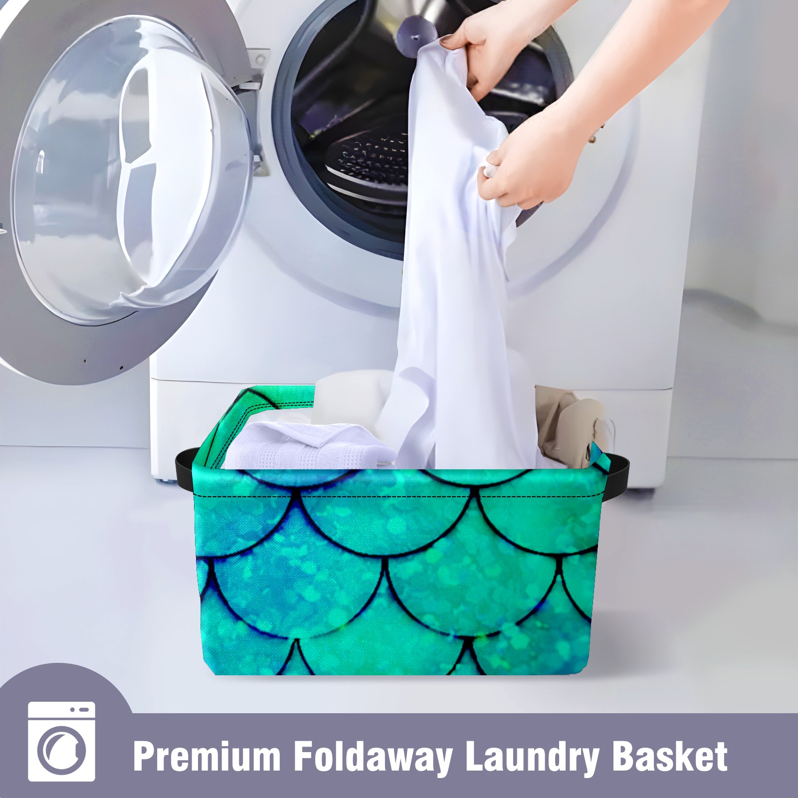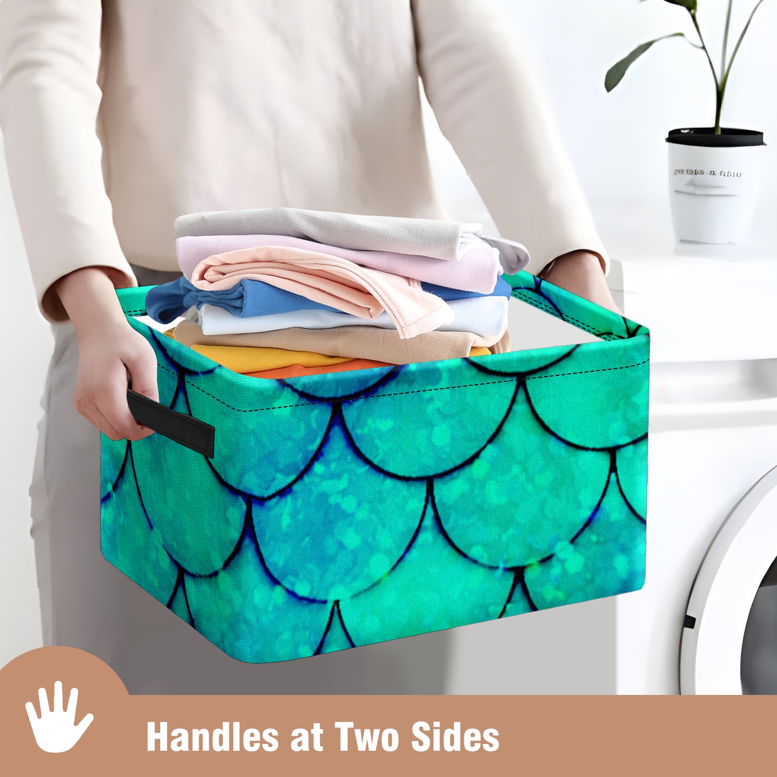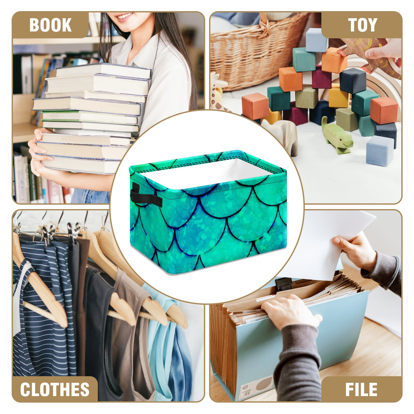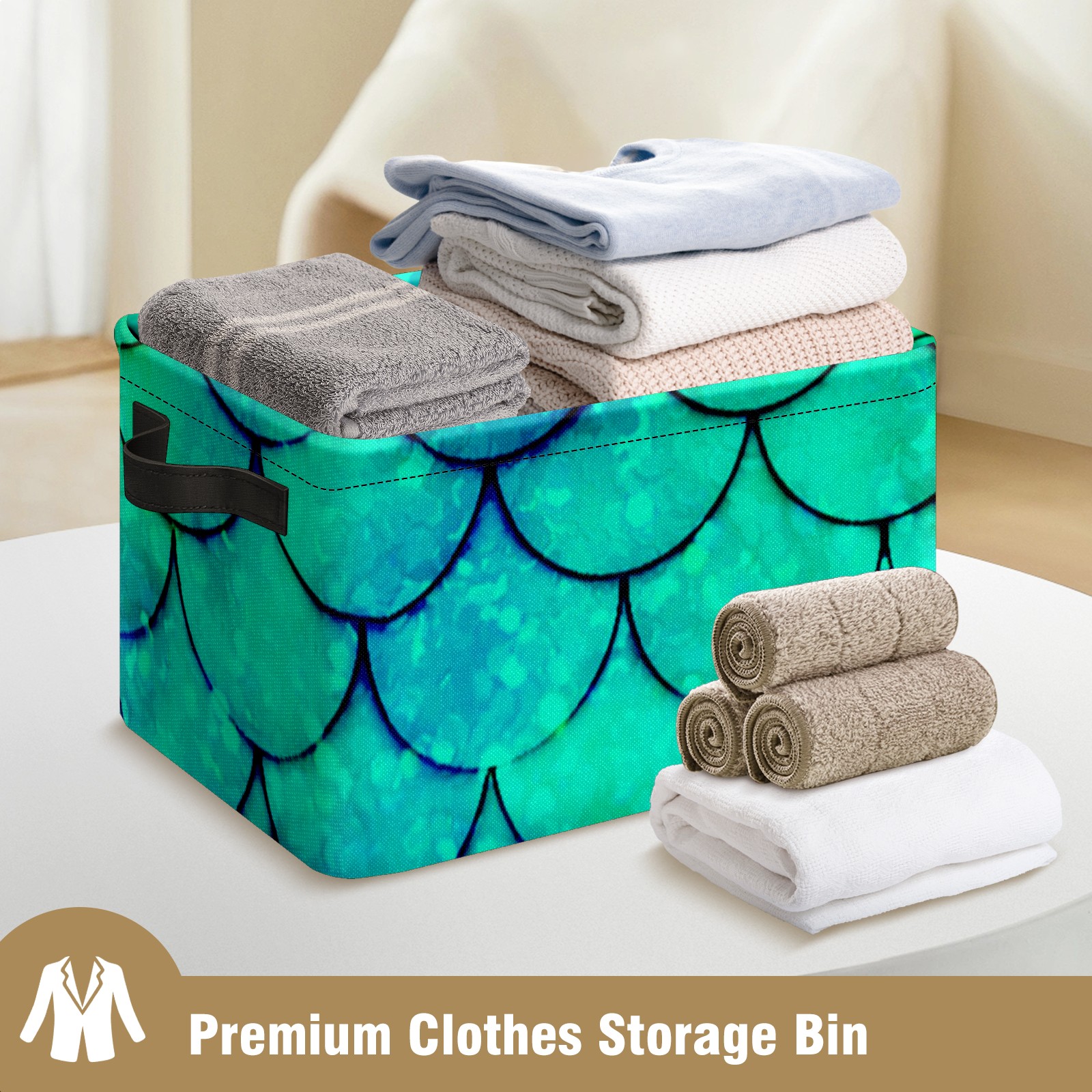 Collapsible 600D Oxford Storage Basket with Mermaid Green Scales - Metal Frame 10"x14"x8" Reinforced Handles, Multi-Purpose Organizer