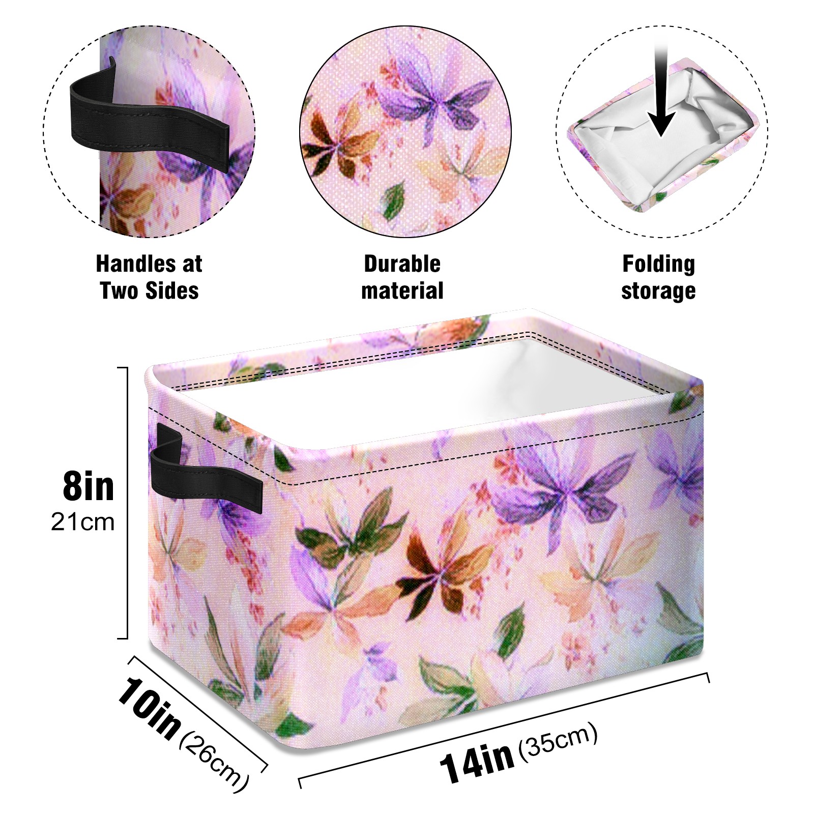 Collapsible 600D Oxford Storage Basket with Purple Butterfly Plant Leaves Retro - Metal Frame 10"x14"x8" Reinforced Handles, Multi-Purpose Organizer
