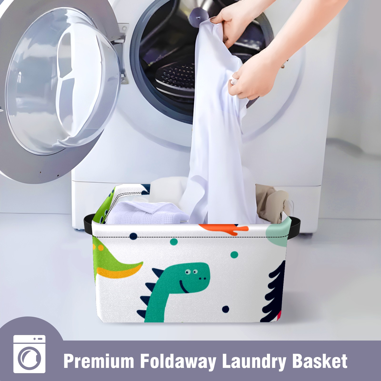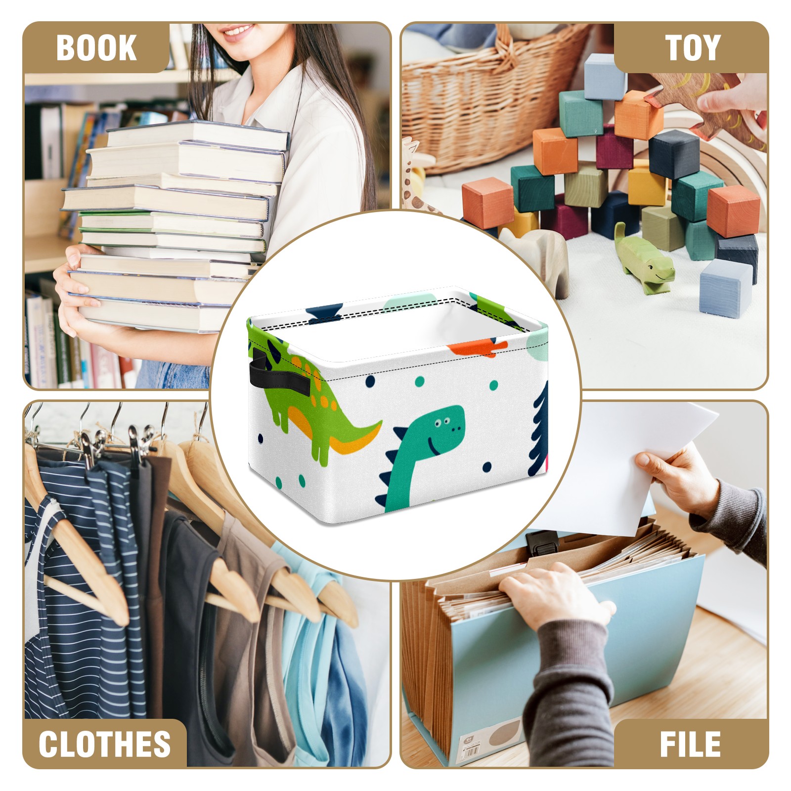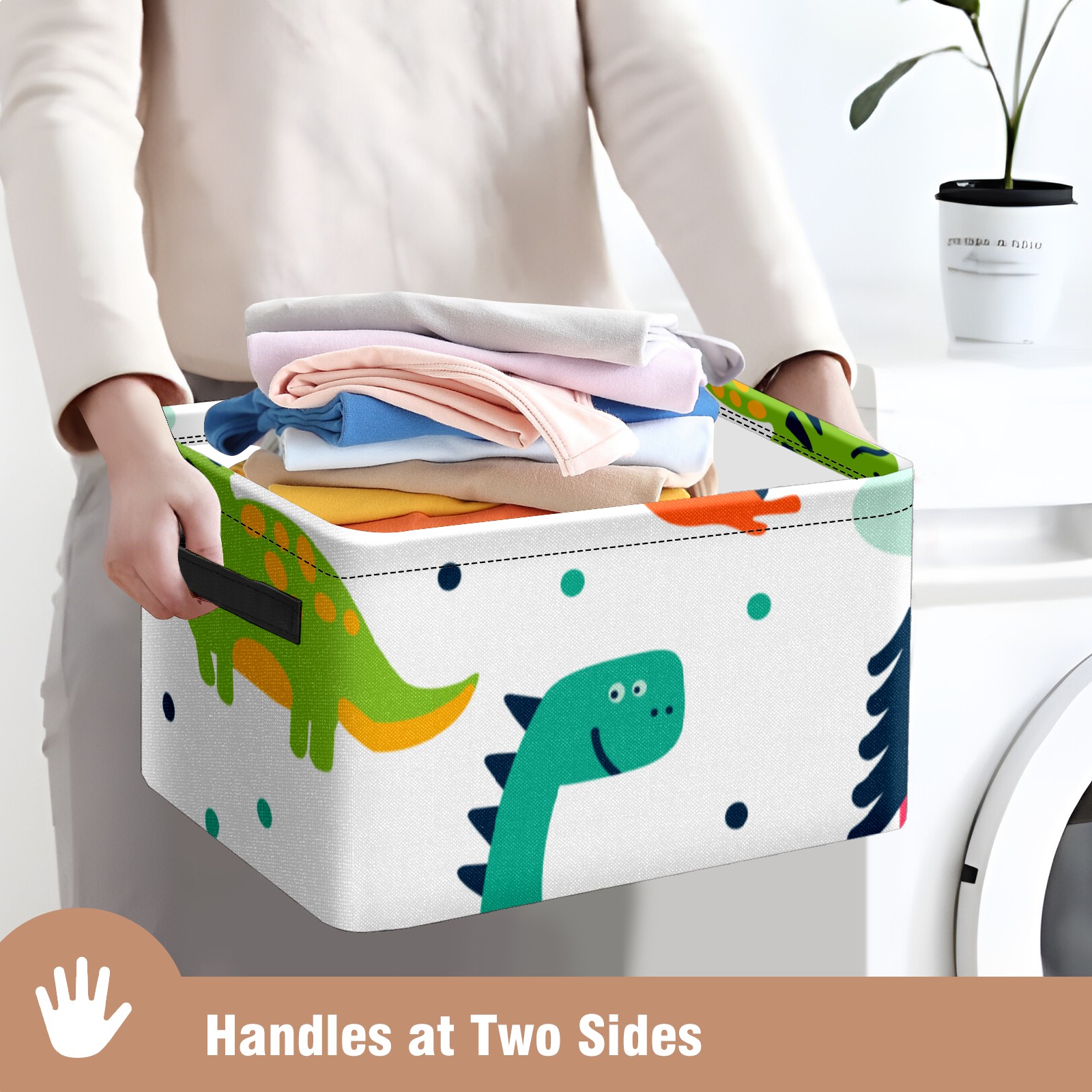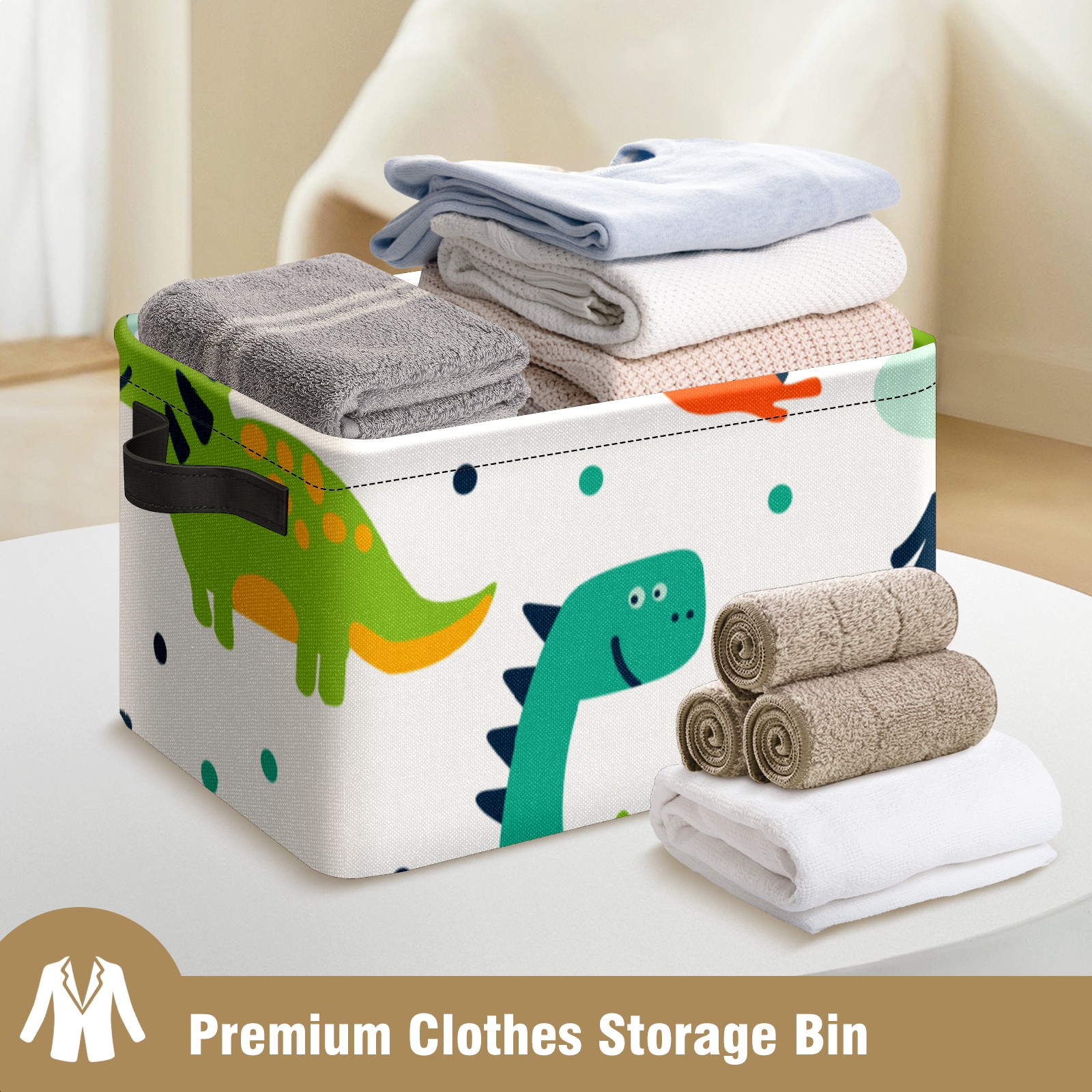 Collapsible 600D Oxford Storage Basket with Cute Cartoon Dinosaurs - Metal Frame 10"x14"x8" Reinforced Handles, Multi-Purpose Organizer