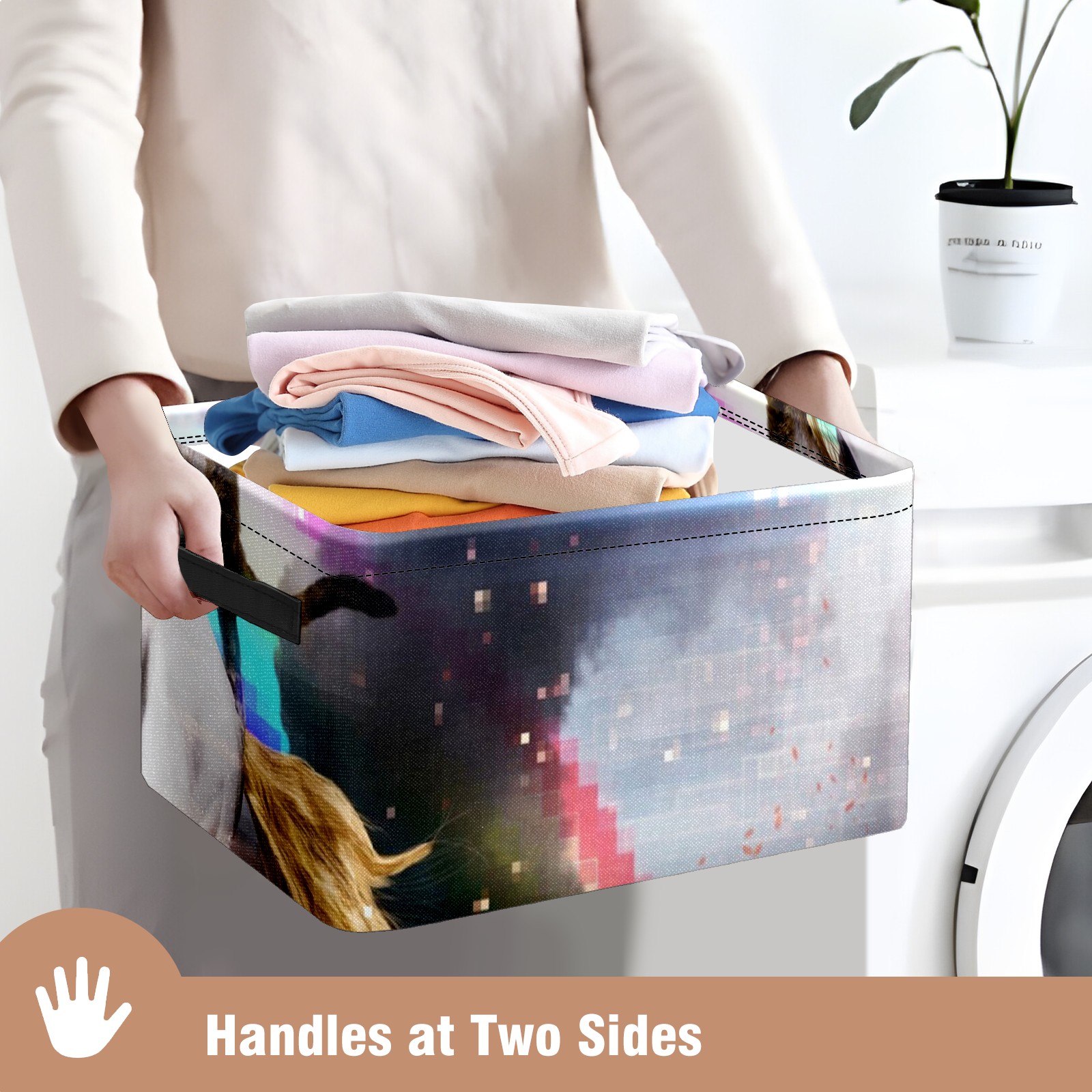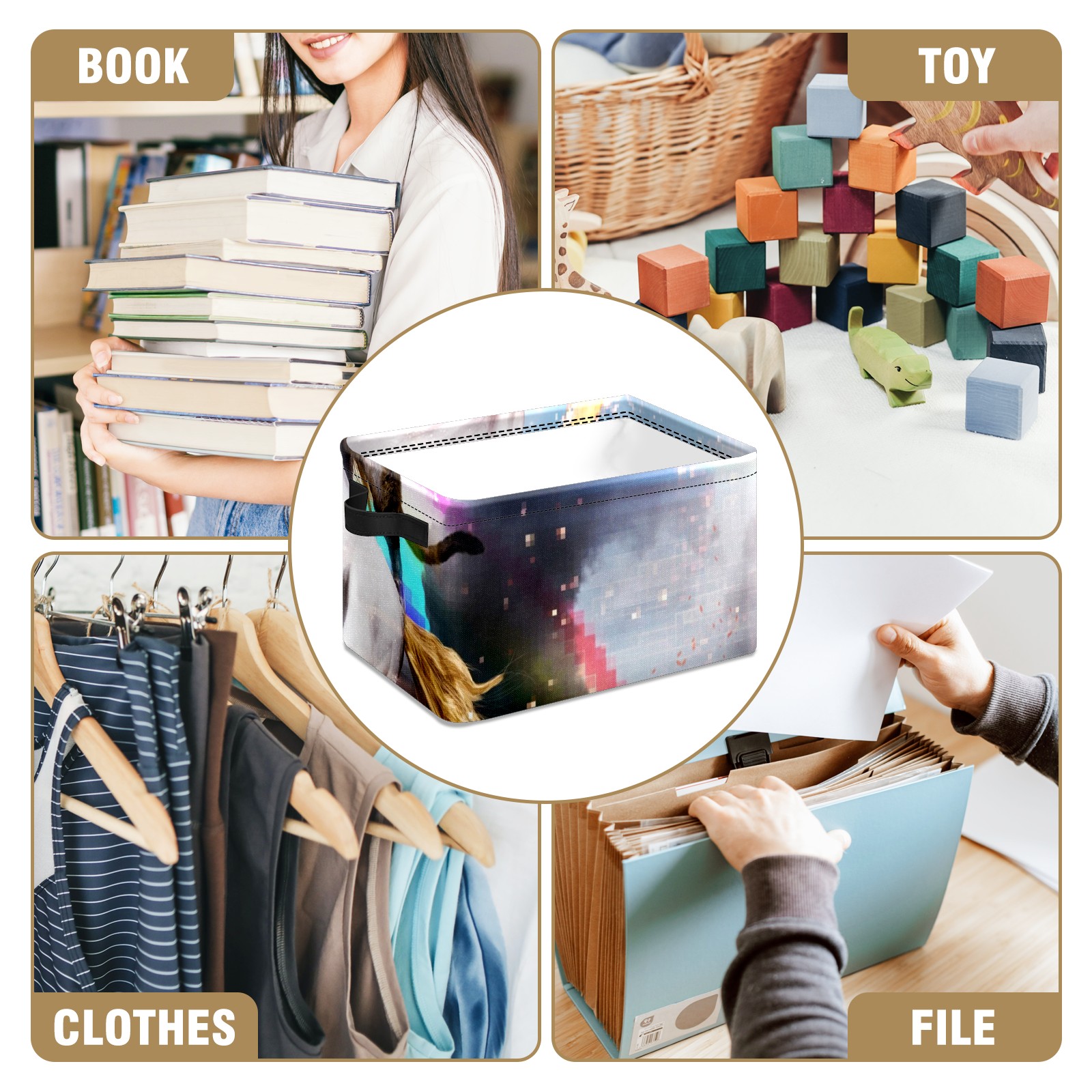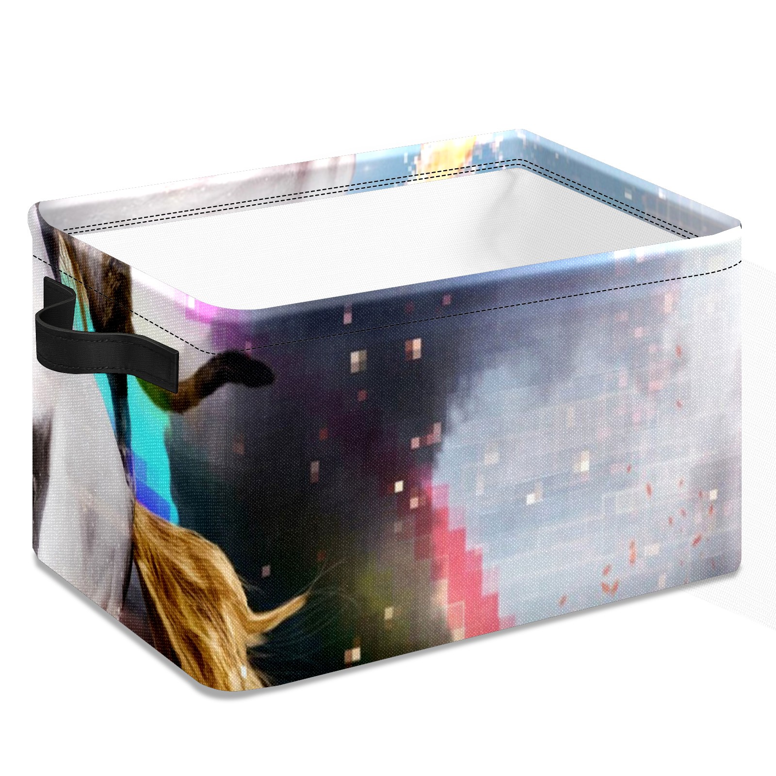Collapsible 600D Oxford Storage Basket with Fantasy Cat Riding A Unicorn - Metal Frame 10"x14"x8" Reinforced Handles, Multi-Purpose Organizer