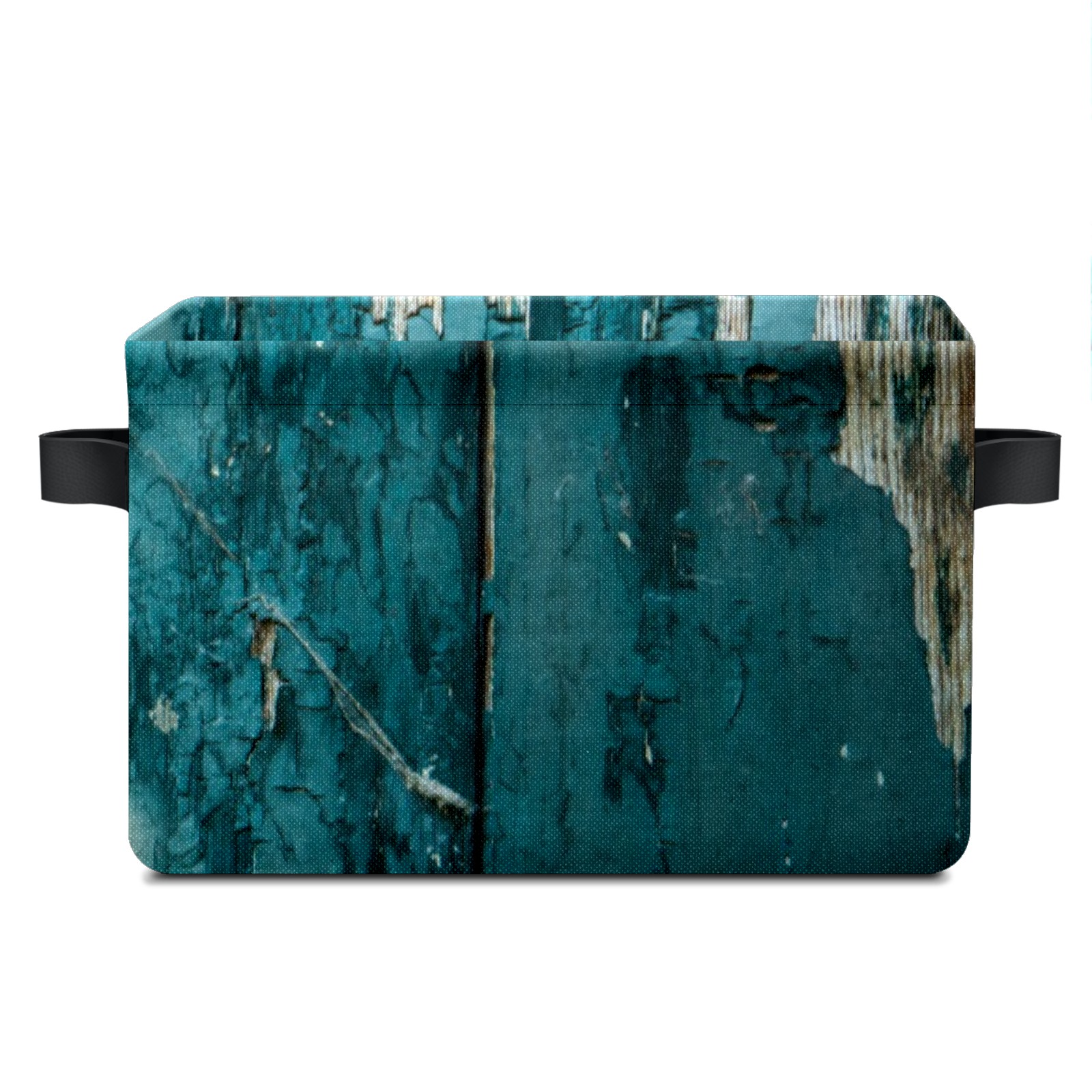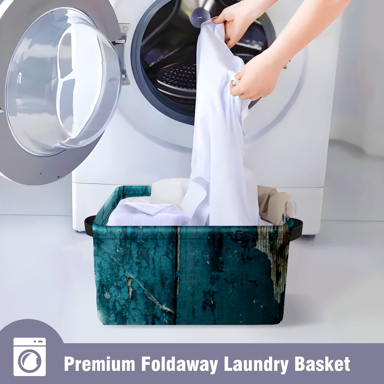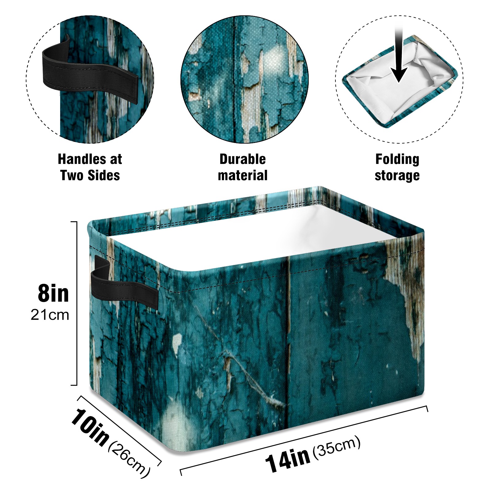 Collapsible 600D Oxford Storage Basket with Rustic Distressed Teal Green Barn Wood Print - Metal Frame 10"x14"x8" Reinforced Handles, Multi-Purpose Organizer