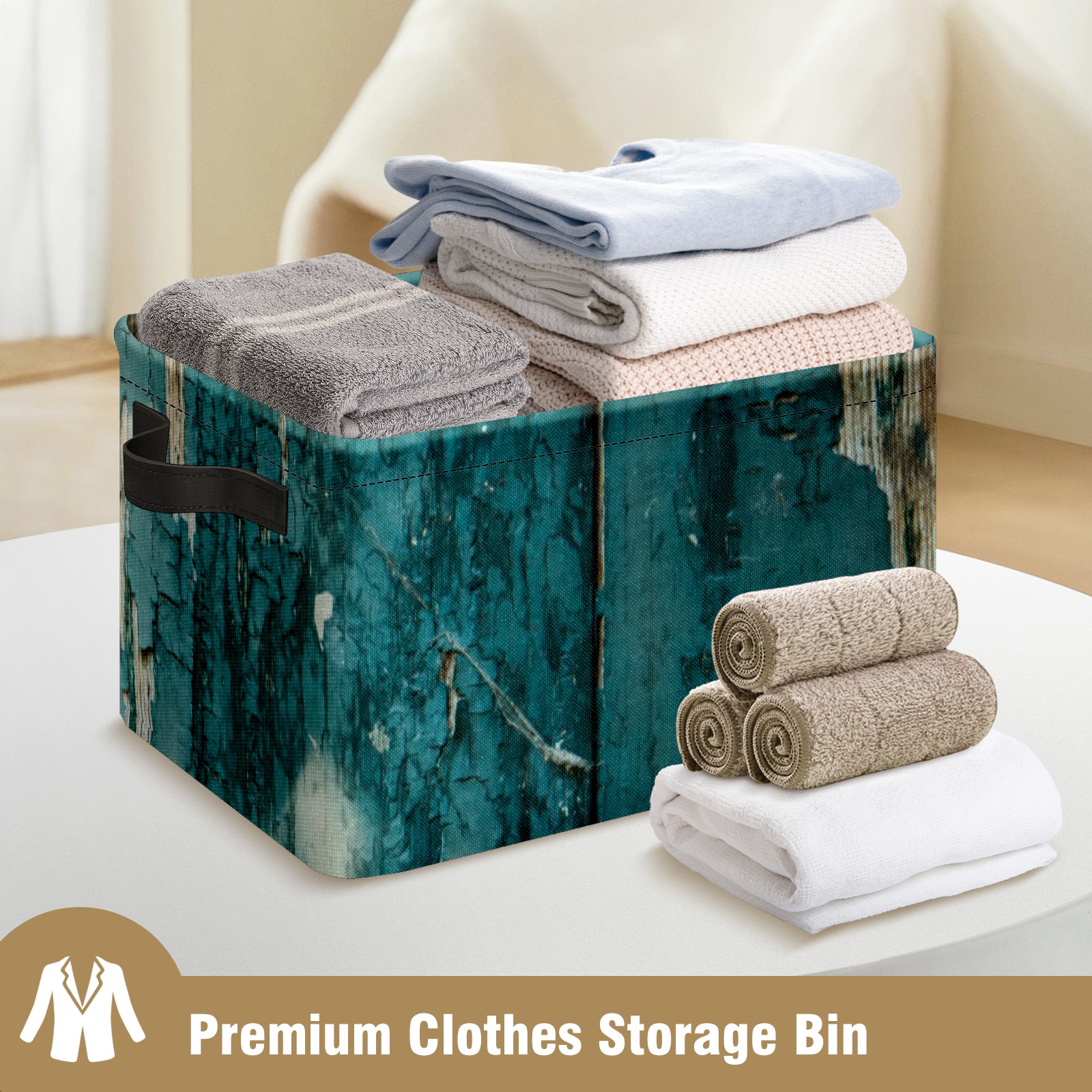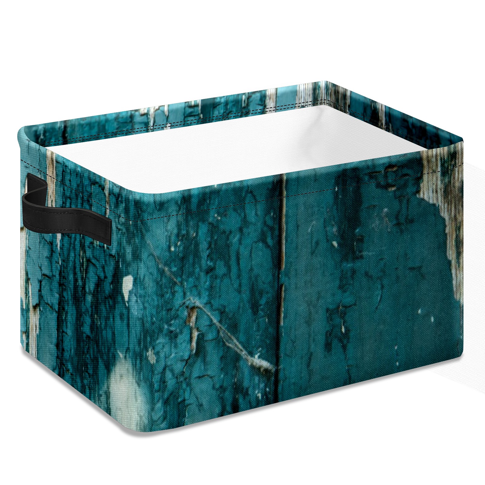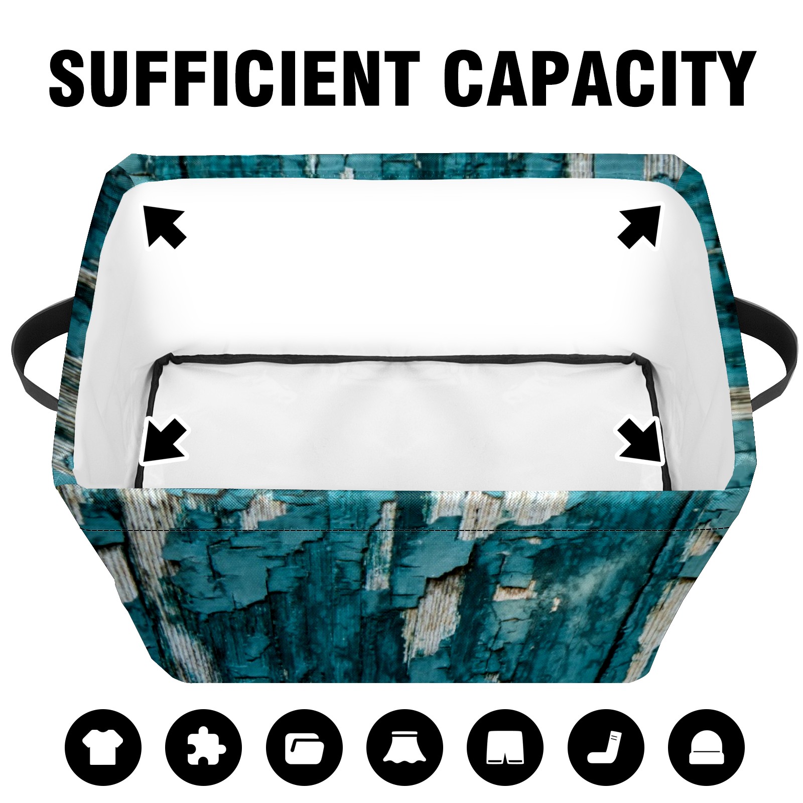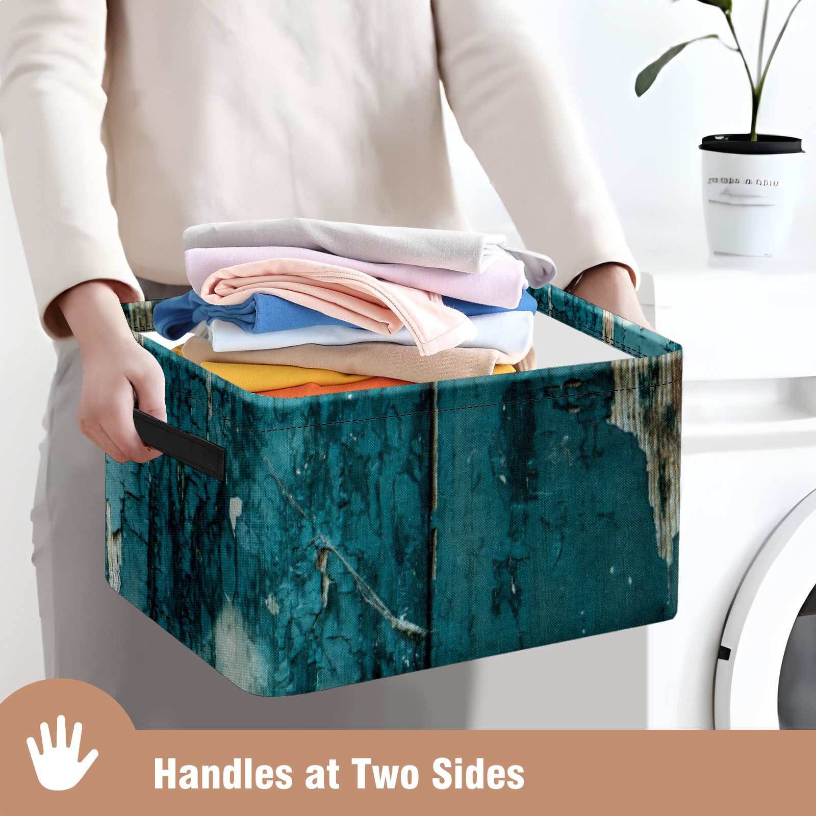 Collapsible 600D Oxford Storage Basket with Rustic Distressed Teal Green Barn Wood Print - Metal Frame 10"x14"x8" Reinforced Handles, Multi-Purpose Organizer