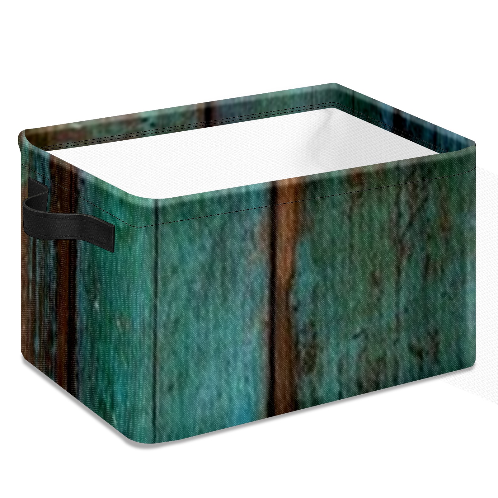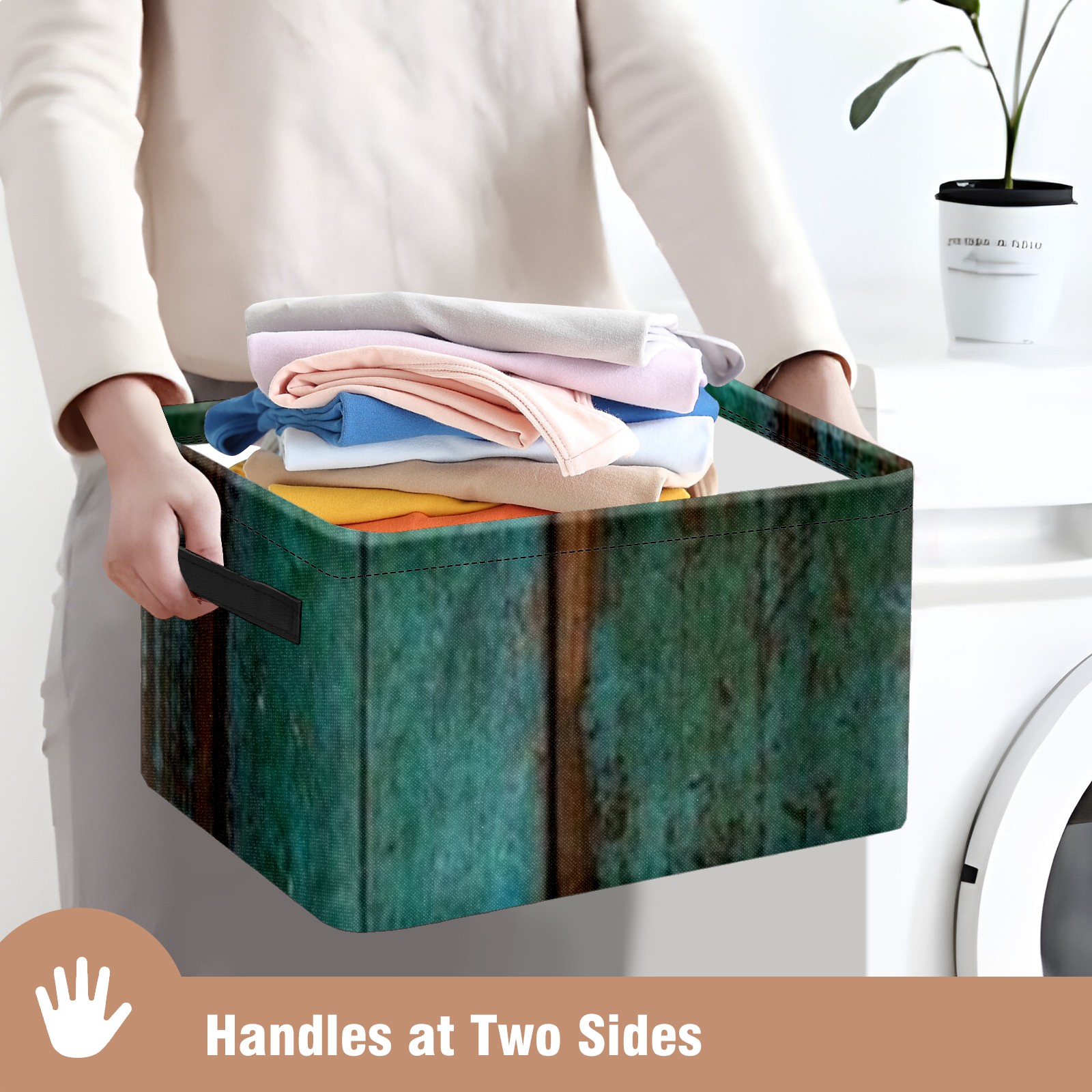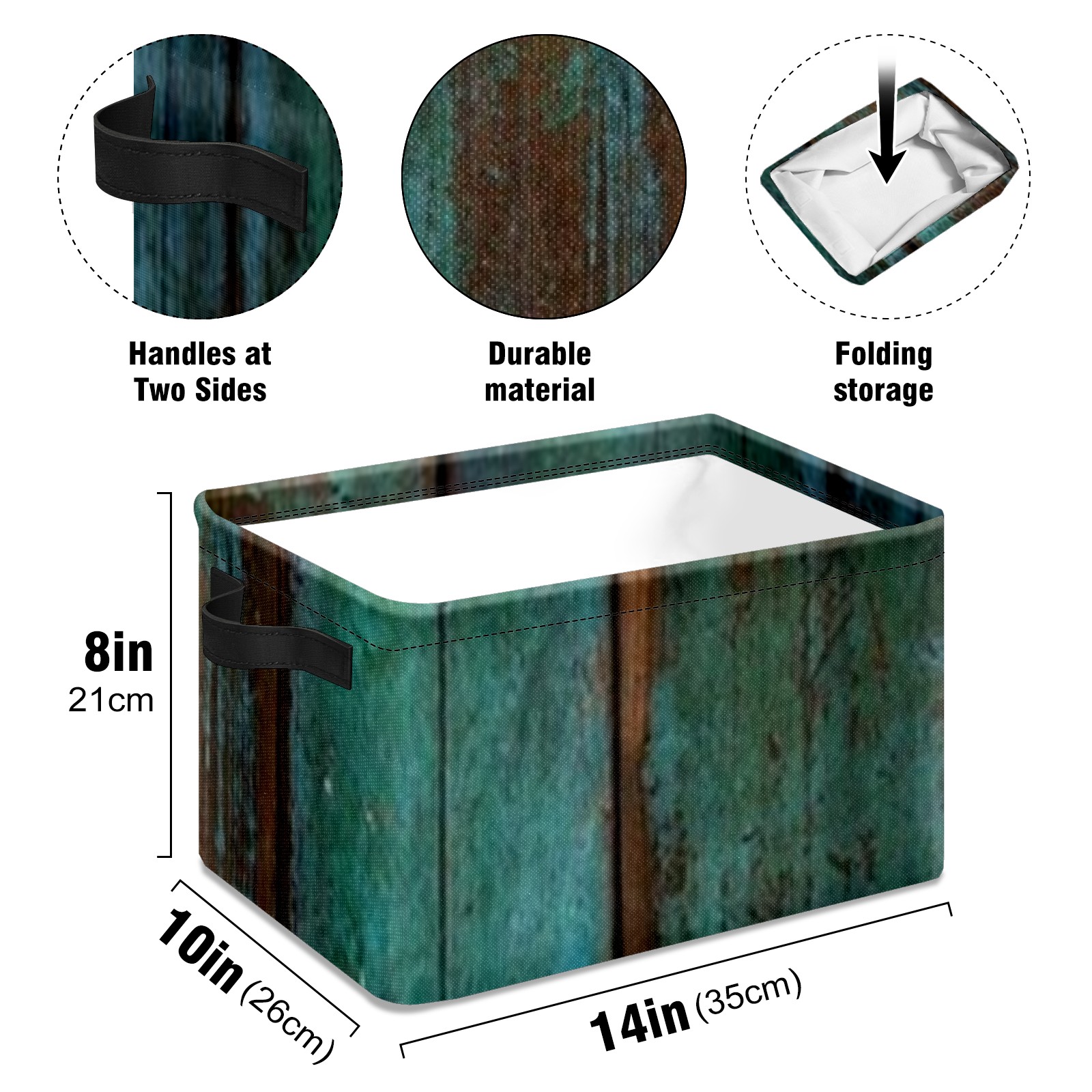 Collapsible 600D Oxford Storage Basket with Rustic Distressed Teal Green - Metal Frame 10"x14"x8" Reinforced Handles, Multi-Purpose Organizer