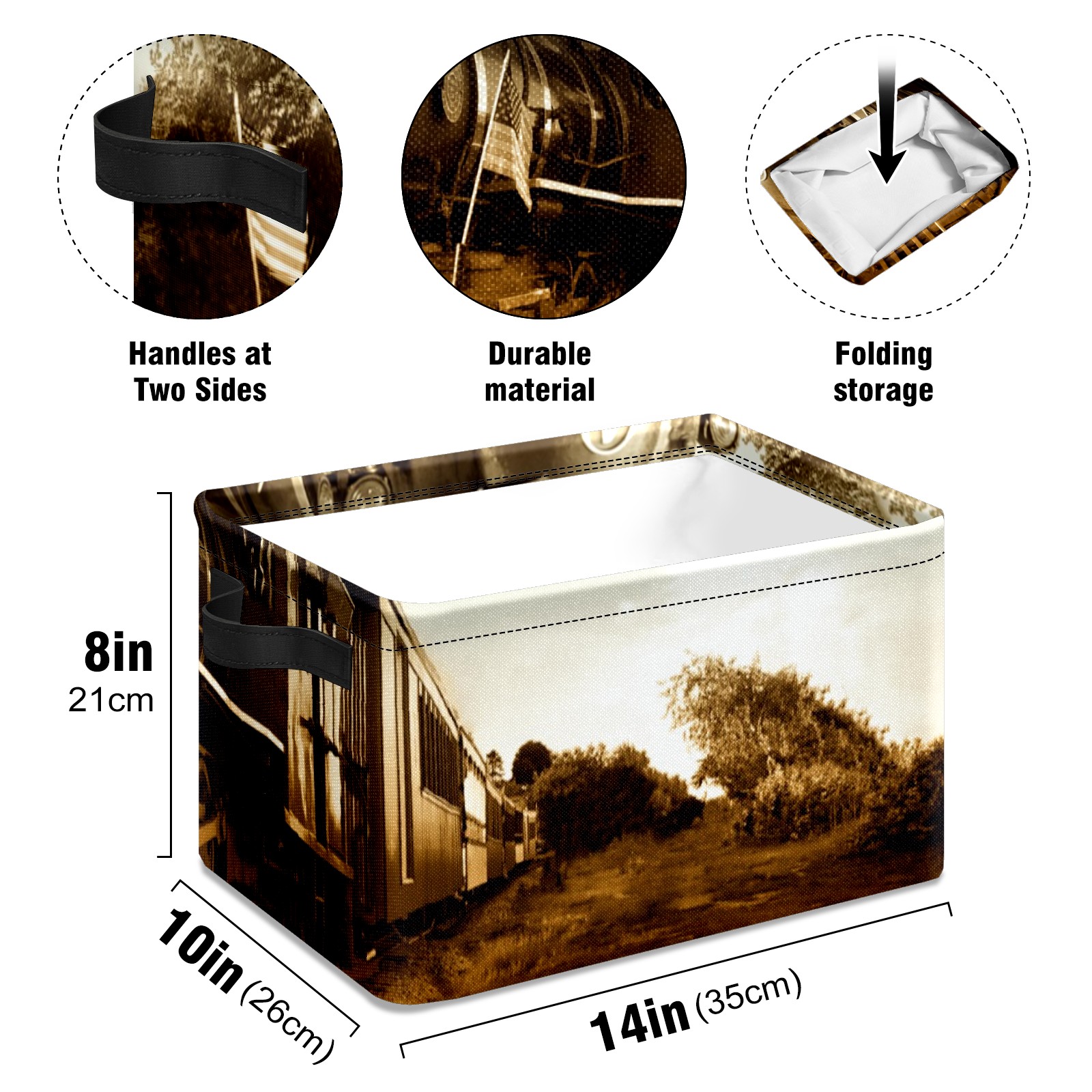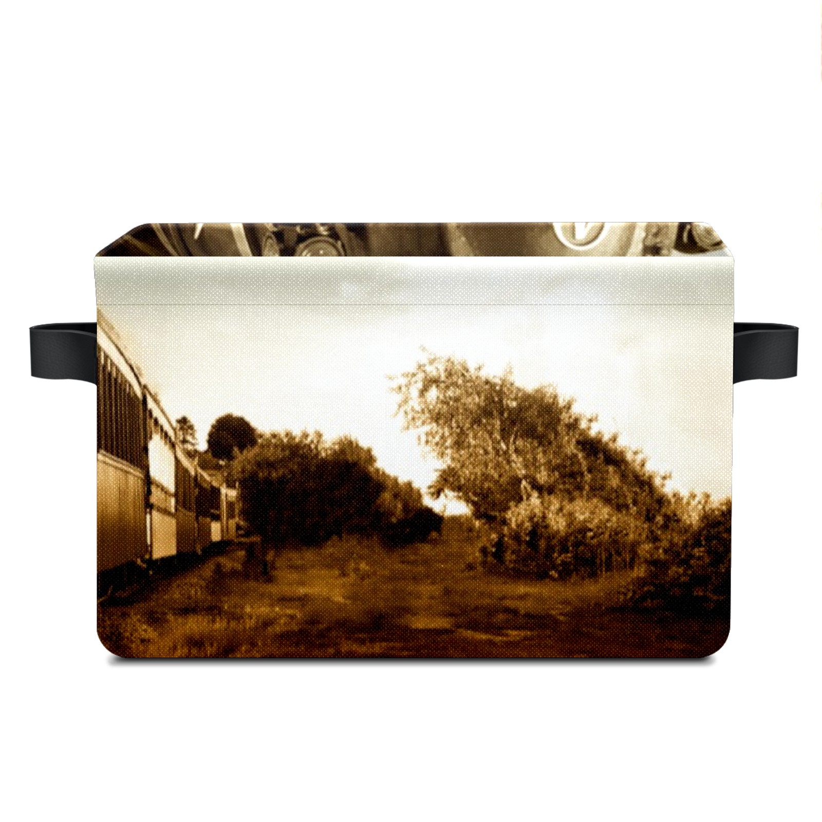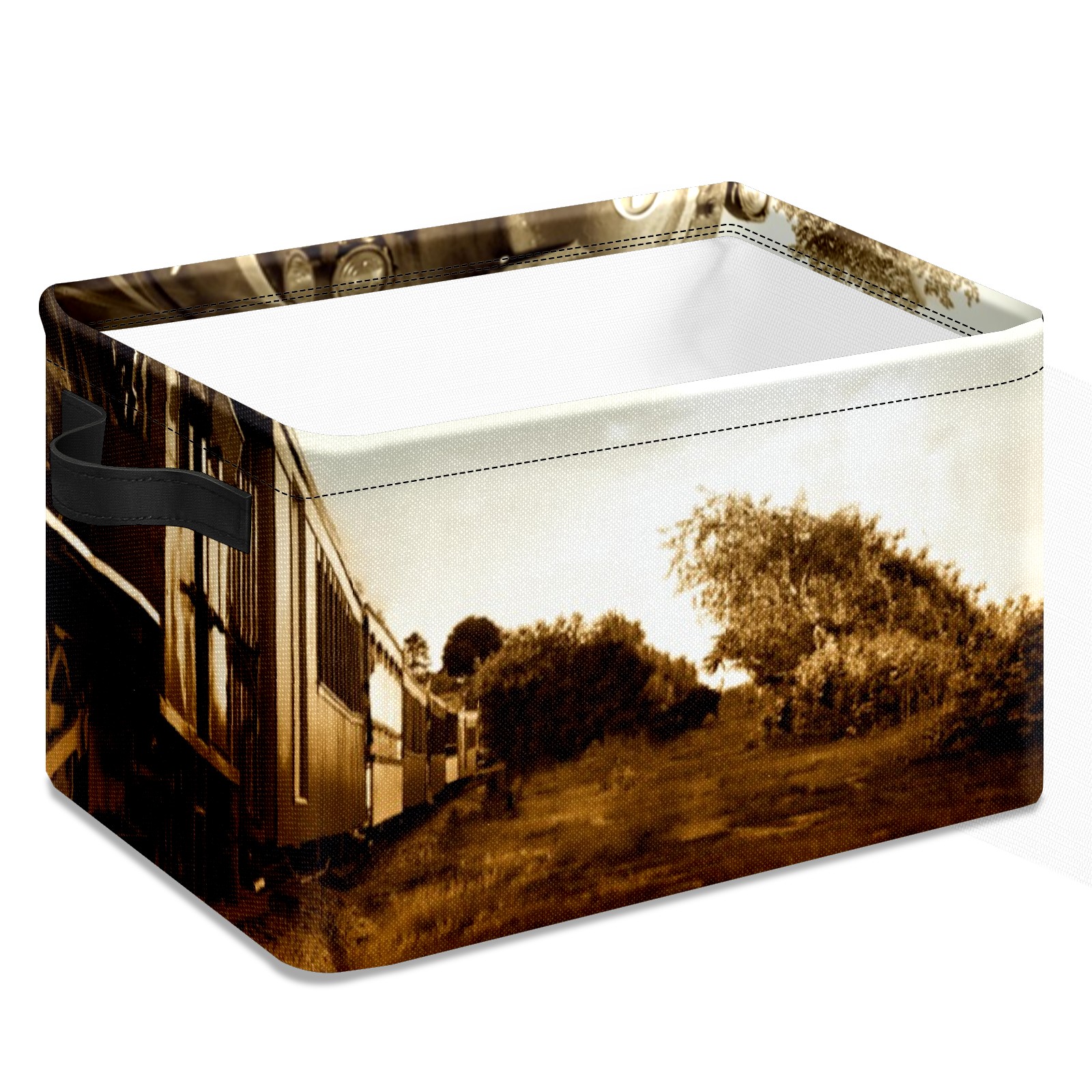 Collapsible 600D Oxford Storage Basket with Train Pattern - Metal Frame 10"x14"x8" Reinforced Handles, Multi-Purpose Organizer