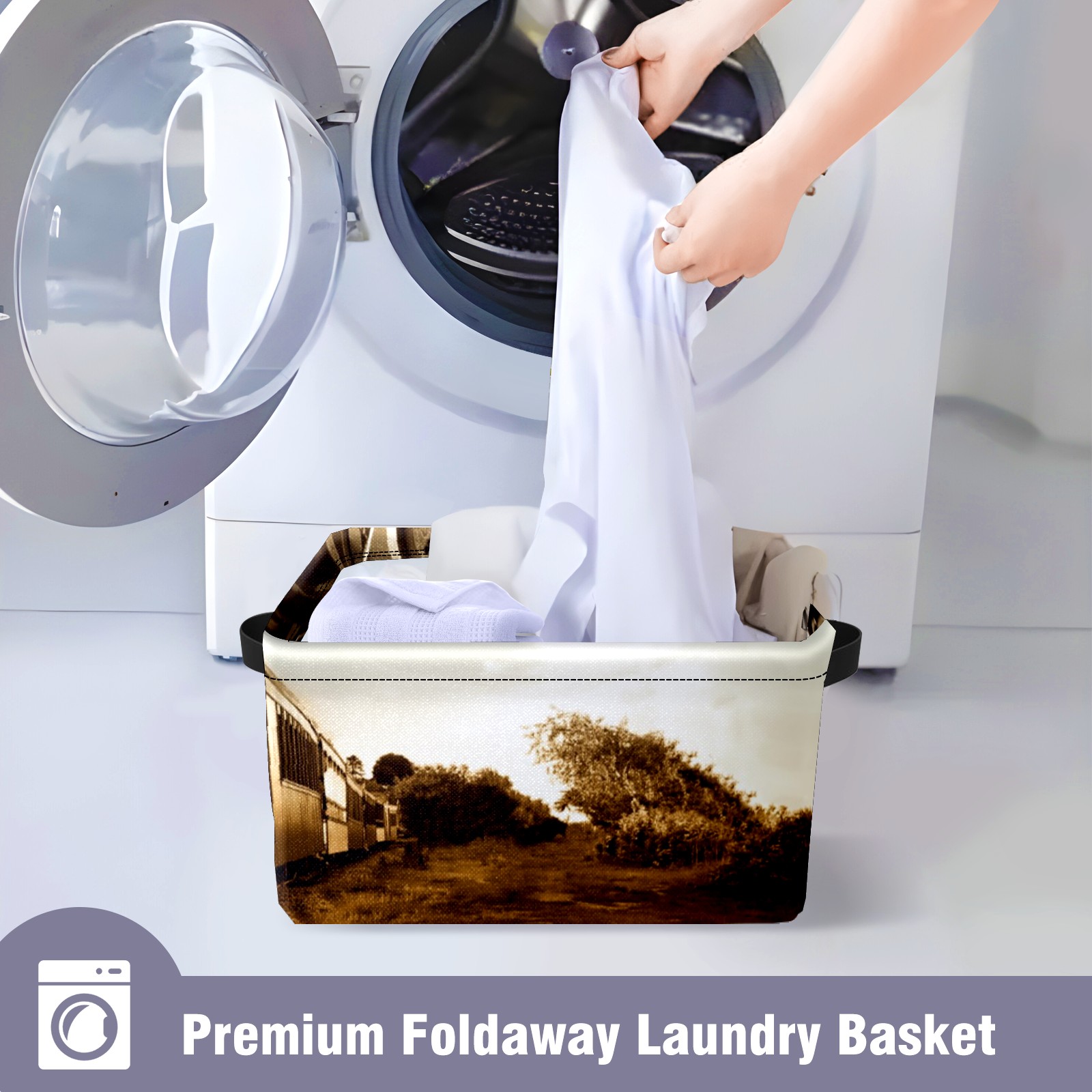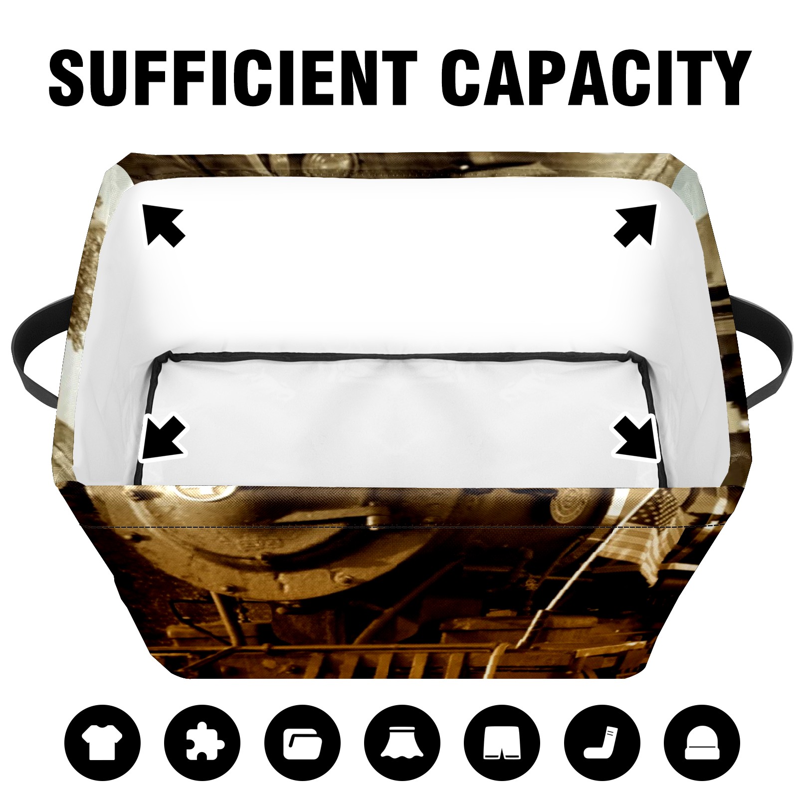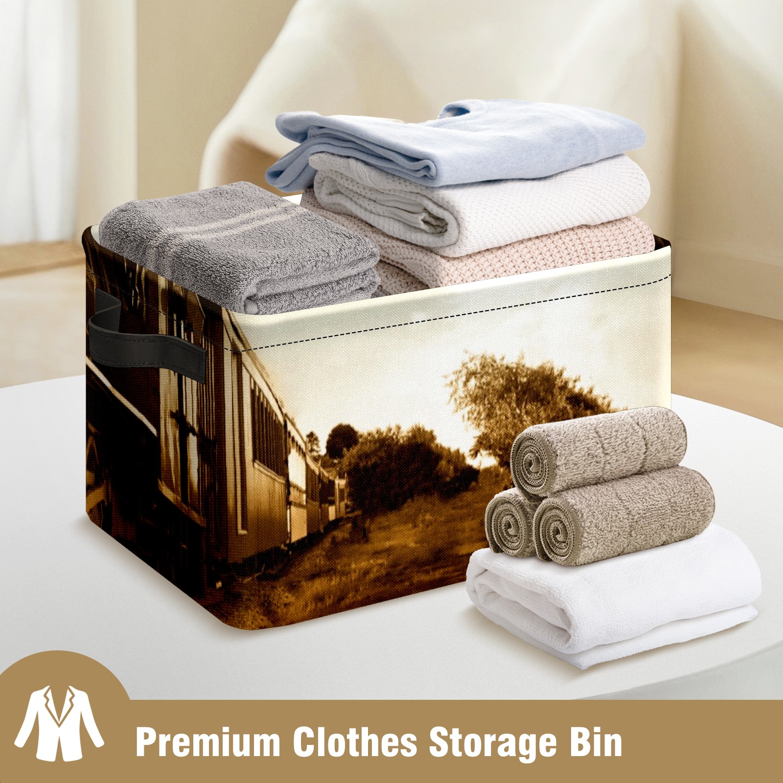 Collapsible 600D Oxford Storage Basket with Train Pattern - Metal Frame 10"x14"x8" Reinforced Handles, Multi-Purpose Organizer