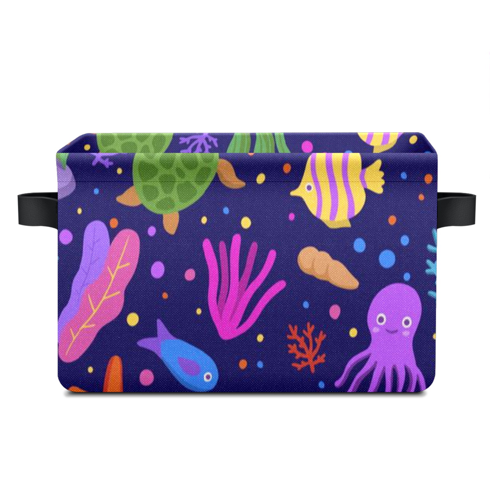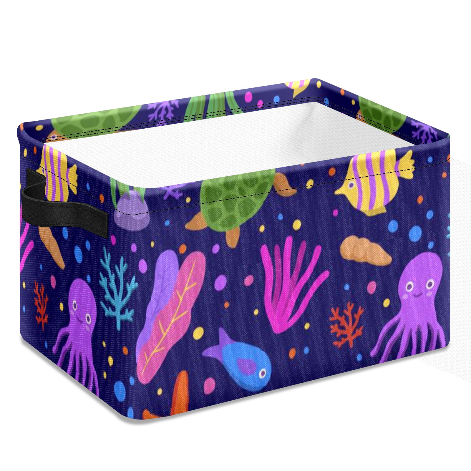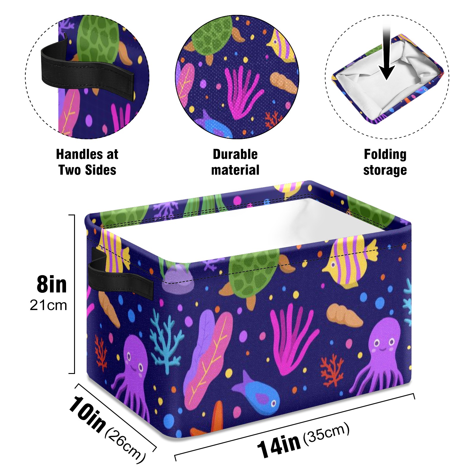 Collapsible 600D Oxford Storage Basket with Cartoon Octopus Turtle Coral - Metal Frame 10"x14"x8" Reinforced Handles, Multi-Purpose Organizer
