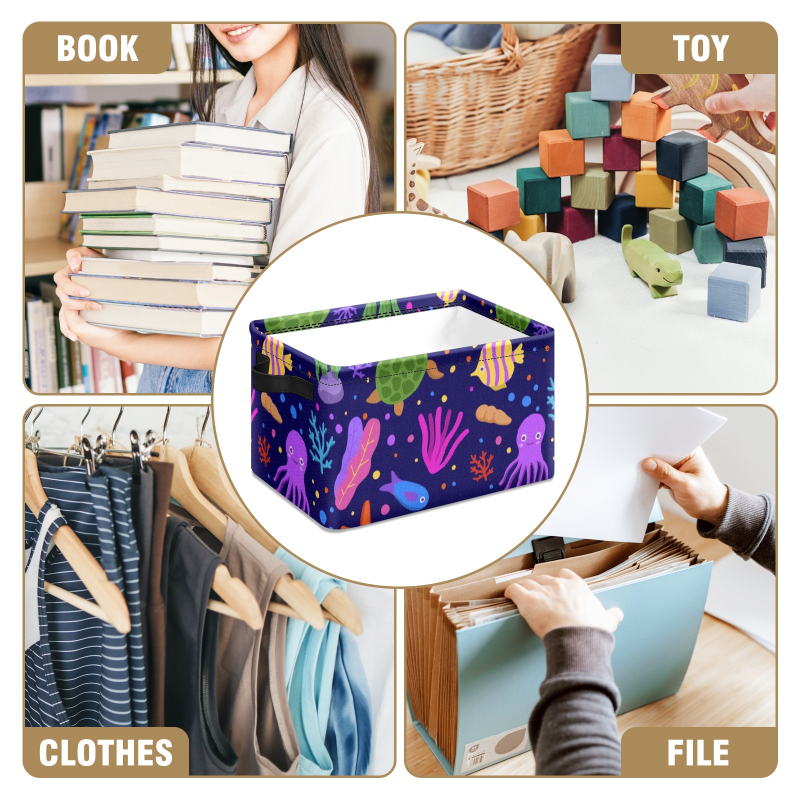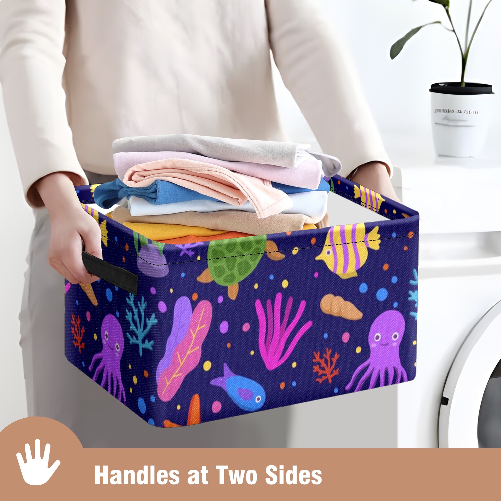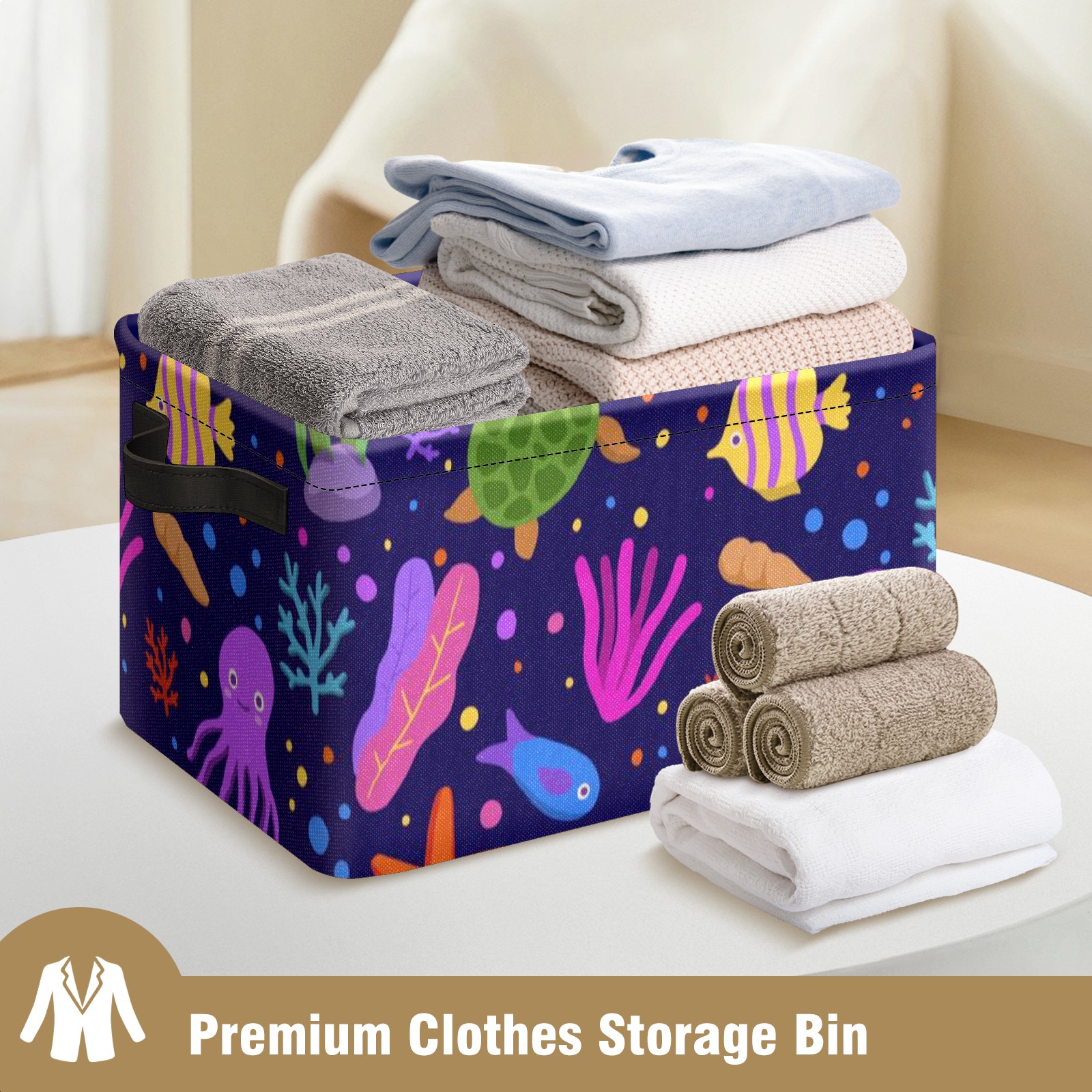 Collapsible 600D Oxford Storage Basket with Cartoon Octopus Turtle Coral - Metal Frame 10"x14"x8" Reinforced Handles, Multi-Purpose Organizer